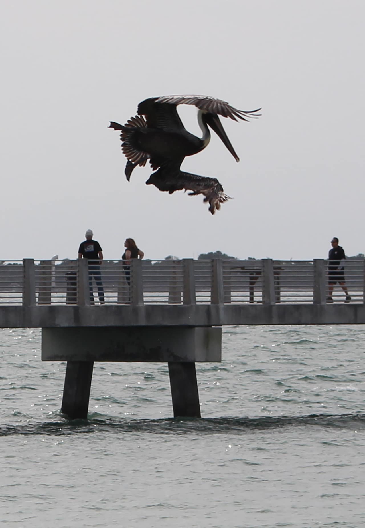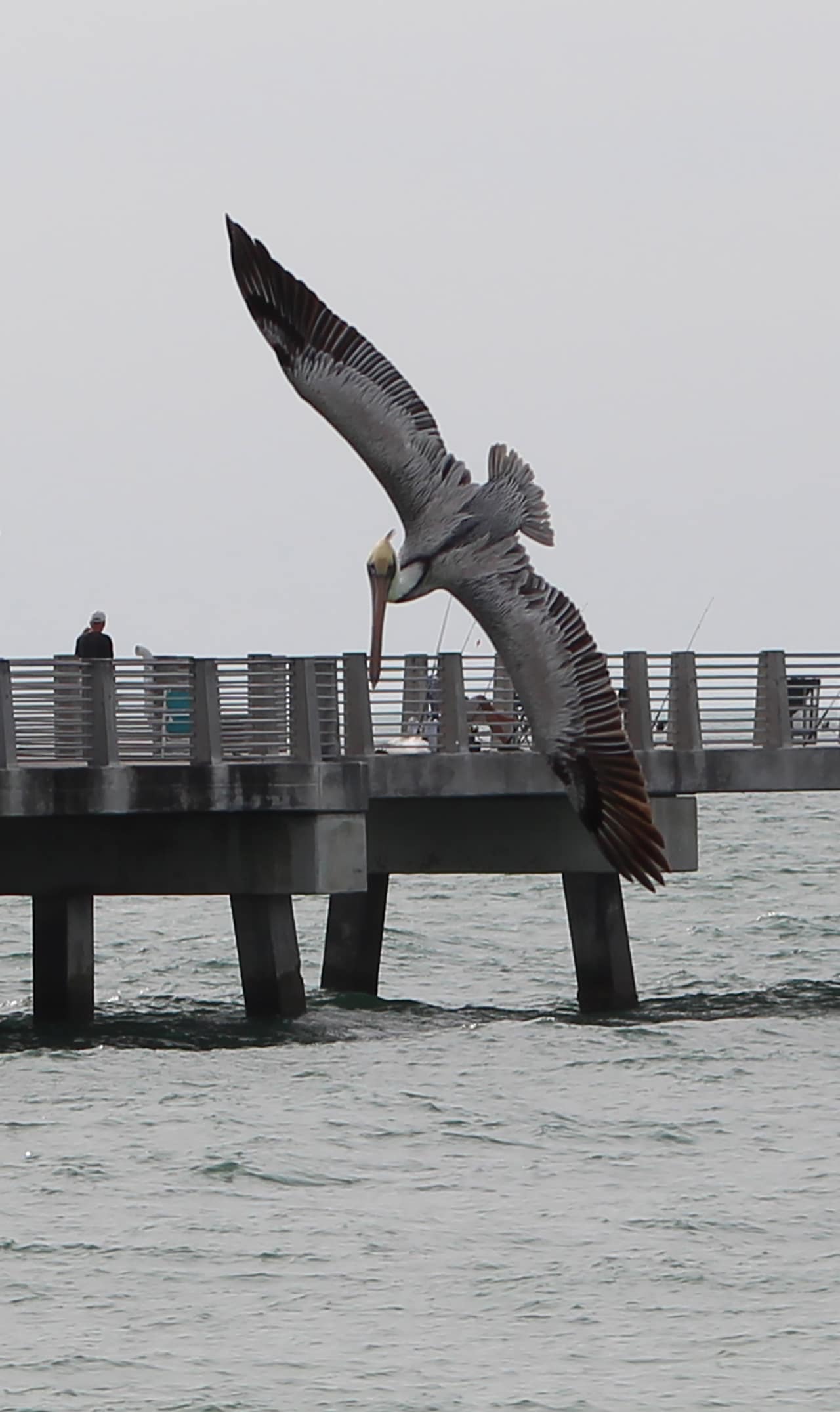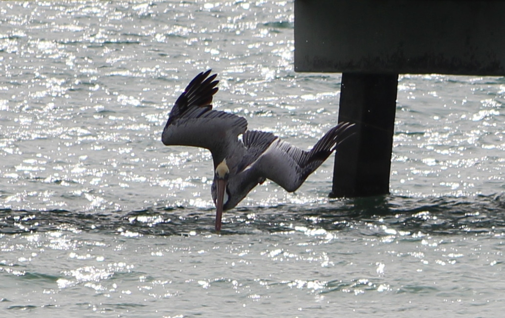 We found a shorter pier and had some great views of the sparkling water for a while, until we were left with a pretty grey day. When we first arrived there were only a few birds around, but someone must have rung the dinner bell, because it wasn’t long before chow was ON! What I found was that pelicans are quite the contortionists as they dive for their dinner, and some of these pictures just cracked me up.