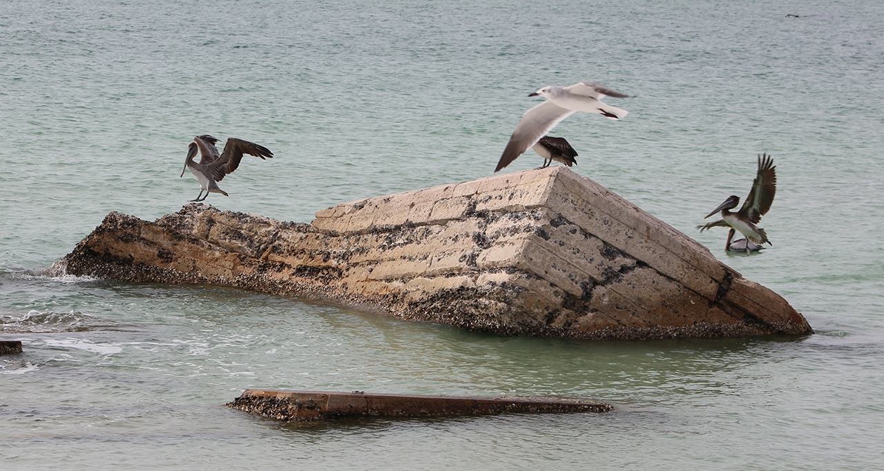 A partially submerged pier or something concrete created some interest and a landing spot to rest. Could this be the remains of Battery Bigelow that collapsed into the Gulf of Mexico?