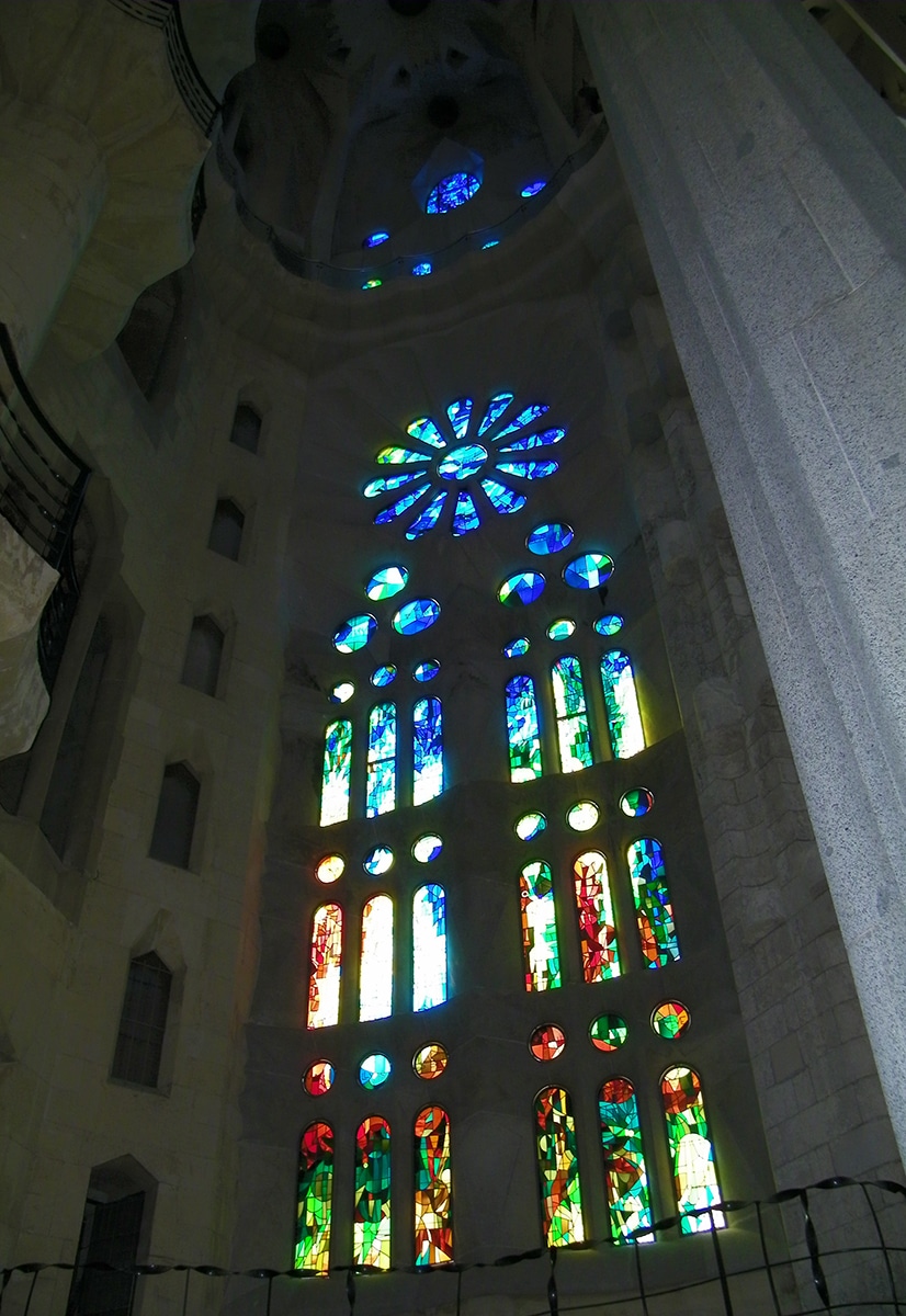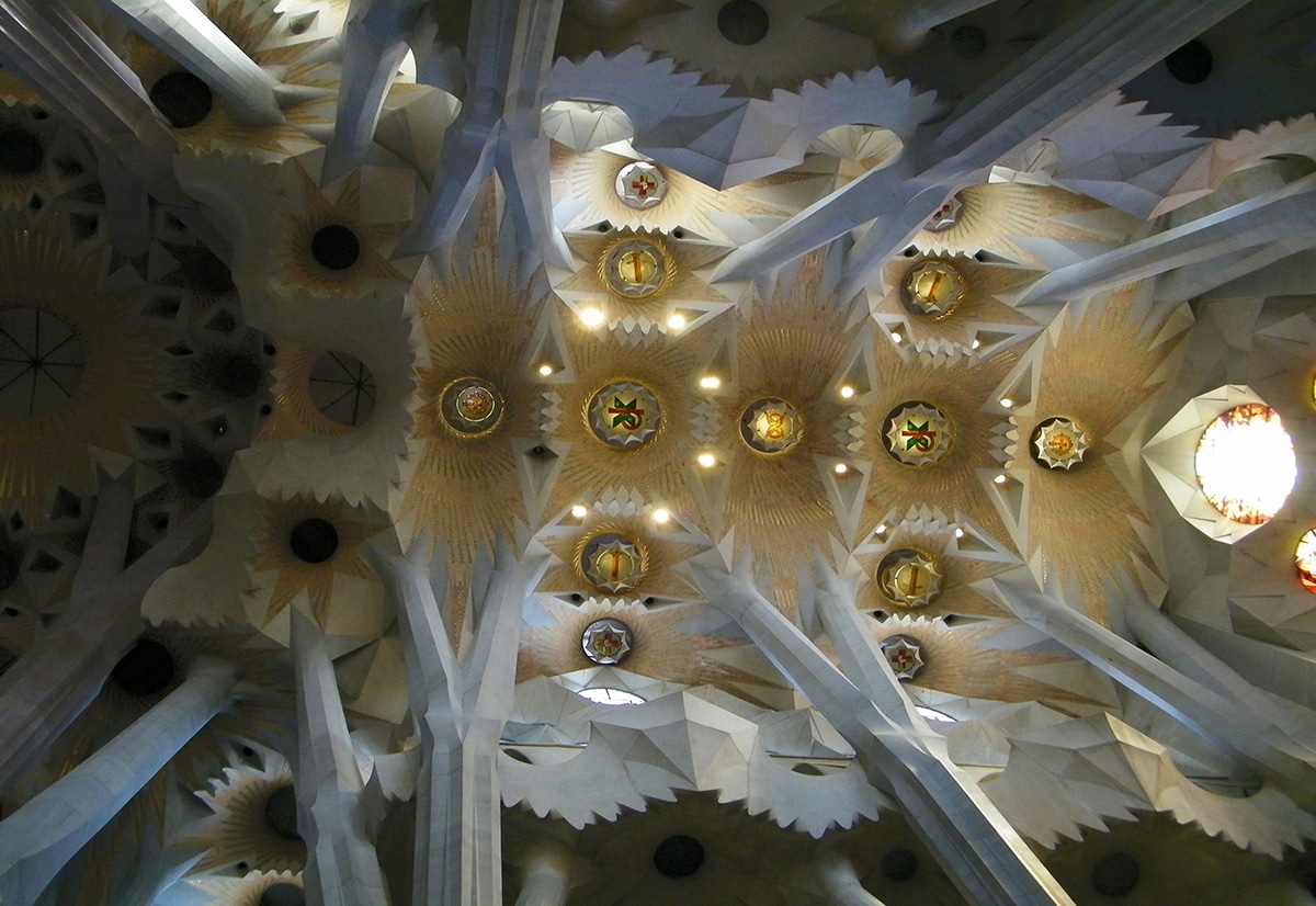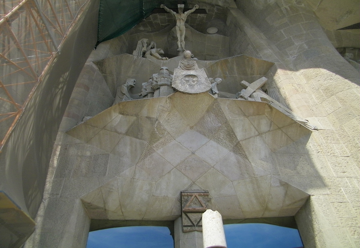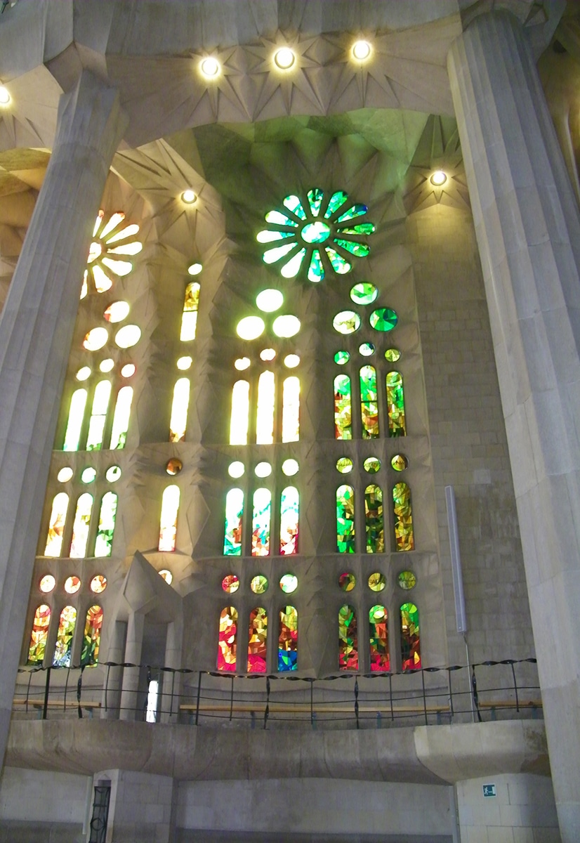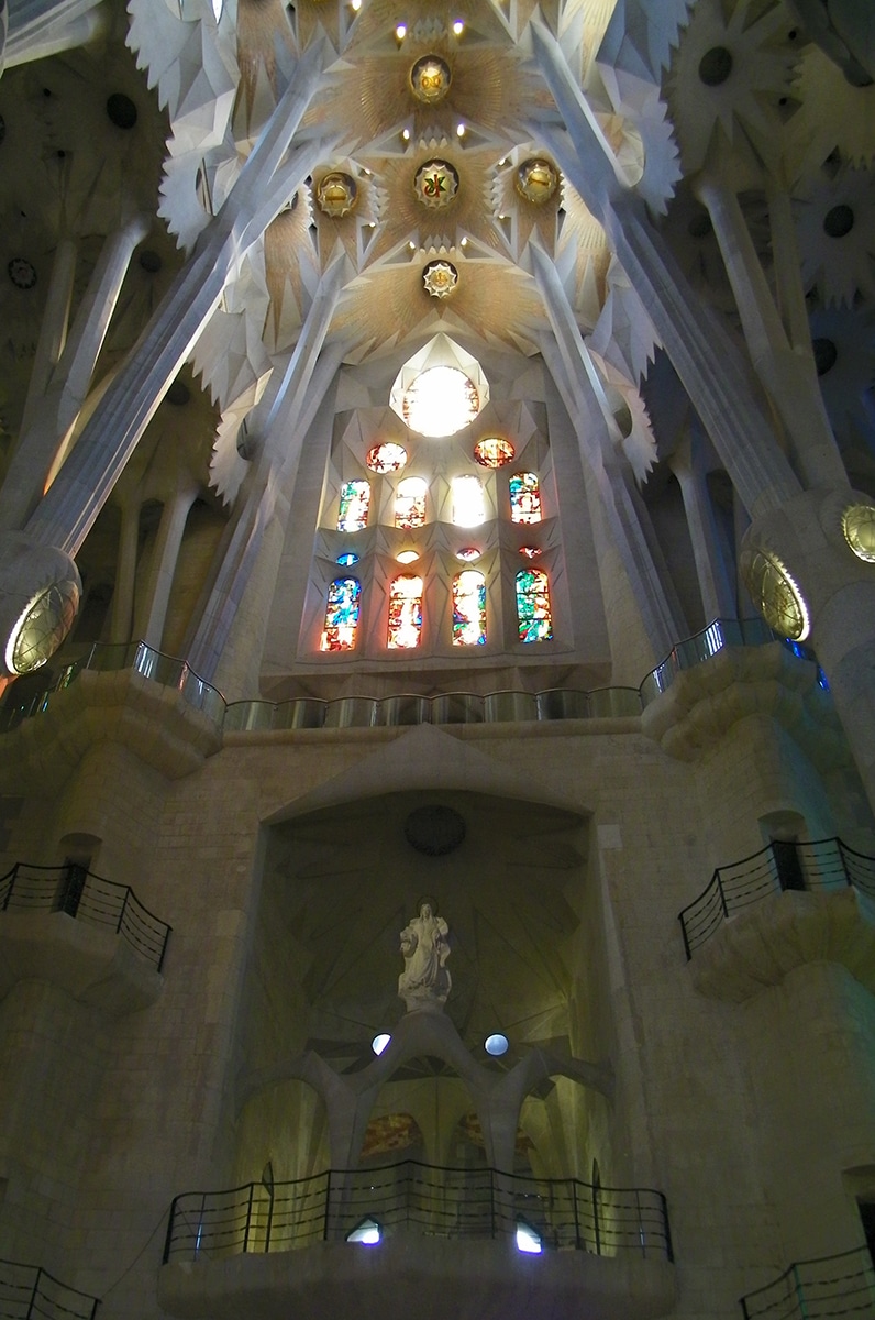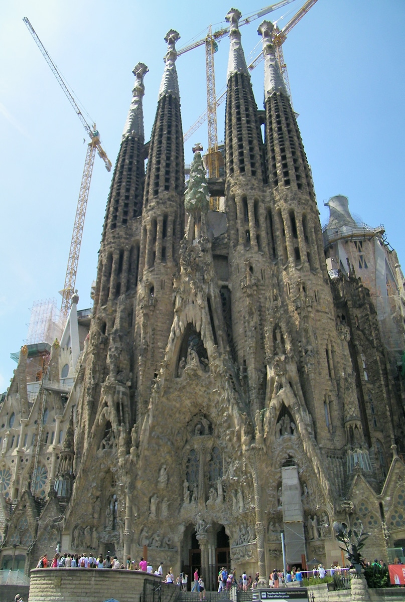 “The Expiatory Temple of the Sagrada Familia is a church with a central nave flanked by four aisles, and transepts with a central nave flanked by two aisles, forming a Latin cross. The top of the cross is closed by the semi-circular apse. The basilica also has three monumental facades, each one representing one of the three crucial events of Christ’s existence: his birth (C/Marina); his Passion, Death and Resurrection (C/Sardenya); and his present and future Glory (C/Mallorca).