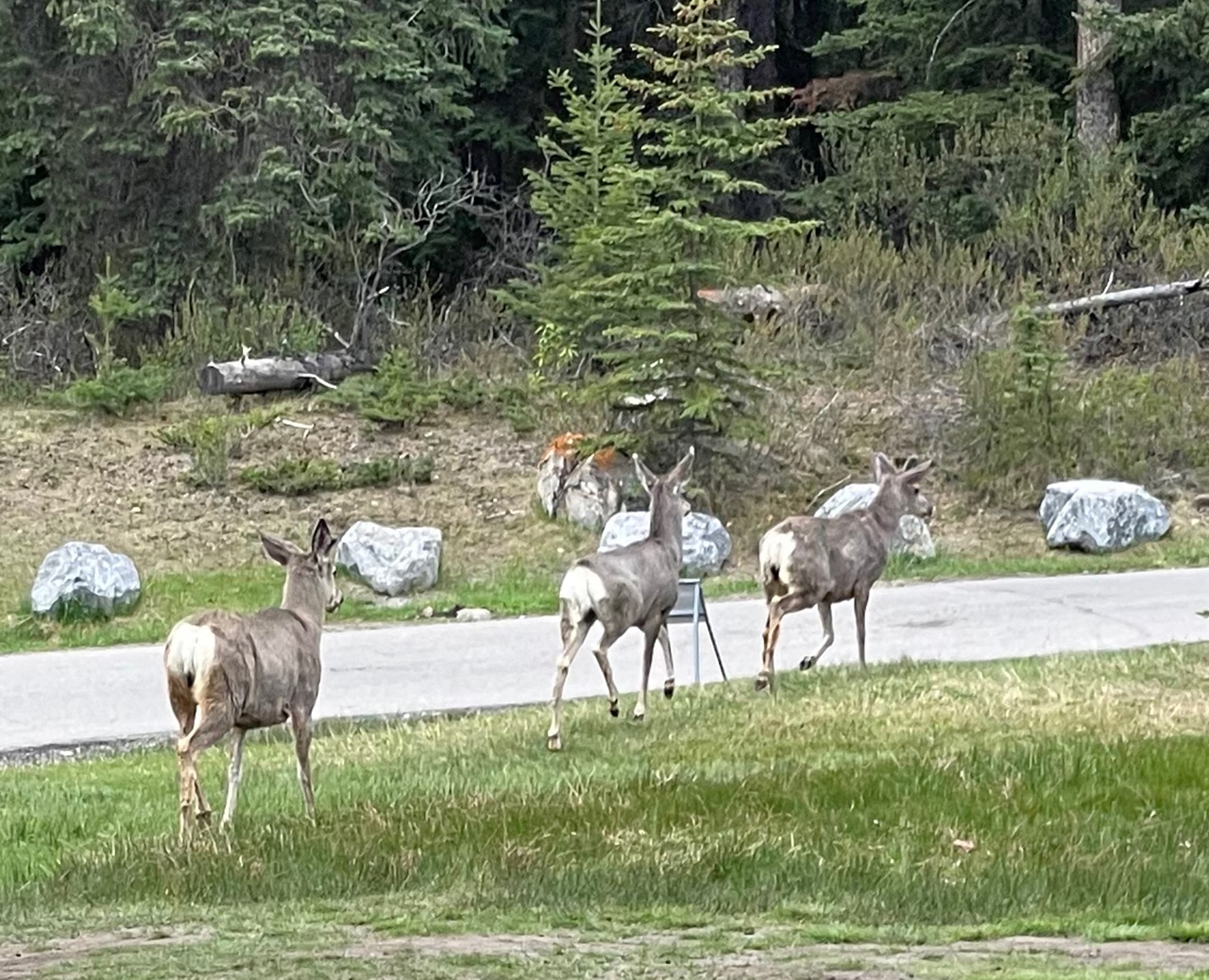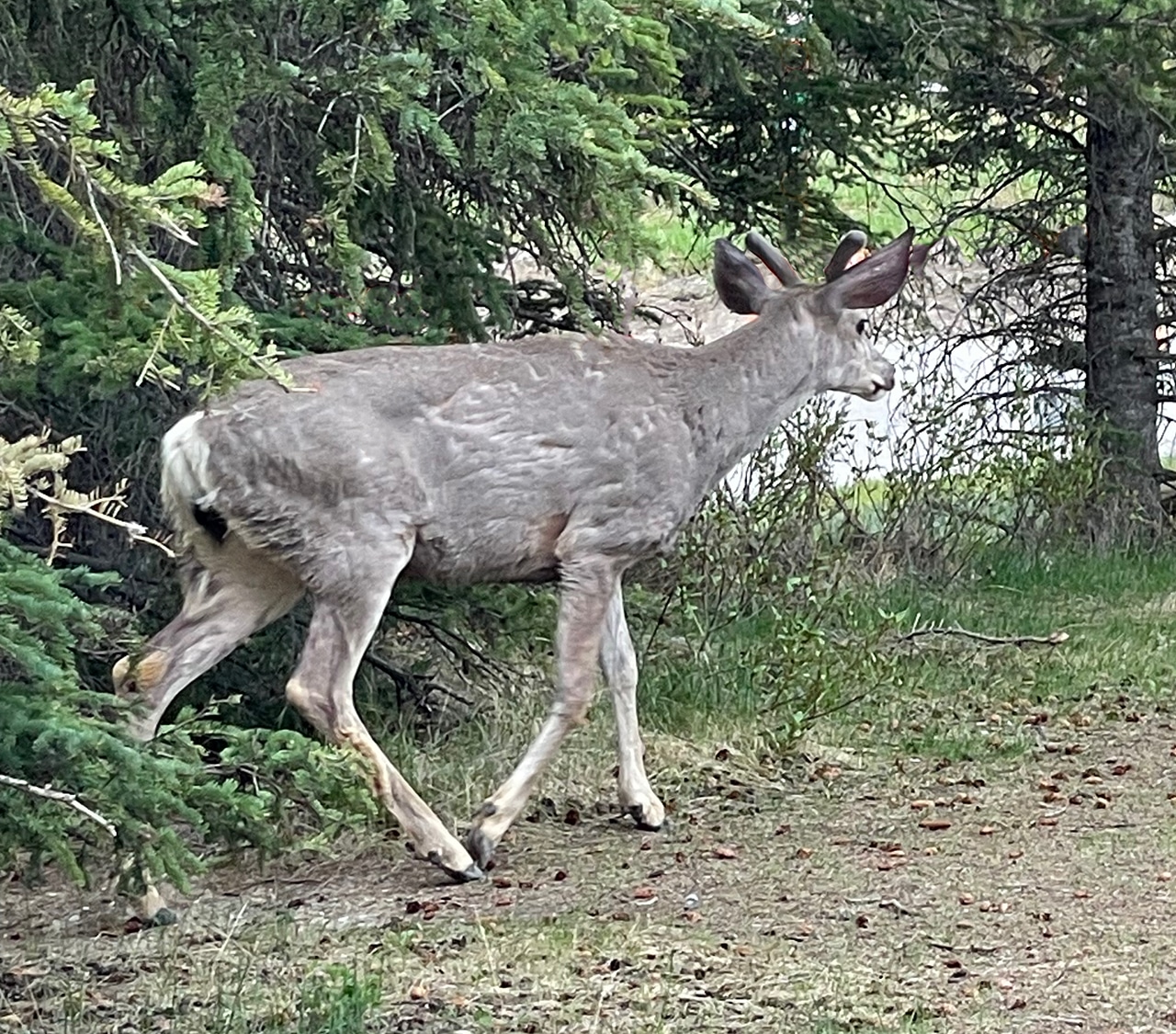 Immediately when we pulled into the parking lot at Two Jack, three mule deer made a quick entrance – and exit. Luckily I got a close-up of one (with a zoom) to see its fuzzy antlers. This time of year they look a little scruffy when shedding their winter coats. Google says the biggest difference between white tails and mule deer besides their size (mulies are a little larger) are their behinds and tails, both of which are on display below. Also the mule deer’s ears are larger and more donkey-like.