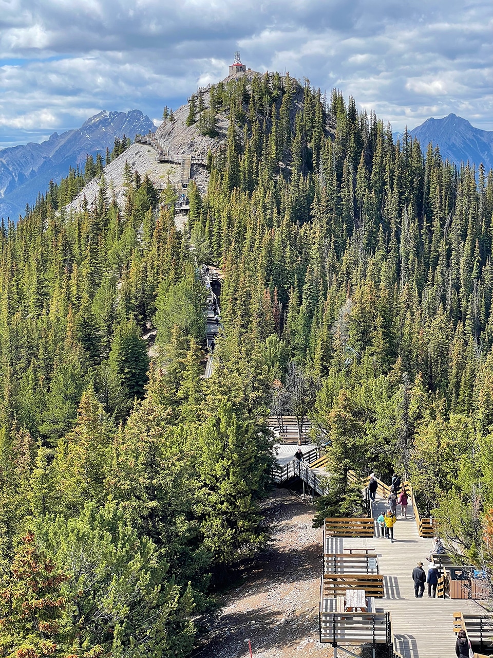 By now you probably know that Jim doesn’t like to drive on mountain roads that are on the edge, he doesn’t like rooftop views, and the thought of going up 2,300 feet in a small steel contraption made him queasy. I kept talking it up, telling him that there would be 360-degree views of the entire vicinity of Banff – everywhere we had visited over the last three days. A three-story observation deck up top had a restaurant, gift shop, and a world-class mountaintop discovery center.