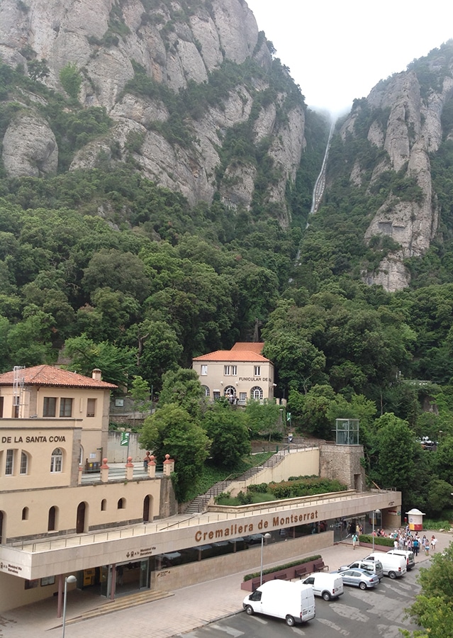 We took the Cremallera i funiculars de Montserrat (rack railway) to the top (and back down, obviously). If you look in the larger picture below, where the two mountains meet behind the station – that’s where we’re going! As you will see by the photo below in the center right, we will be traveling from 152m (just under 500 ft) to 700m (almost 2300 ft). “It is the only way to get to Montserrat that leaves you right in the middle of the monastery, a 15-minute journey with a privileged and spectacular view of the mountain.” There are other modes of transport that will take you higher and also lower on the mountain, but this is what our tour offered and it was perfect for the short time that we would be in this gorgeous place.