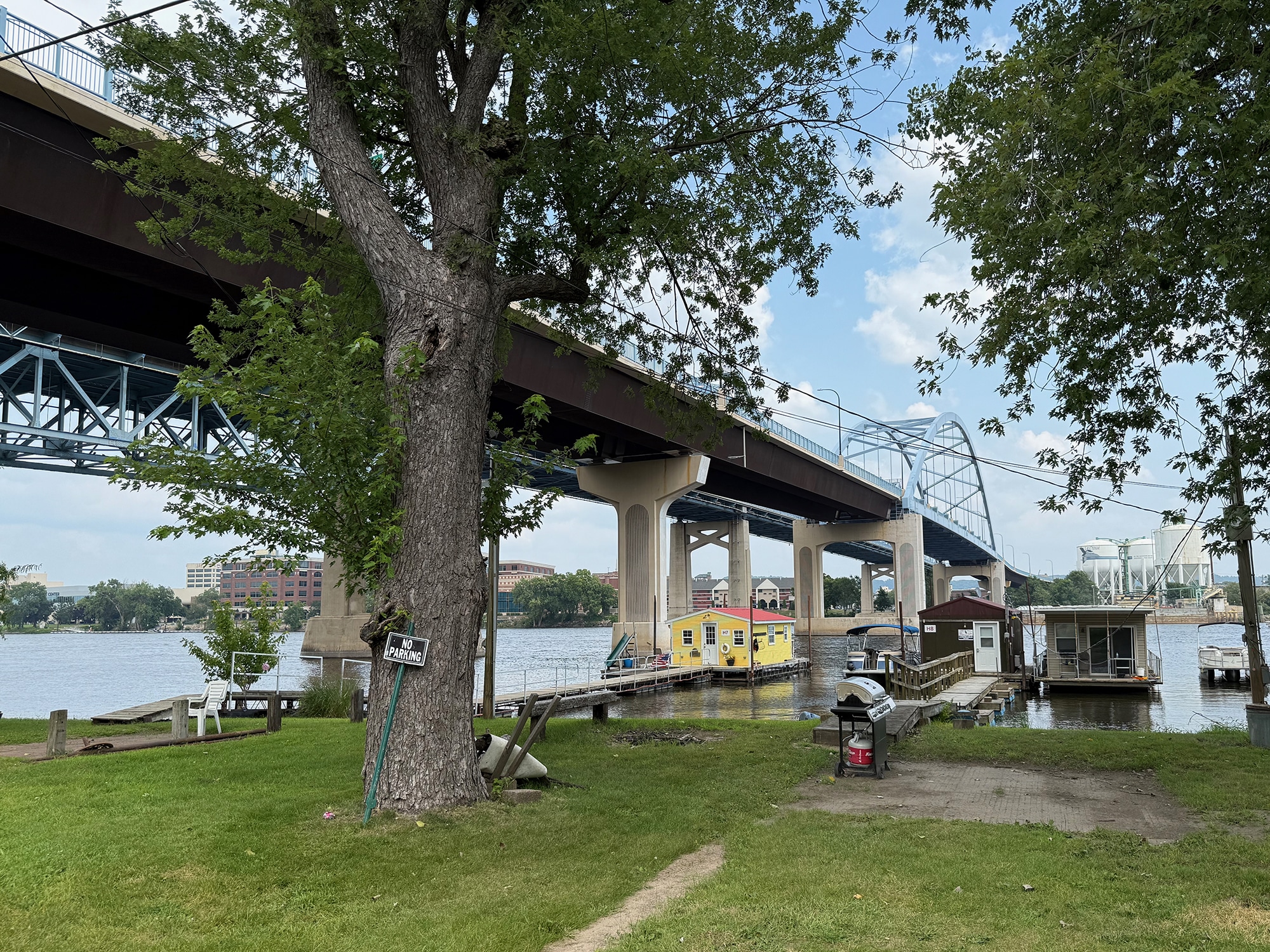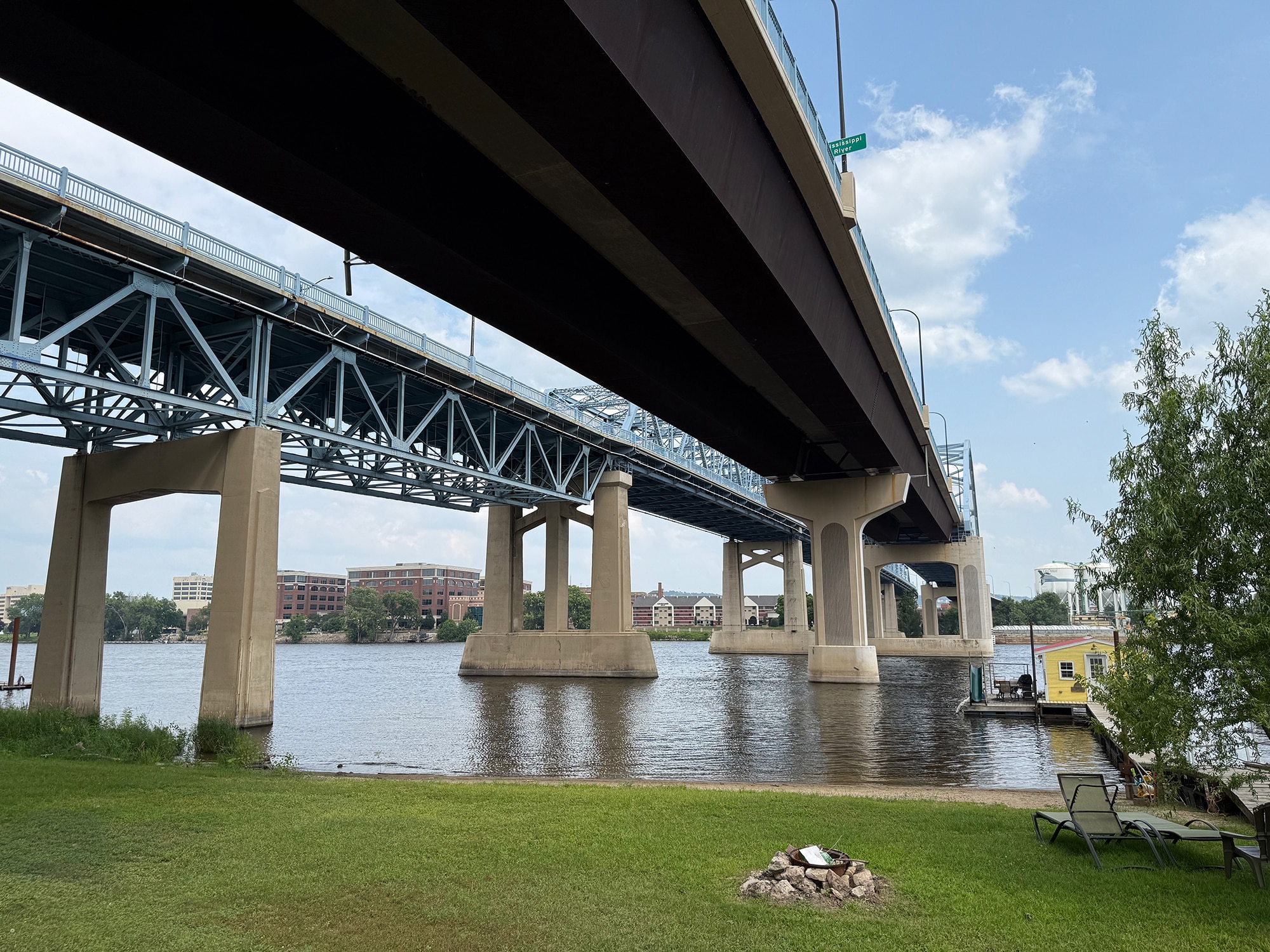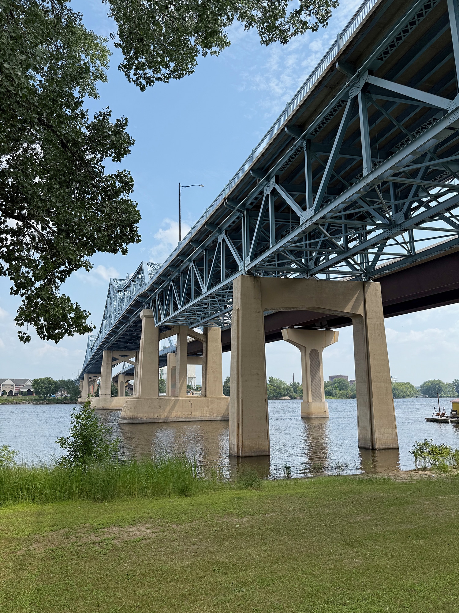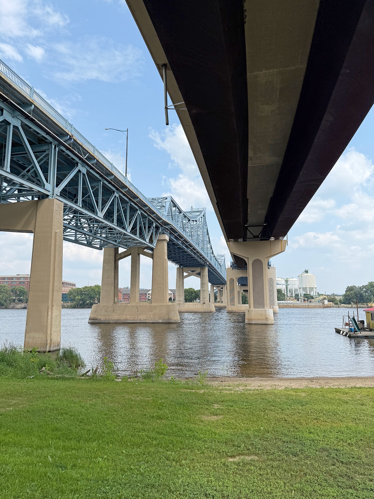 To get to our next stop, google directed us over the I90 ALT bridge. Since I first caught a glimpse of this bridge from Riverside Park, it has been calling my name. I thought it was odd that google didn’t give us a “Welcome to [another state]” prompt halfway across the bridge like with other bridges over the Mississippi, but I didn’t think much of it. The first exit and first turn brought us back close to the river and UNDER the bridge!
