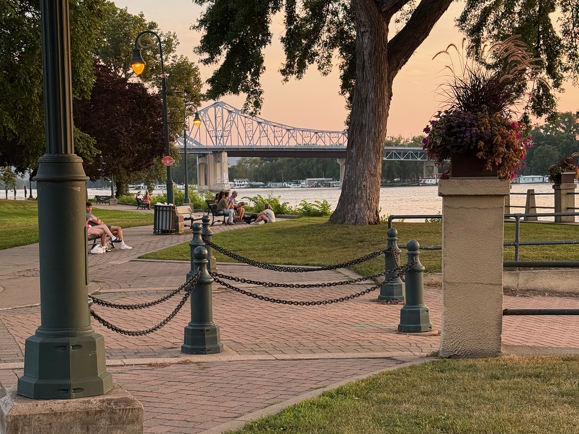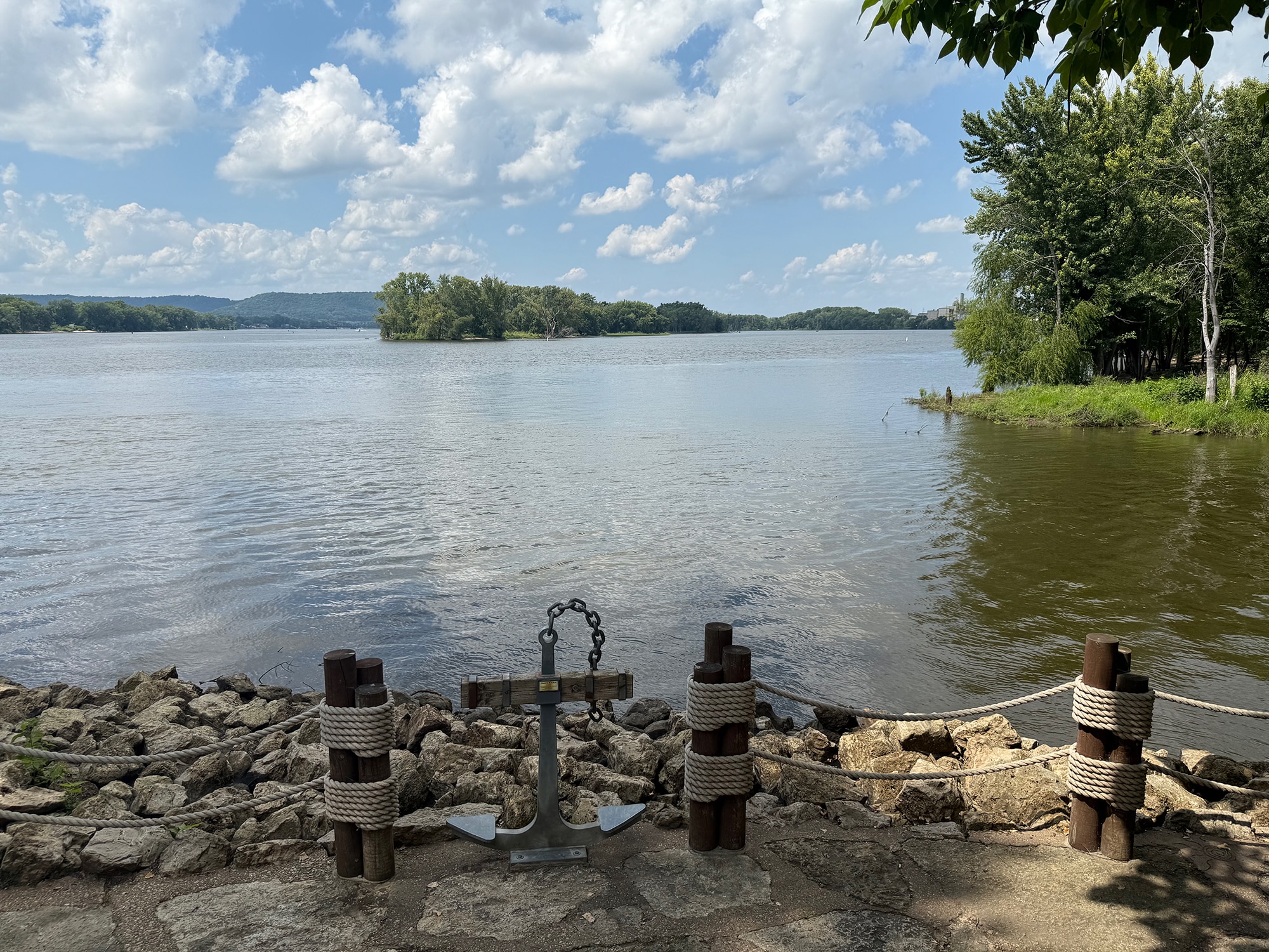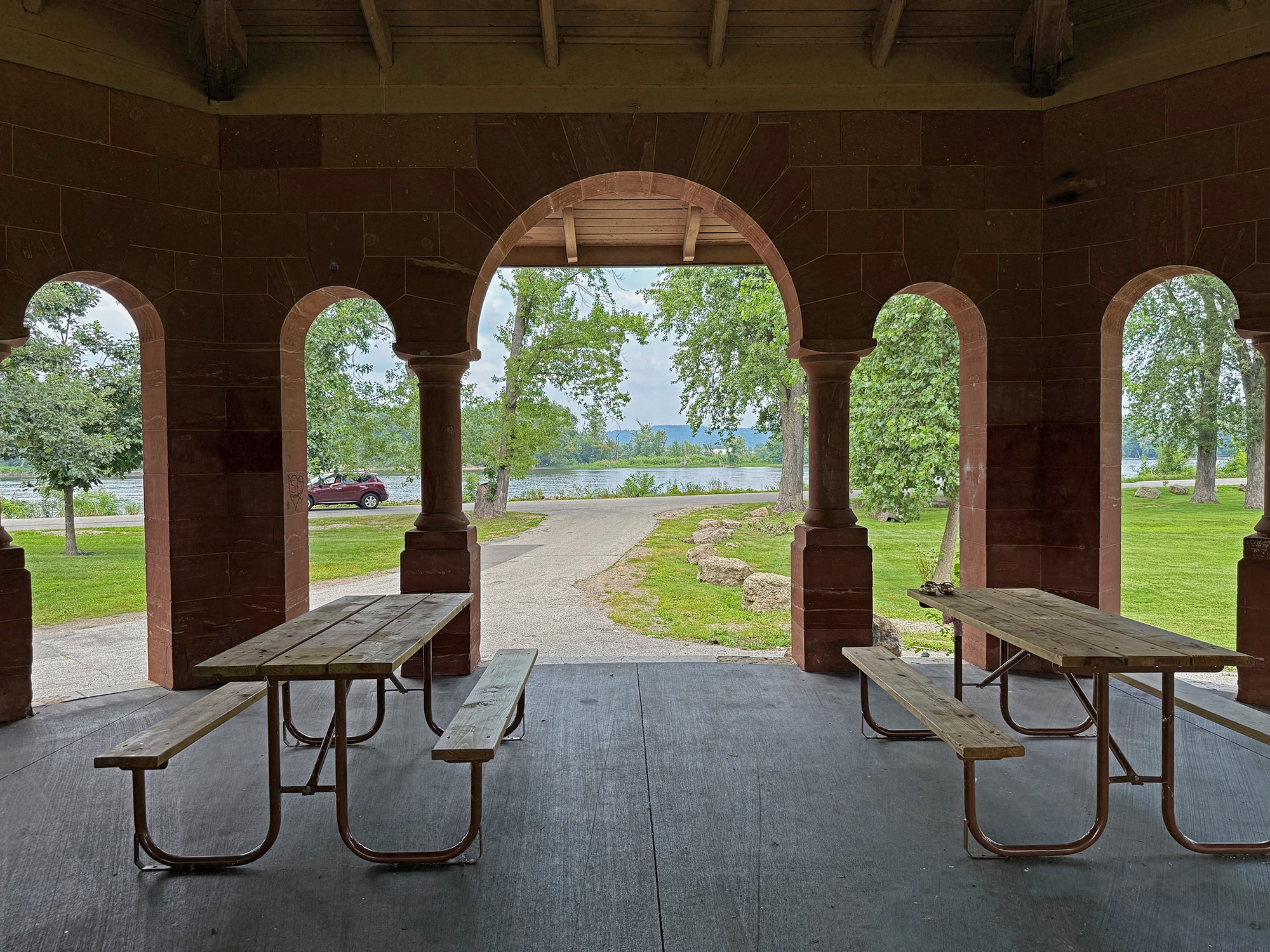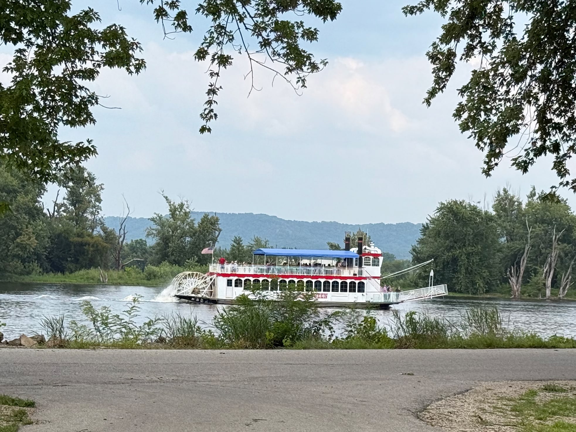 We made our way to the Pettibone Pavilion, which was just awesome! Built in 1902, there were enough picnic tables for a family reunion and wonderful views of the park and the Mississippi. When we were about to leave, I heard the La Crosse Queen making her way downriver, and I was able to get a picture out in front of the gazebo.