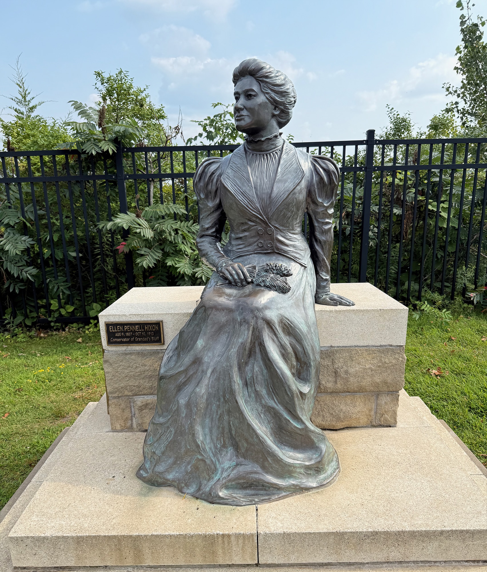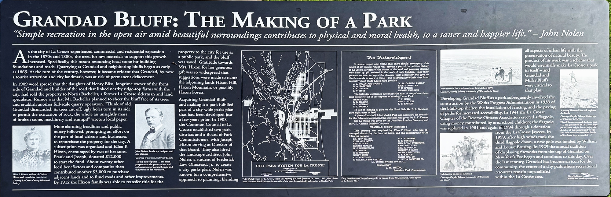 “This statue [below] is dedicated to Ellen Hixon, the widow of Gideon C. Hixon, who was responsible for saving Grandad Bluff and Hixon Forest after a developer began turning it into a rock quarry. In 1909, Ellen began a public campaign to raise $15,000 to buy the bluff. She raised $3,000 before donating the final $12,000 herself.” ~ READ MORE