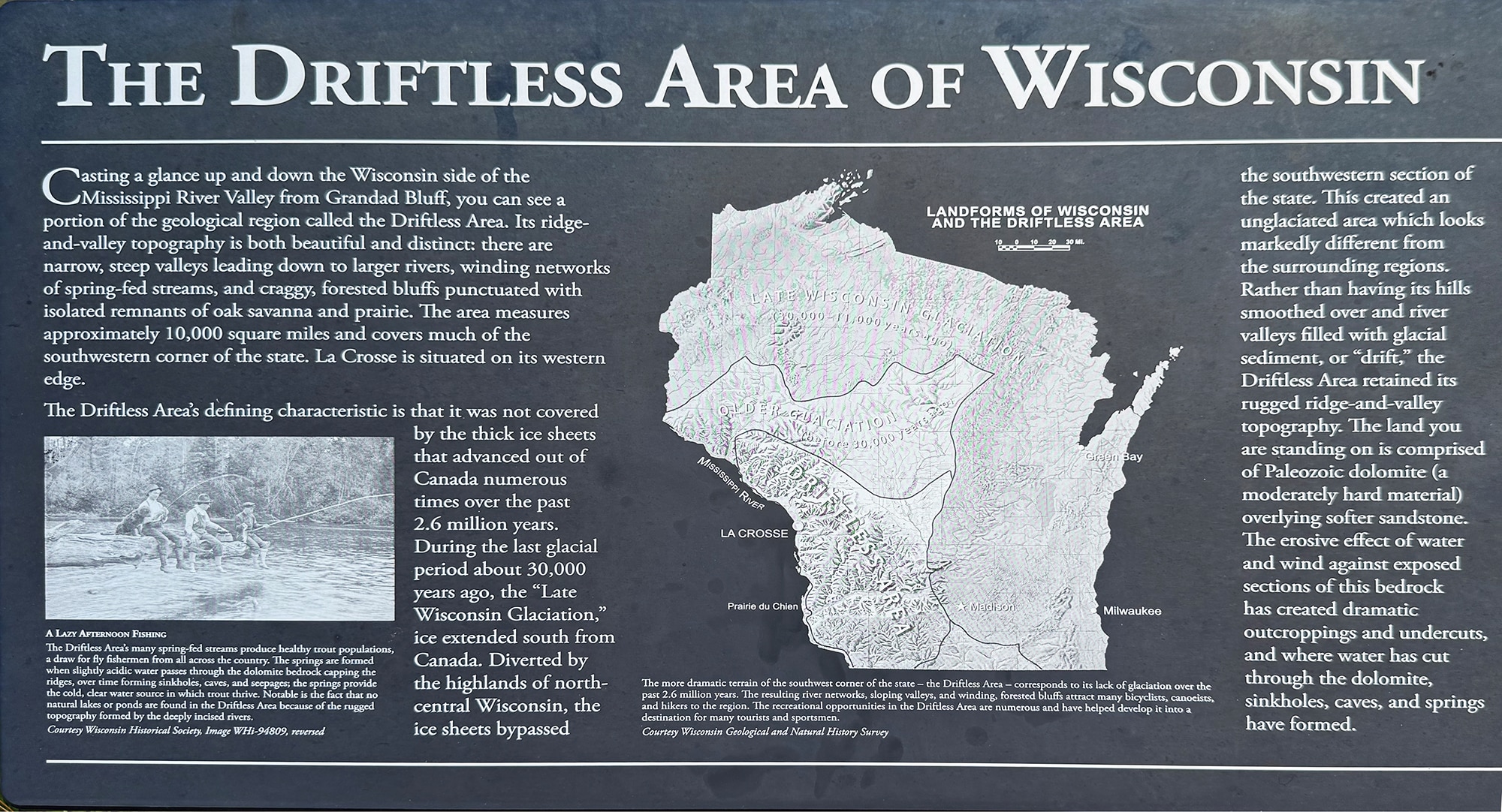 There is lots of good information near the Shelter House including a panel that explains Wisconsin’s “Driftless” area and a statue of the woman who literally saved this bluff.
