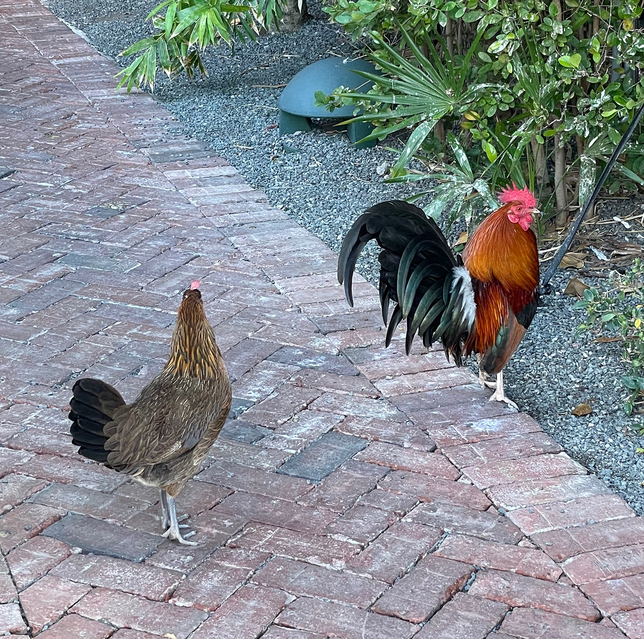 When we needed a change, we went across the street to the Old Town Tavern & Beer Garden. Their beer garden was beautiful with lots of greenery and twinkly lights. We sat at a table at the edge of the patio facing the street so we could continue our people-watching and have another nightcap. The chickens below attempted to lure us in for a little shopping on our way back to our hotel, but we ignored their cackling.