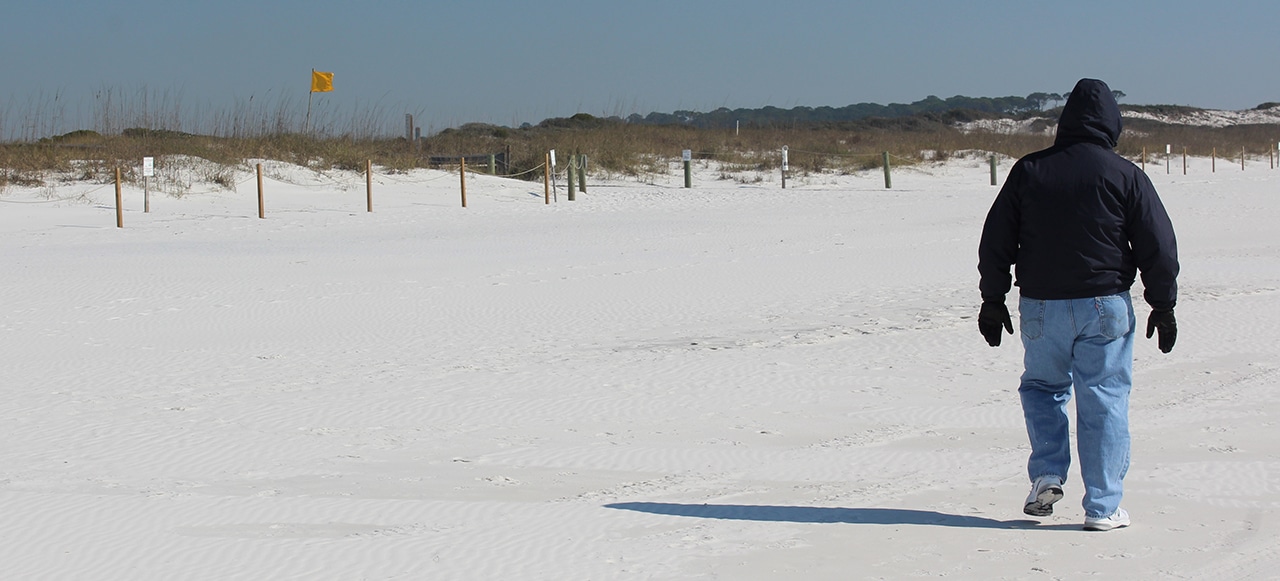 I know that a better goal in life is to be movin’ on UP, but let me explain. Three years ago on our first journey southeast in January (The Emerald Coast), our first stop was two weeks in Panama City Beach. The beautiful white sand in the picture above looked an awful lot like snow, so donning our winter gear didn’t look all that weird. Freezing cold, but not weird. We drove two days southeast to get warmer, but our first stop was not quite far enough.