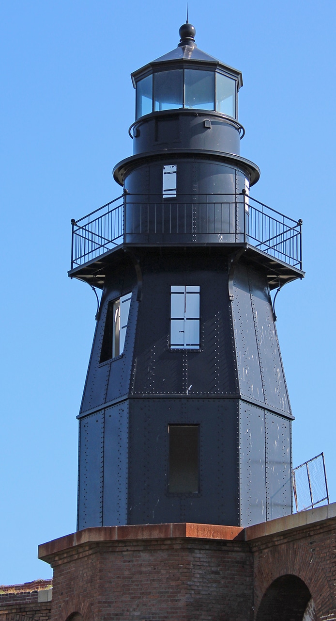 The Tortugas Harbor Lighthouse pictured below was built near the end of 1876 on one of the bastions of Fort Jefferson. This lighthouse replaced the original Garden Key Light that was built near here in 1826. The Garden Key Light had serious design flaws and technical difficulties, even after multiple modifications.