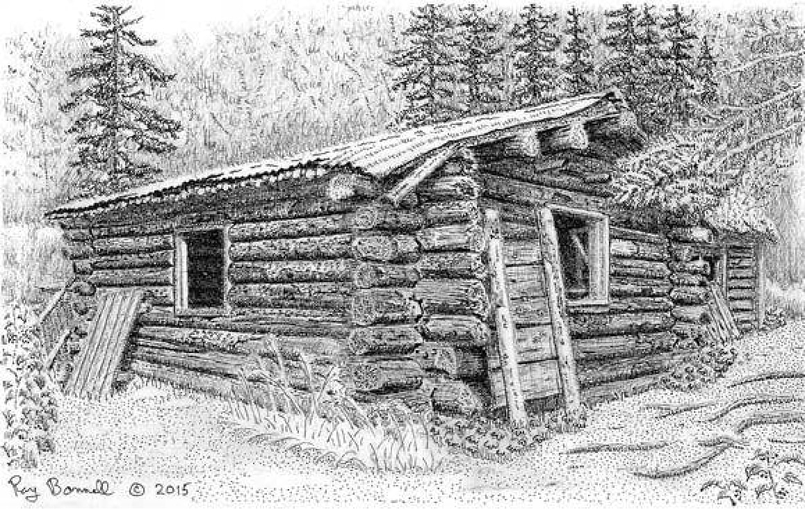 “By Ray Bonnell (also drawing below): Just a few minute’s walk from Byers Lake campground near Mile 138 of the Parks Highway lies the picturesque remains of an old two-room cabin. From 1959 to the early 1970s, this was the headquarters for trapper Edward “Red” Beeman.