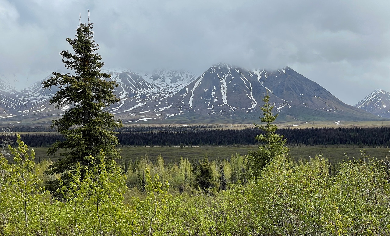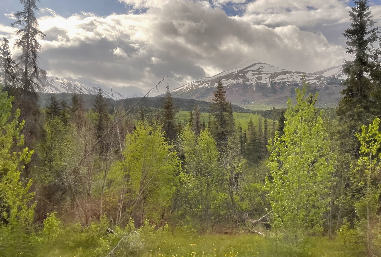 We left a little late for a beautiful drive to our next stop. Our guide was great, pointing out good stuff along the way. We stopped at Mile Marker 201 on the Parks Highway by Summit Lake for awesome mountain views just at the tree line. This stop was magnificent and it was amazing to be here!