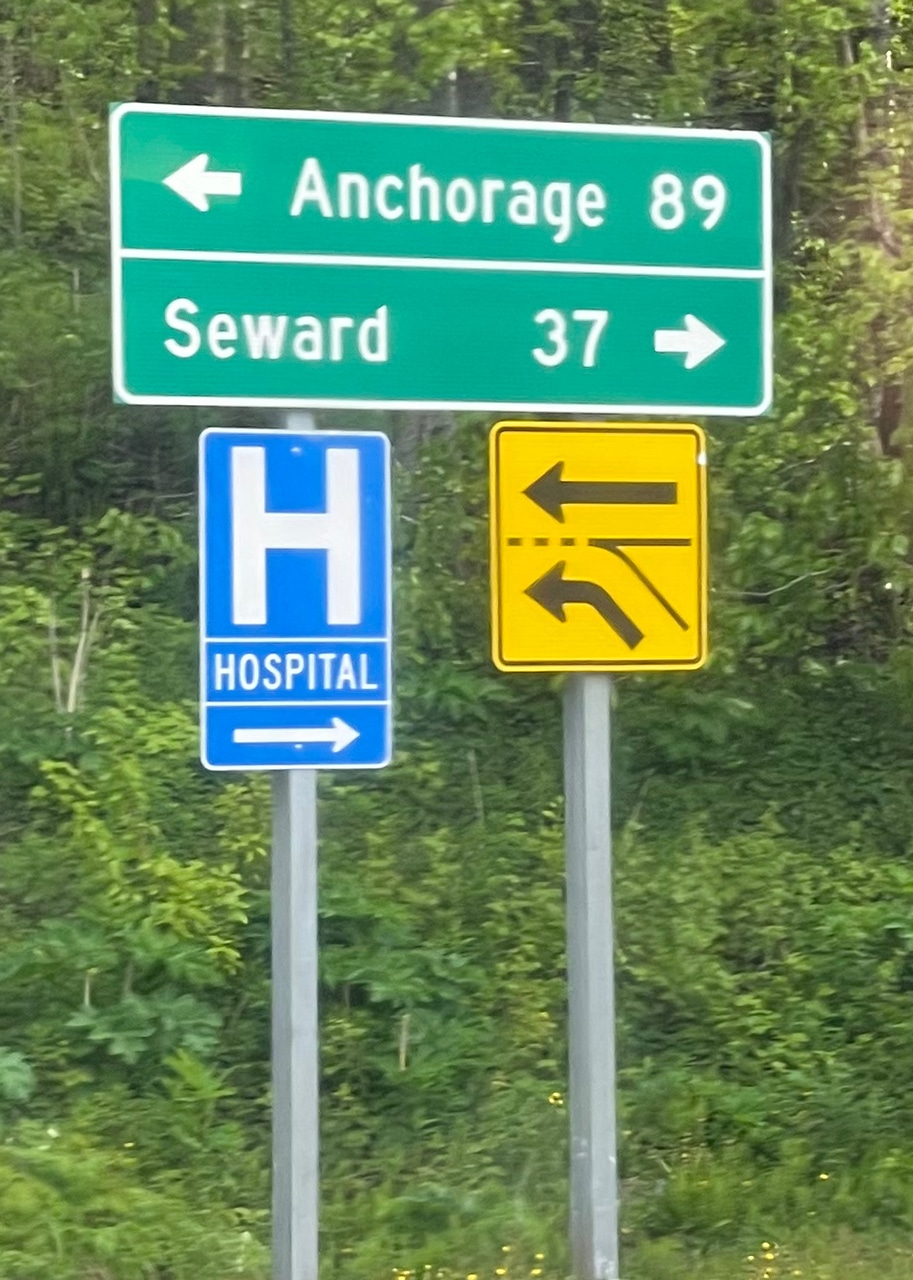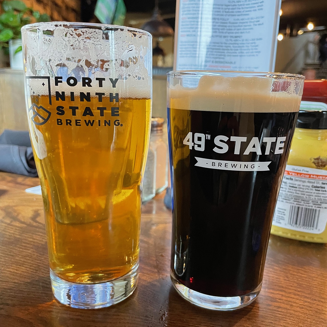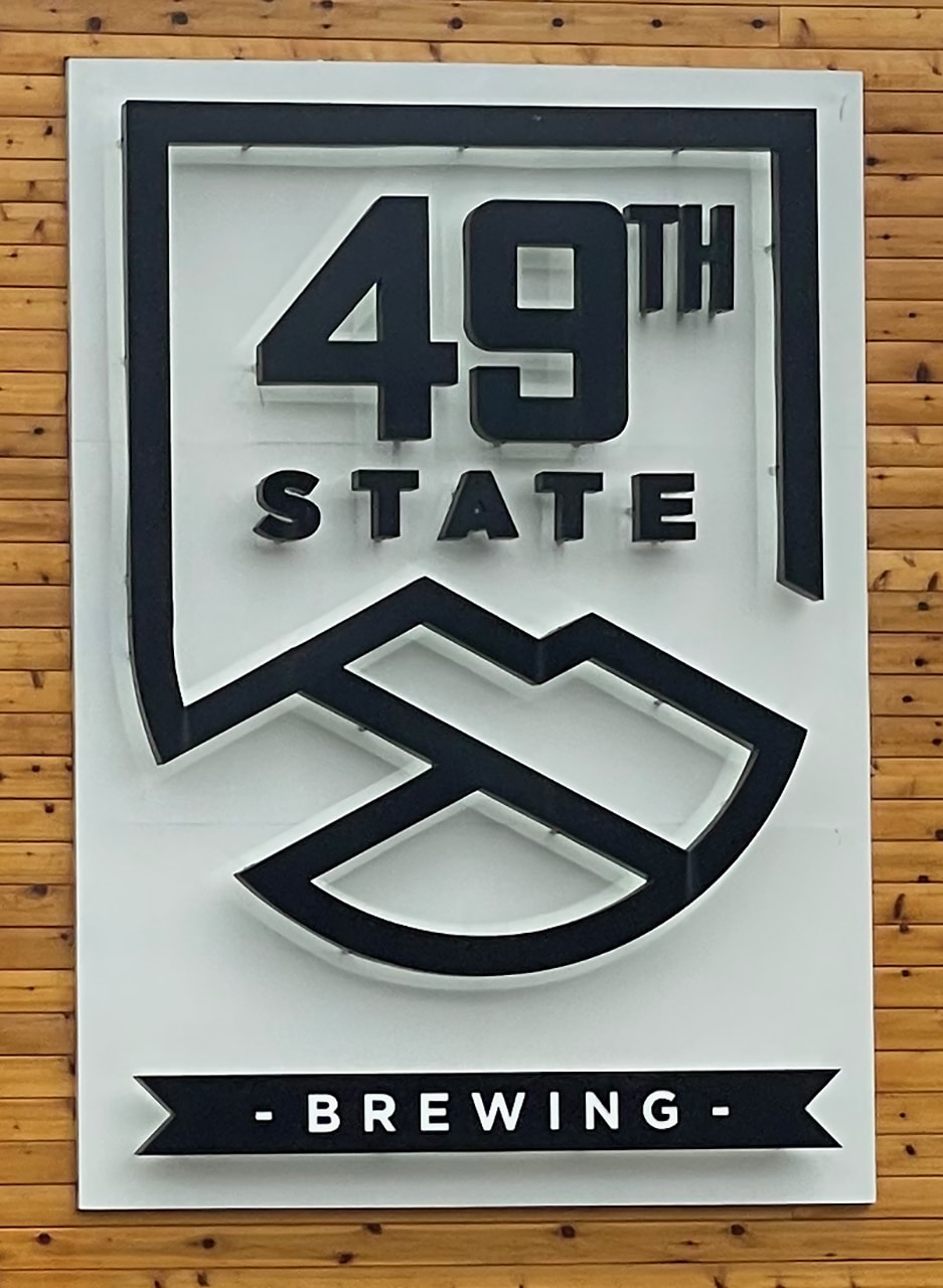 Adding on to our 4-1/2 hour drive, was a 90-minute break in Anchorage. Jim had his sights set on a brewery he visited many years ago when he was in Anchorage for work. He determined it was not Forty-Ninth State Brewery, but this place was really nice and our lunch and beers were very good. If you click on the link, one of the photos that scrolls through is a gorgeous photo of two moose chomping on some tall grasses. That’s a way better picture than I could have gotten from a moving bus anyway, even though we did slow down.