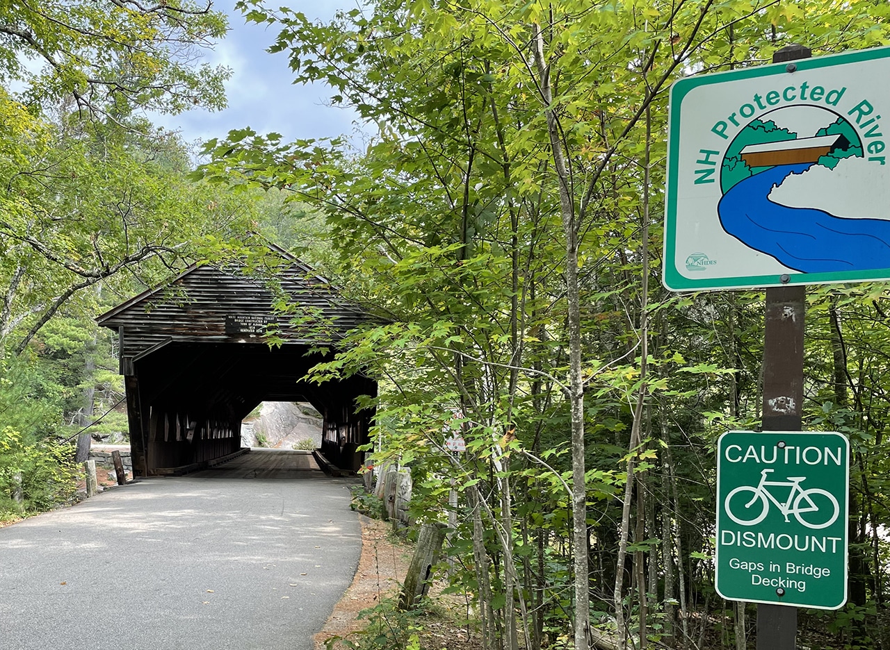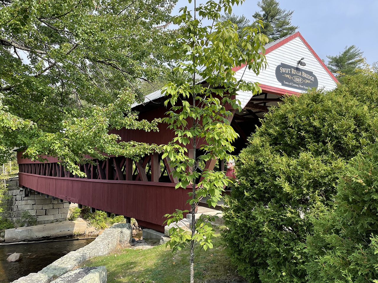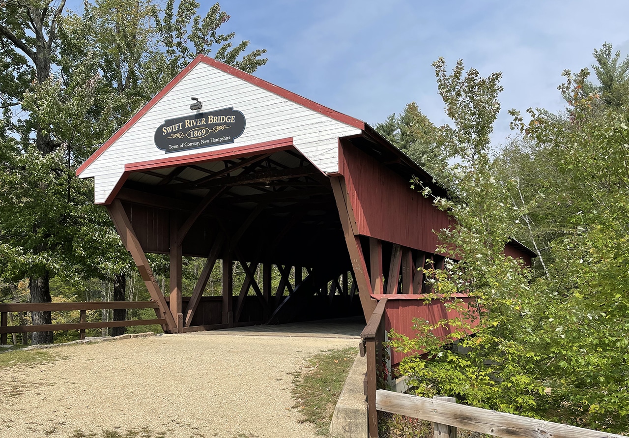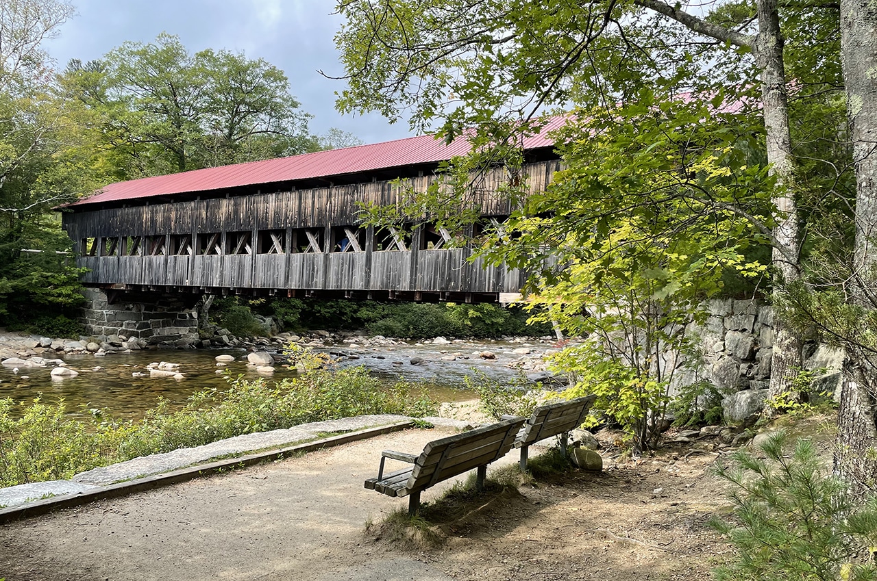 The Albany Bridge is also known as White Mountain National Forest Bridge. With a bench to rest a bit next to the crystal clear waters of the Swift River, this is one of the most photographed covered bridges in New Hampshire.