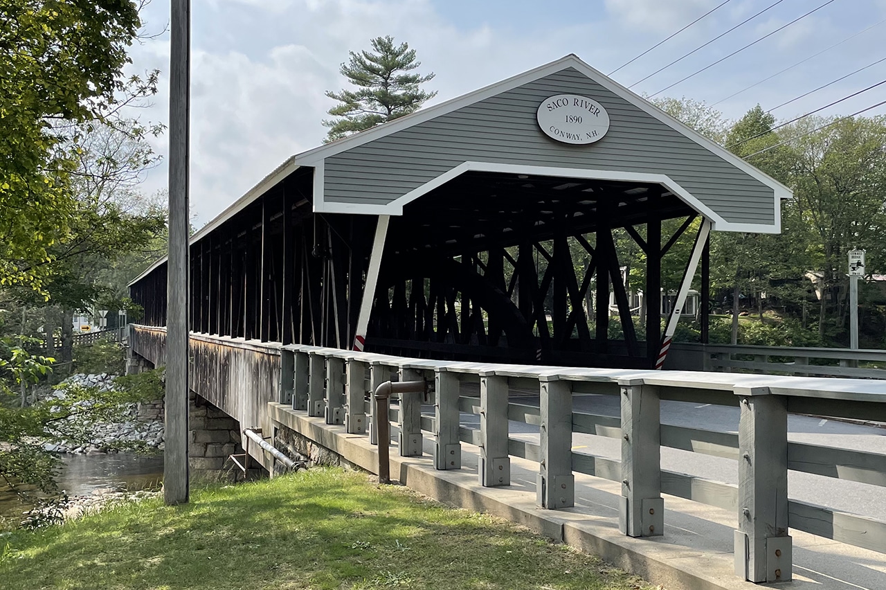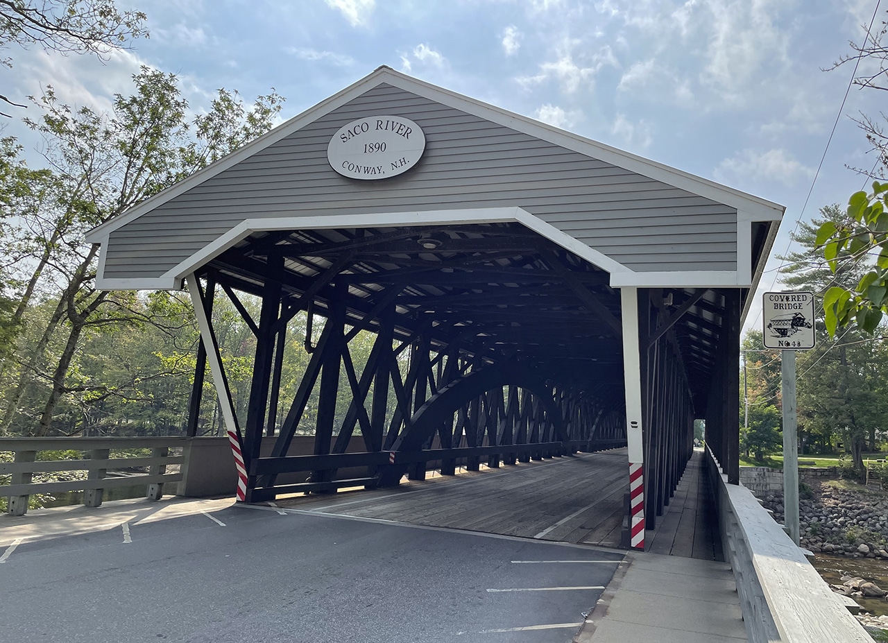 The only way across the Saco River at this location was over a crudely-framed log bridge until its demise in 1850. The 1850 bridge stood until the Swift River bridge crashed into it in 1869 (see inset above). The Saco River Bridge was rebuilt but destroyed again by a tannery fire in 1890. The current bridge was built in 1890, but fully restored in the late 1980s.