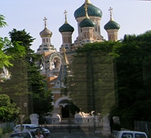 The pictures below were taken on our bus-ride to Nice. We took a spectacular scenic drive along the lower Corniche, past famous Riviera resorts, along the tree-lined Promenade des Anglais and past the Russian Orthodox Cathedral with its six domes and colorful ceramics. Sorry my picture of the Cathedral is not a good one, since we were bumping along on a bus, but you can see some GREAT pictures of the Russian Orthodox Cathedral HERE. It looks to be fantastic and would definitely be a great place to visit on our next trip!