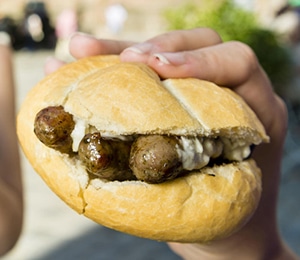 We ended up with a large bag of huge, beautiful bing cherries. We resisted the gingerbread, but instead followed a familiar smell in the next row of vendors. It was pretty early for lunch, but when in Nuremberg… We ordered up Nuremberg sausages (Nürnberger Rostbratwürstchen) “3 im Weggla” – three small sausages laid in a sliced-open bun (weggla) and topped with mustard – with the optional sauerkraut (and a beer).