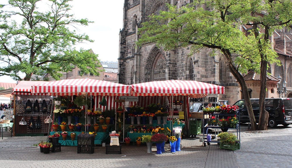 Nürnberger Hauptmarkt was filled with vendors offering fresh produce, freshly baked bread, flowers, arts and crafts. All that and people-watching kept us busy for hours! Local specialties, as well as delicious treats from around the world are available. The striped canopies kept everything undercover, and the bustling atmosphere and fabulous buildings surrounding the market made for a great outing.