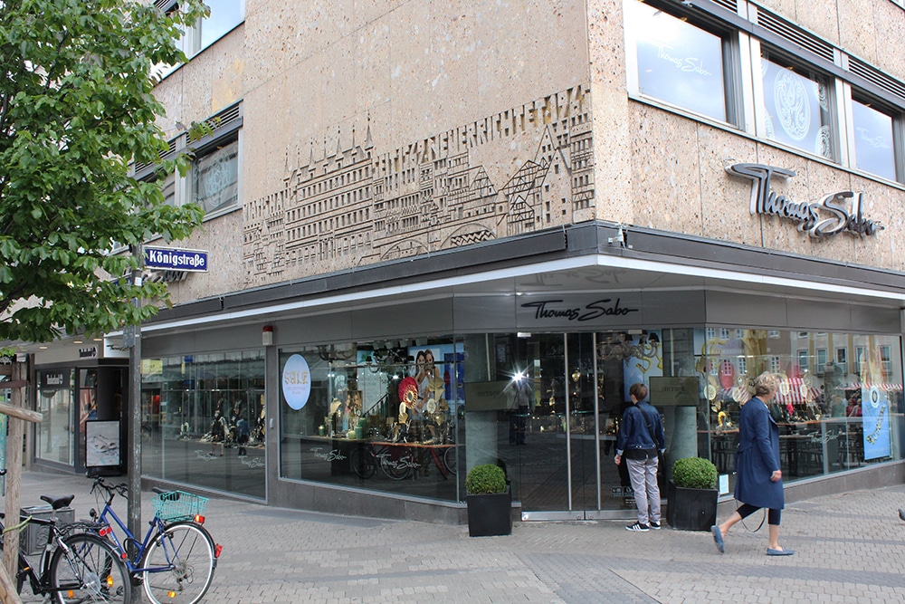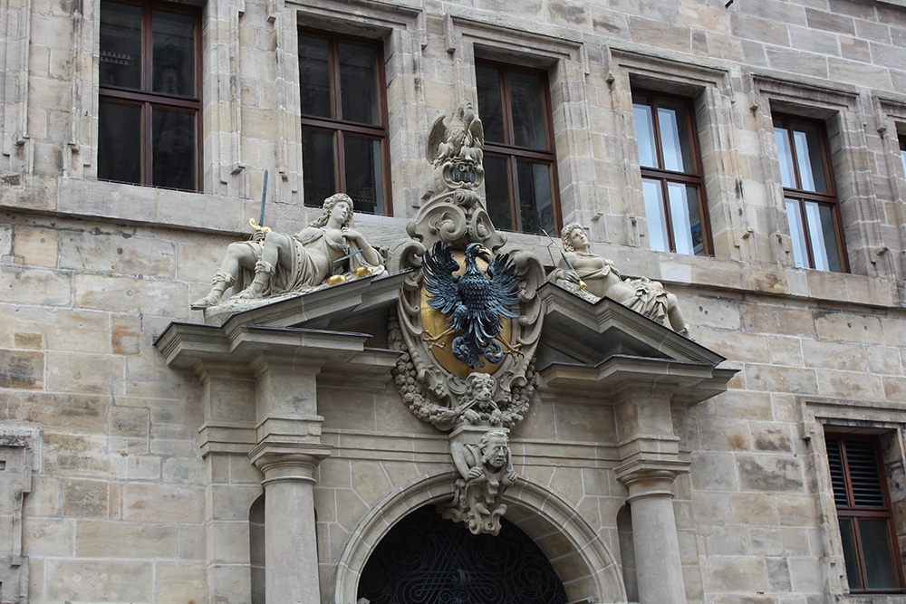 Our tour continues with a walk through the city of Nuremberg, with its mix of old and modern. The Tugendbrunnen (Fountain of the Virtues) was built in the late 1580s and represents the seven virtues of the Middle Ages. The second photo shows a fabulous engraving of the city on the exterior of Thomas Sabo, a fine jewelry store.