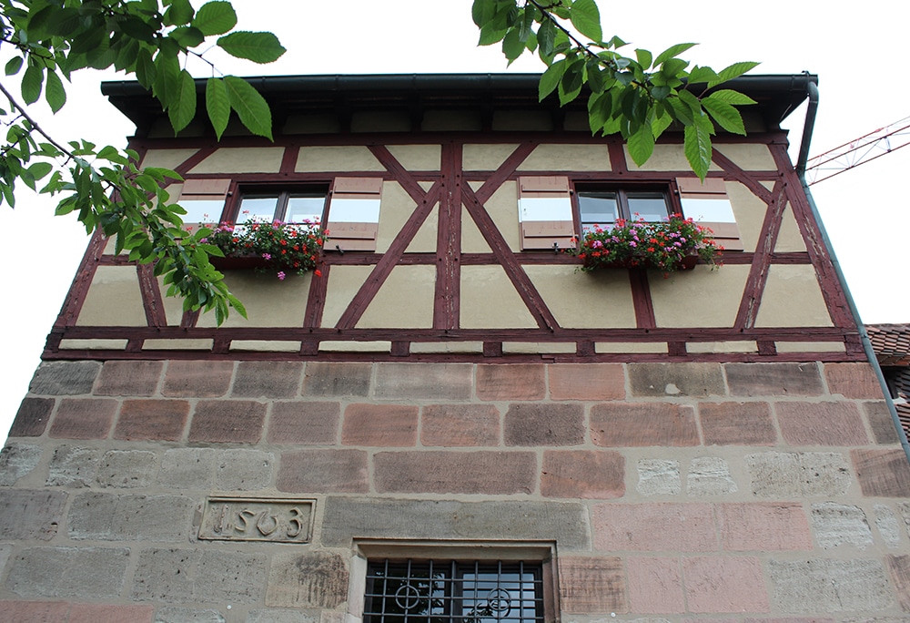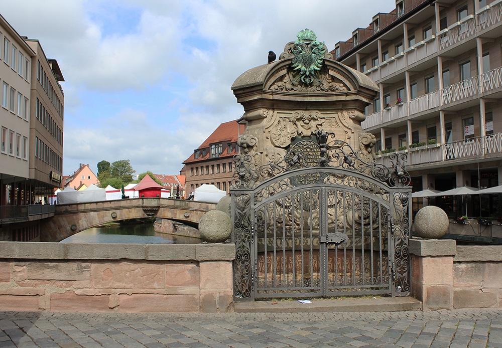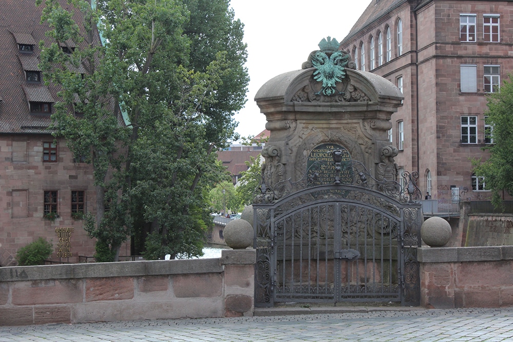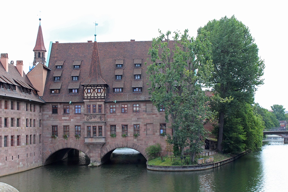 Many footbridges cross the Pegnitz River in Nuremberg with beautiful landmarks along the way. The Hospital of the Holy Spirit (Heilig-Geist-Spital, pictured top left below) was established in 1332 to care for the elderly and poor. Sometime after 1500, another wing was added over the Pegnitz and it’s really quite beautiful. The link has another lovely photo and more info.
