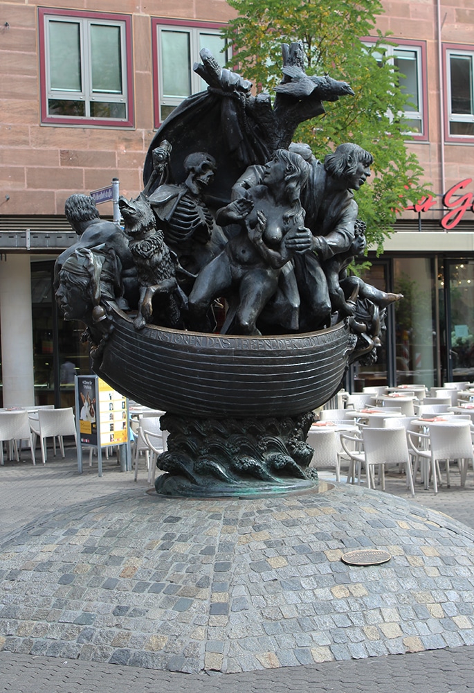 The gruesome statue on the right is named “Ship of Fools“. This bronze statue is a grossly undersized boat carrying seven people, a skeleton and a dog, and depicts the end of the world.