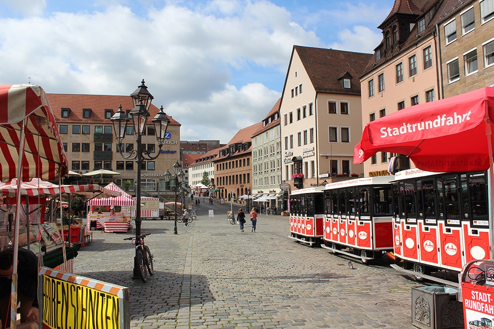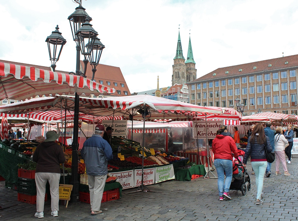 The markets change with the seasons as different produce becomes available. Just before Christmas, the spectacular Weihnachtsmarkt (Christmas Market) offers traditional Christmas gifts and the market is aglow with Christmas lights. I imagine it becomes even more magical when the lights reflect off a snow-dusted square. I wish I could have been there for that! Other times of the year, there are flea markets, as well as the Nuremberg Old Town Festival.