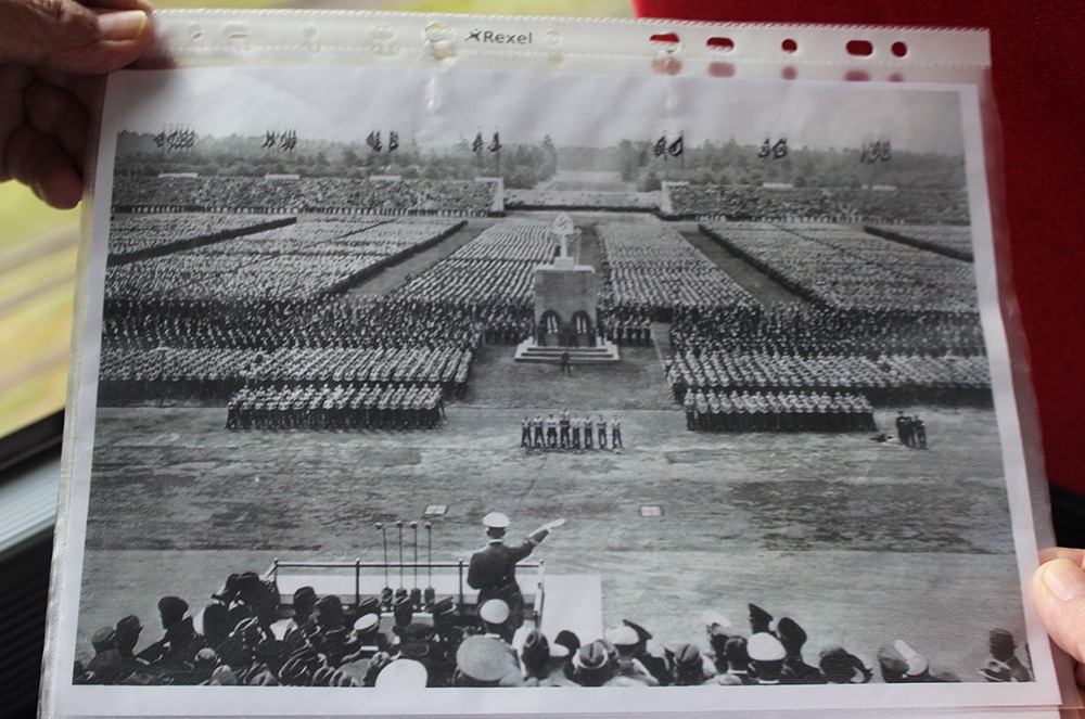“Just a few feet behind the infamous “Führer’s Rostrum”, from which Adolf Hitler delivered virulently anti-Semitic sermons to vast crowds of hypnotised, adoring Germans, the Nazi leader’s once pristine propaganda tribune is covered with steel netting. Signs warn “Danger of collapse!” and “Enter At Your Own Risk”.