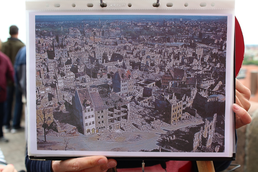 From high atop the castle walls, our tour guide reminded us of the destruction of the war, by showing a photo. The slender white home in the first photo is clearly seen amongst the rubble that surrounded it in the photo taken after the destruction.