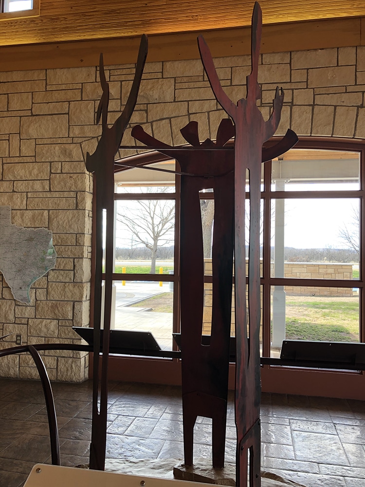 We stopped at the rest area in Coke County, Texas where we found a really nice picnic area with charcoal grills (if you have lots of time) with a cotton field adjacent to it. This beautiful building (with facilities) had a great display of sculptures that symbolize the ancient astronomers of the Concho people. As a lover of metal art with a fascination with ancient beliefs, it was very interesting.