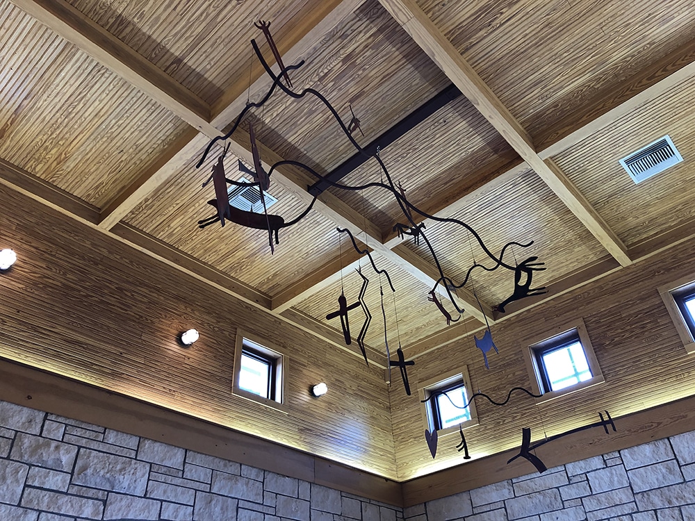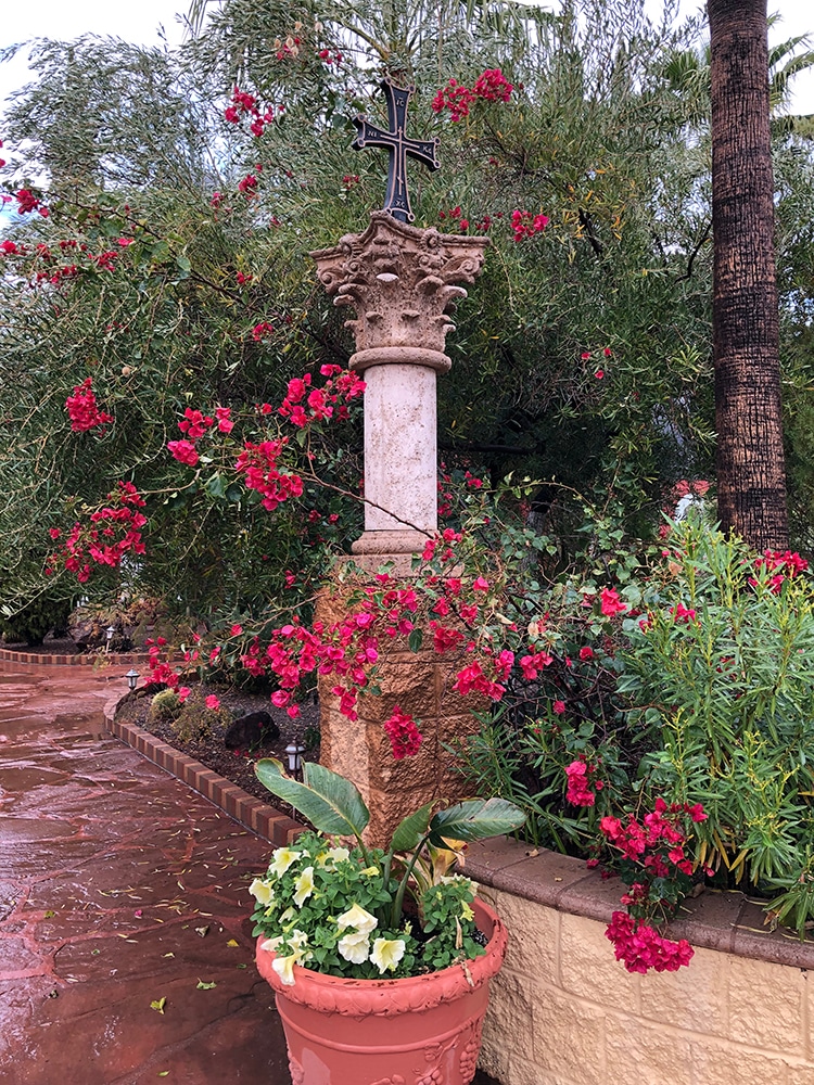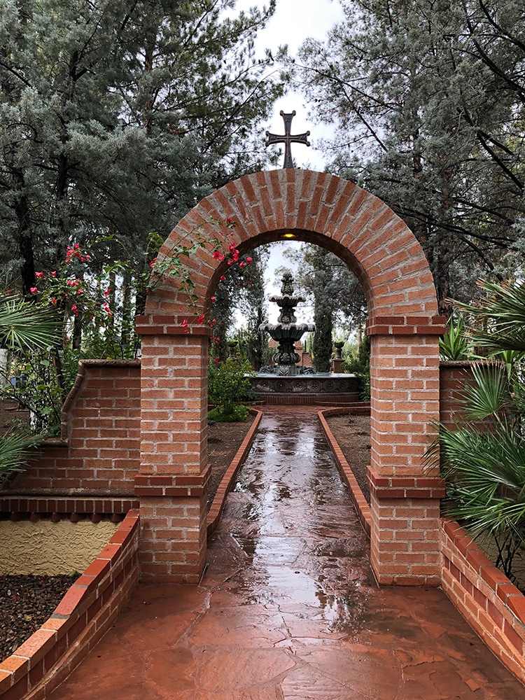 I can’t help feeling blessed with the timing of this day. We went from a downpour in Coolidge to drizzle here and on to magnificent blue skies, puffy clouds and wet tiles in the early afternoon to accentuate the beauty of the stones, the landscaping and building designs. The woman with the key to open the doors of the new chapel with the incredible blue ceiling, was just icing on the cake. And now it’s clouding up again. I better get back to the car!