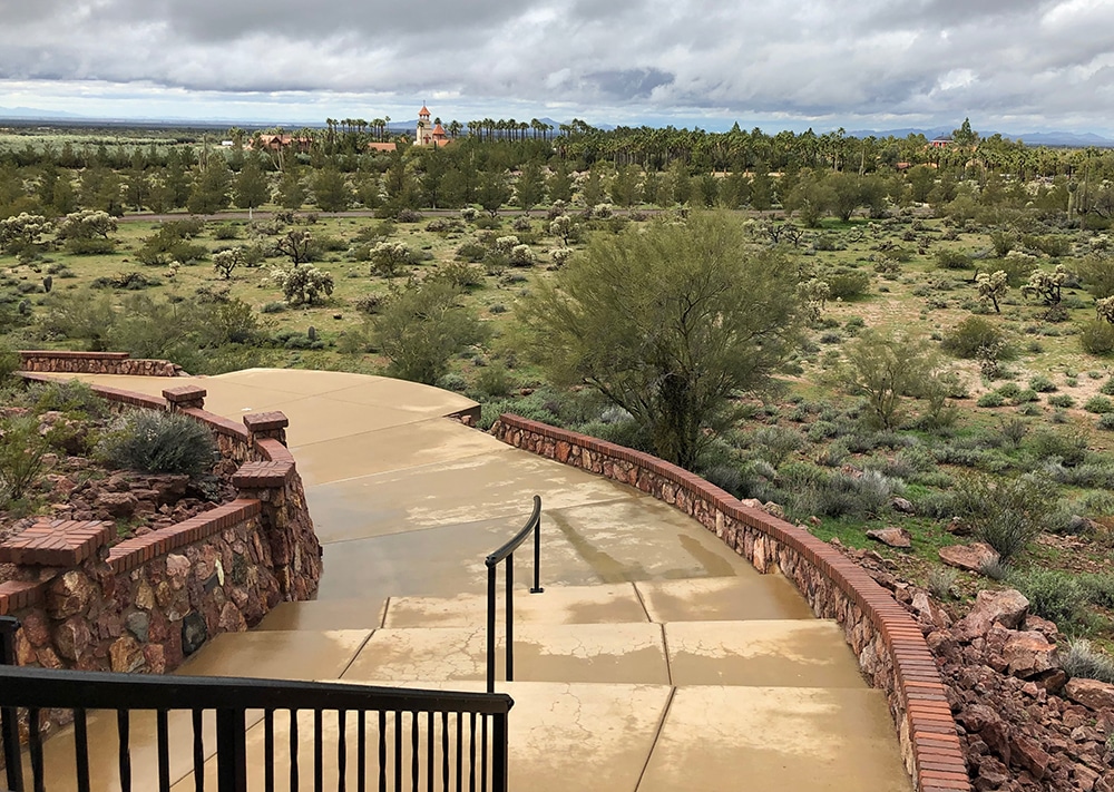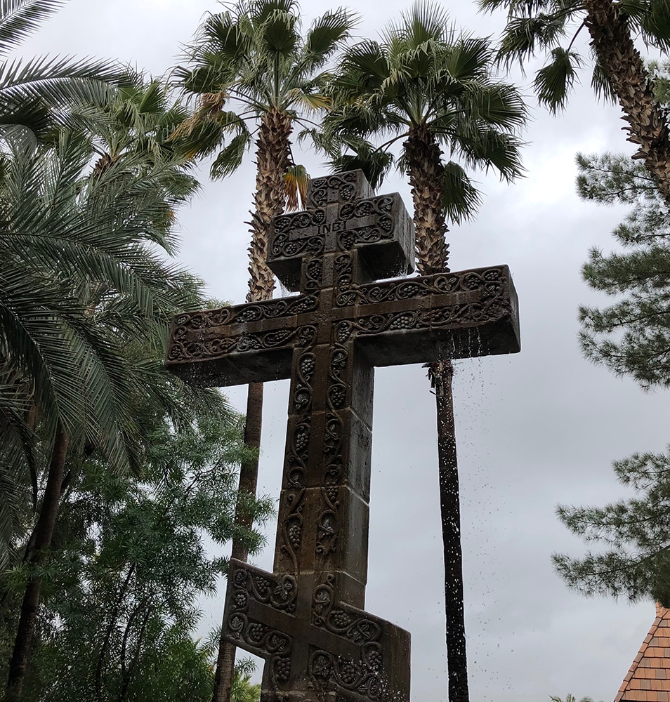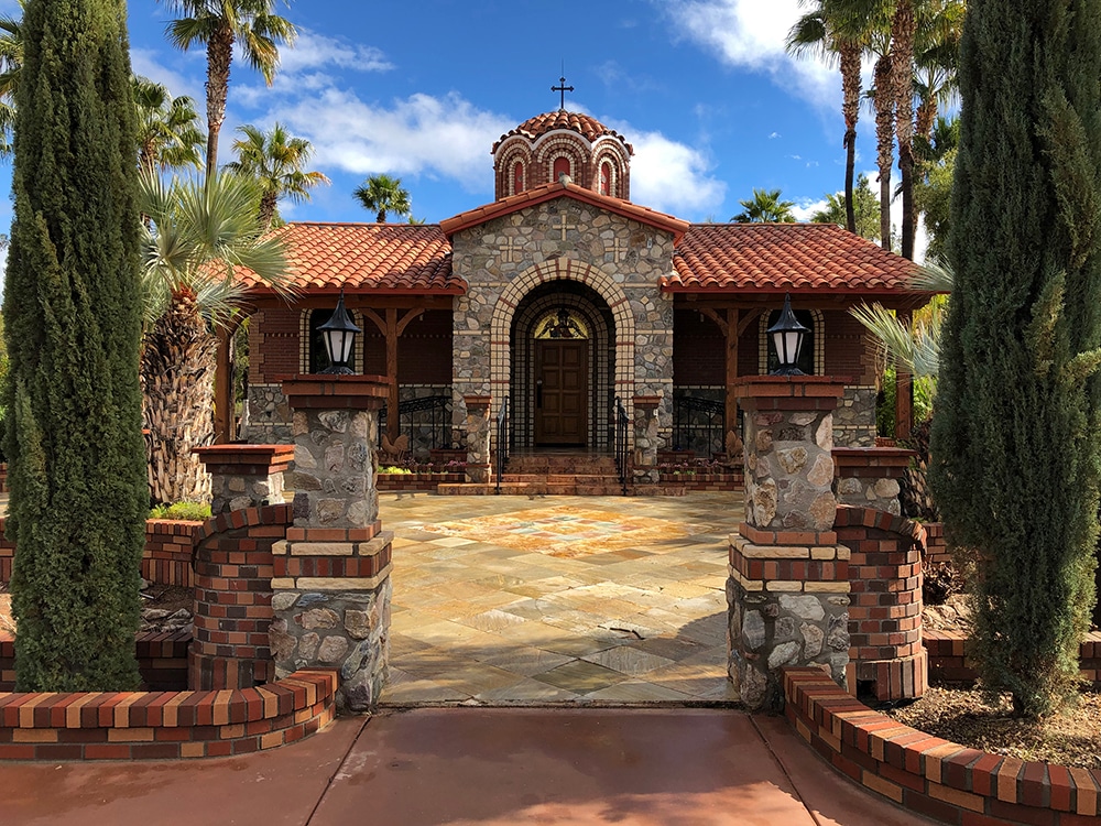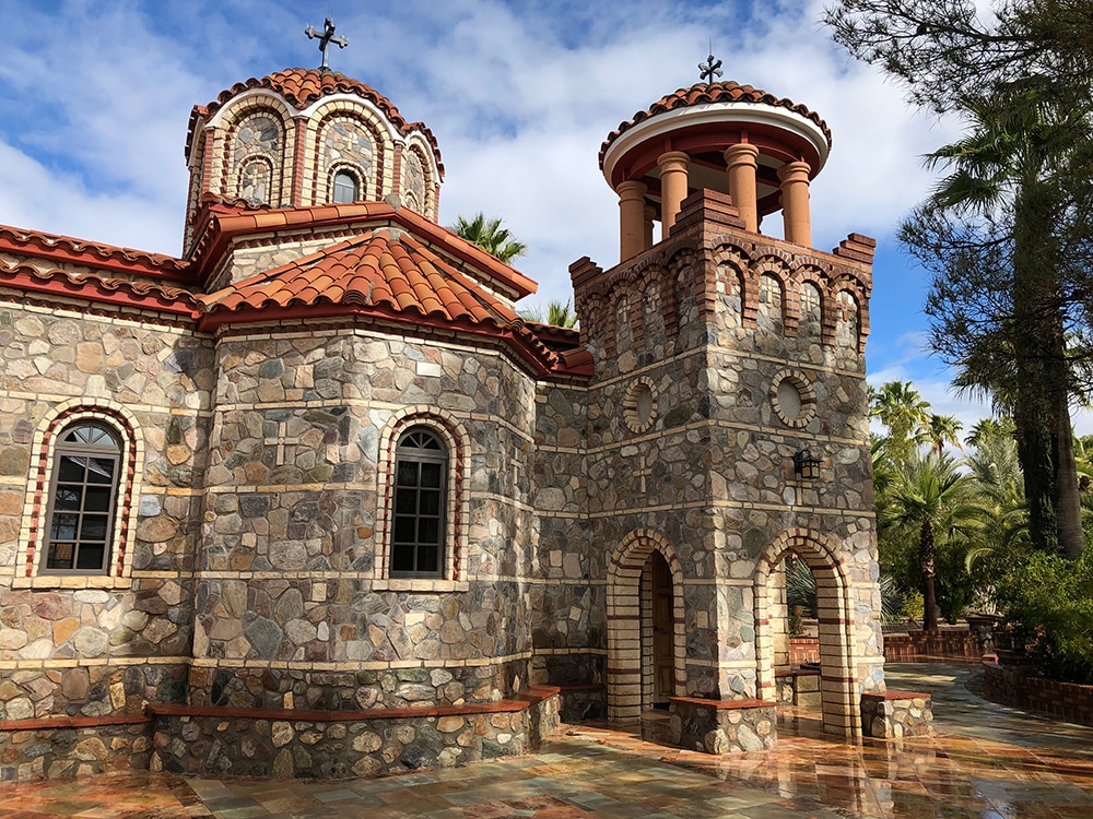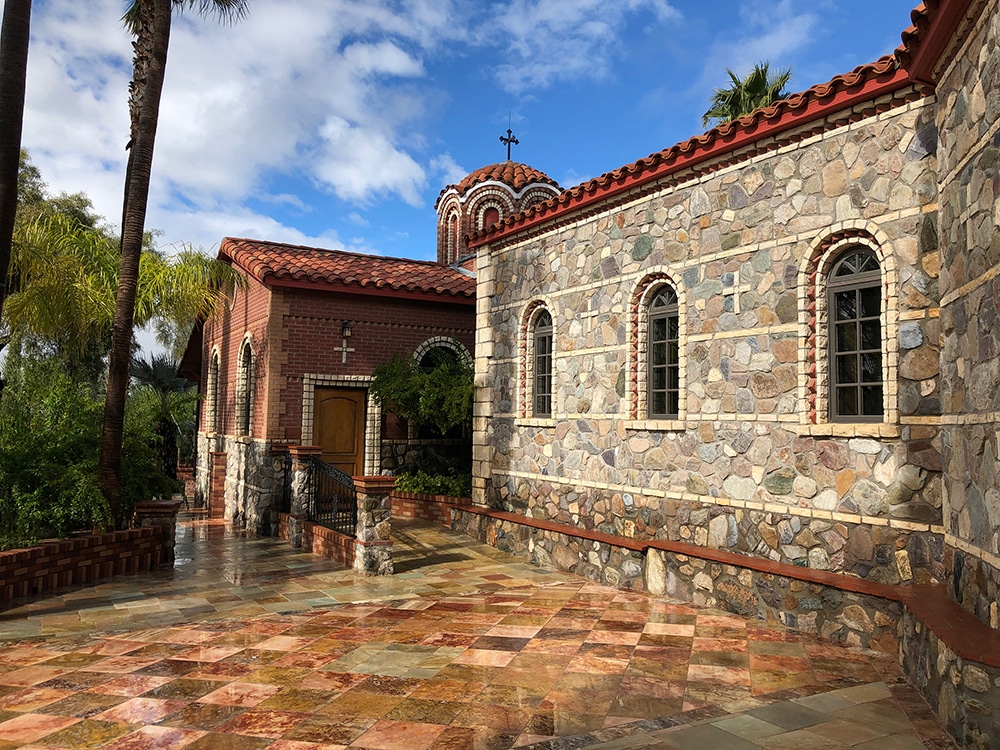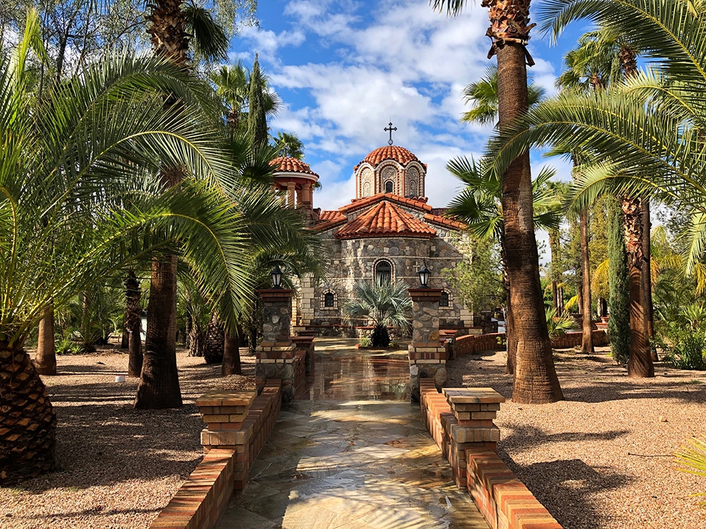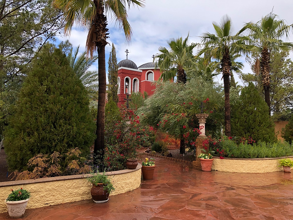 Upon their arrival the fathers began with the necessary construction work, building first the main church, living quarters for the monks, the dining hall, and guest facilities. A vegetable garden, a small vineyard, citrus orchards, and an olive grove dot the landscape. An elaborate system of gardens, pathways, and gazebos with Spanish fountains truly render the monastery and its extensive grounds an oasis in the desert.” – READ MORE