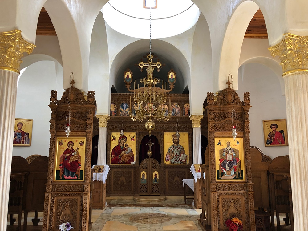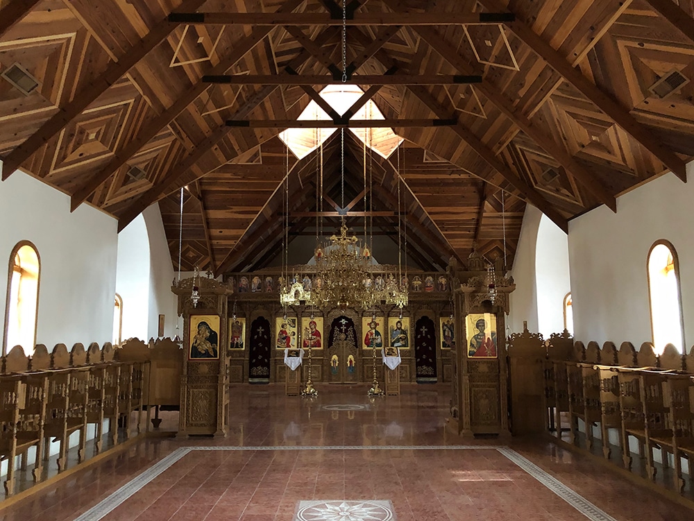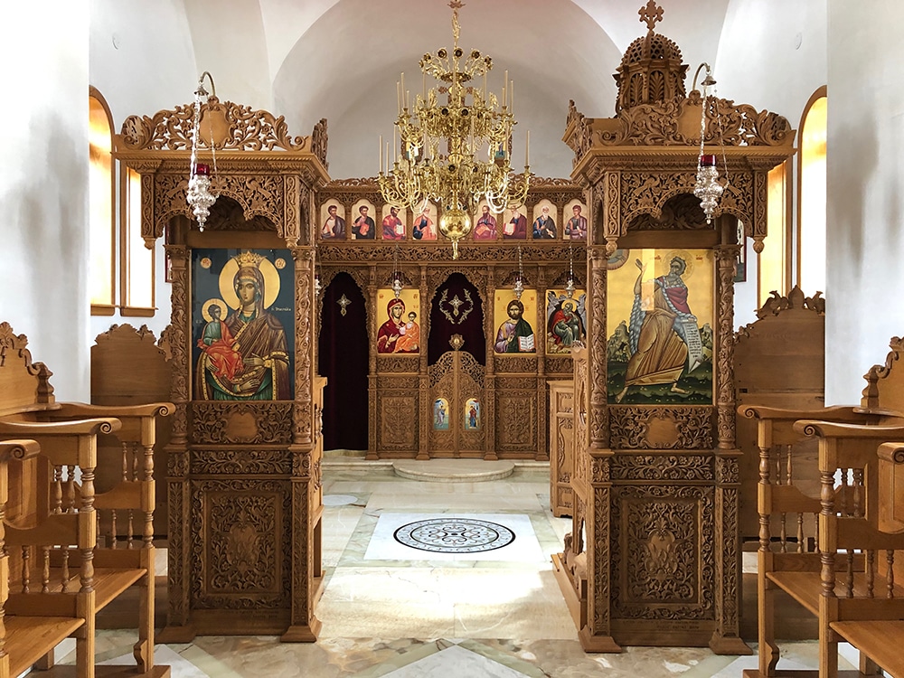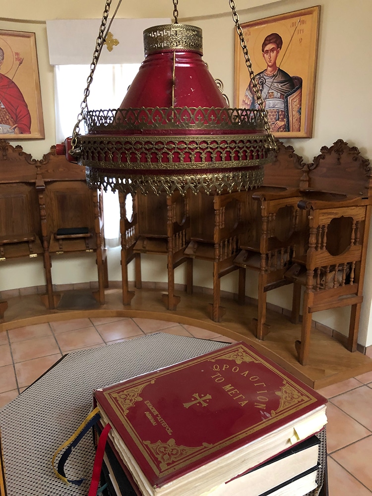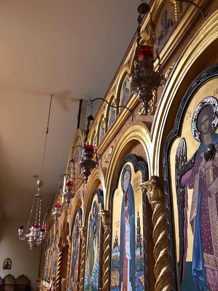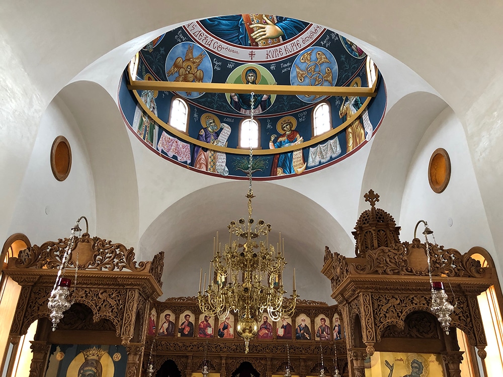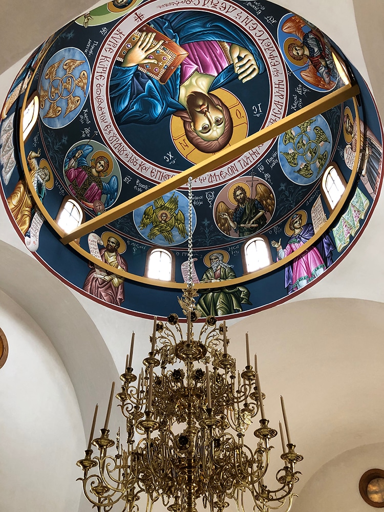 Our next stop was to the east of the monastery. It could be seen from up to five miles away, but we had to drive out of the grounds a ways to another parking area and climb a hill and some stairs to get a closer look. Completed in 2008, this is the newest chapel and is dedicated to the Prophet Elias. I was required to keep my long skirt and scarf on to go inside.
