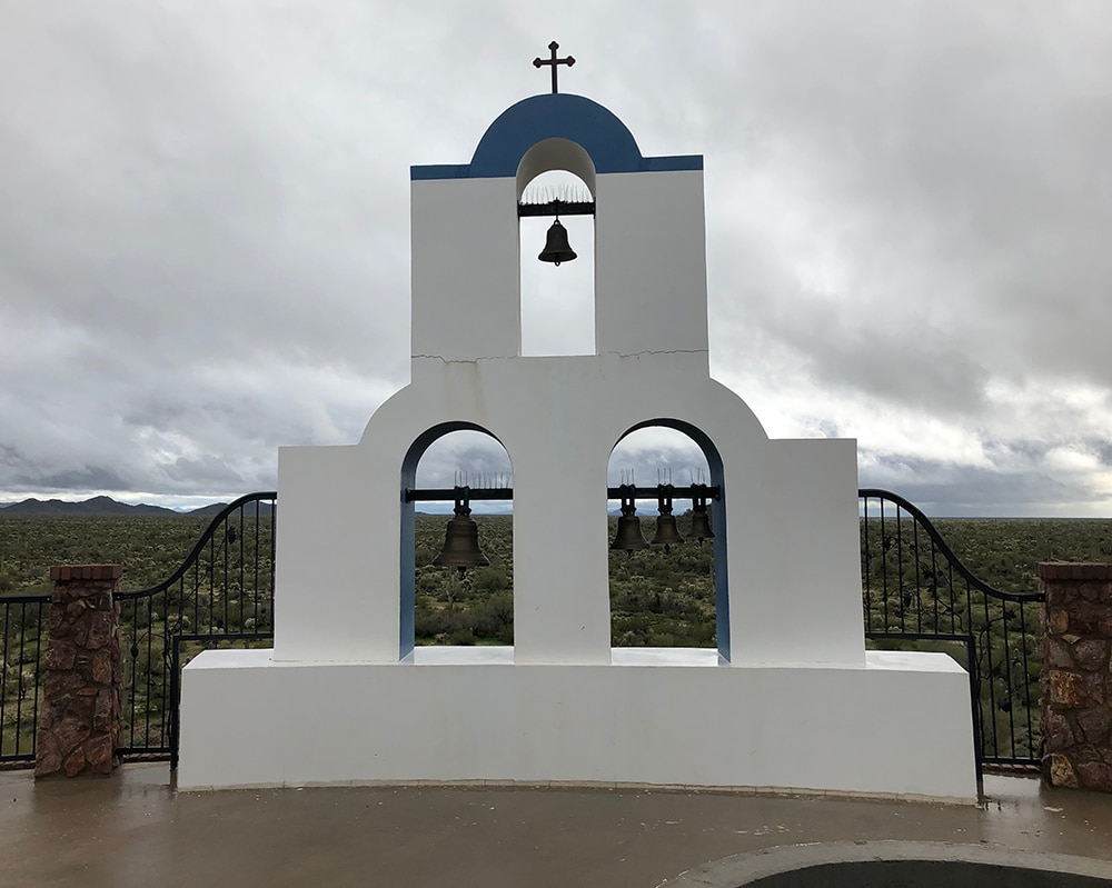 Views of the desert were endless from this vantage point and the stairway and railing were very inviting as I wound my way to the top. As I approached the front of the chapel and attempted to open the door, I discovered it was locked. Although disappointed, I decided to check out the views from all points of this perch well above the desert floor. The bells behind the chapel had an old Spanish design, and I can imagine they can be heard from quite a ways away.