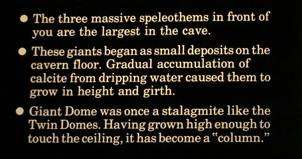 This cavern is HUGE! With names like Bottomless Pit and Bat Roost, Lion’s Tail (shown above left), Temple of the Sun and Rock of Ages, we knew we were looking at the history of the earth. And what an amazing history it is! And this was just the Big Room. There are over 120 rooms here. Some are available on ranger-led tours and more are still being discovered. Amazing!