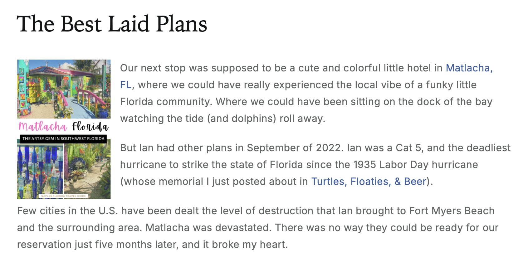 We had a room booked in Matlacha for 2023, but Hurricane Ian devastated this lively little town and everything around it. We were getting a little nervous when Helene and then Milton headed that way before this trip, but luck was on their side – and also on ours.