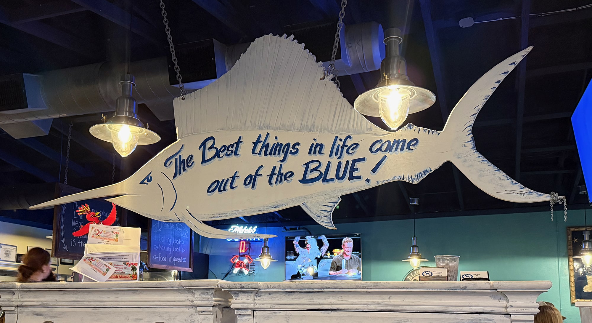 “The white boots (locally called ‘Pine Island Reeboks’) that ‘Blue’ wears on our logo [just below] are a nod to the rich past and current fishing history of Pine Island and Matlacha. These boots are worn by commercial fishermen all along the Gulf Coast from Texas to Florida.” ~ READ MORE