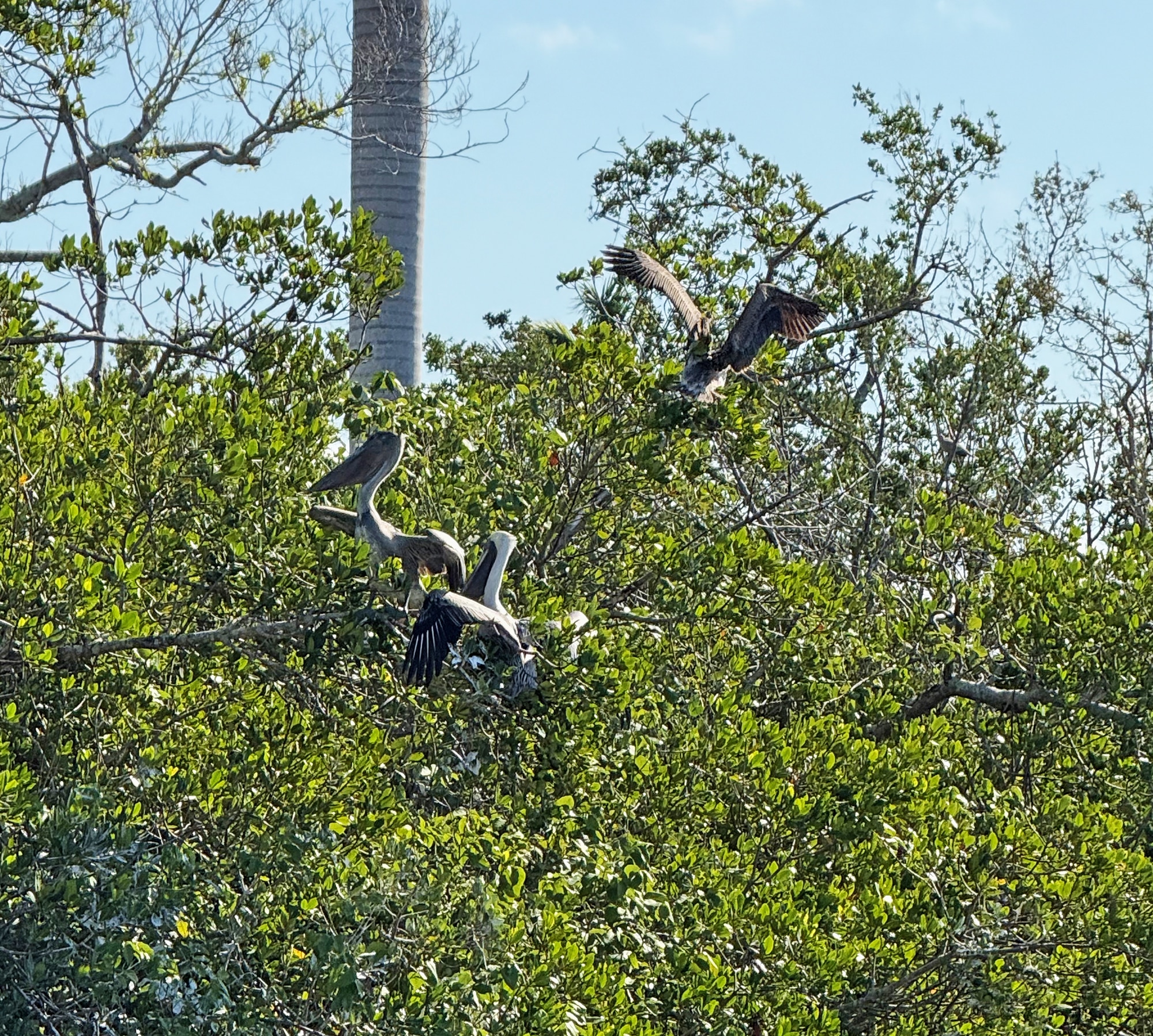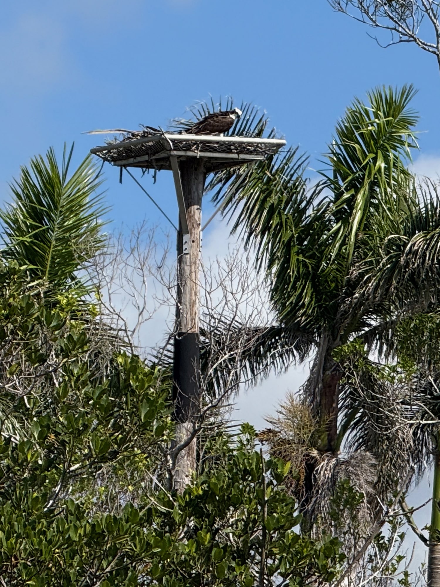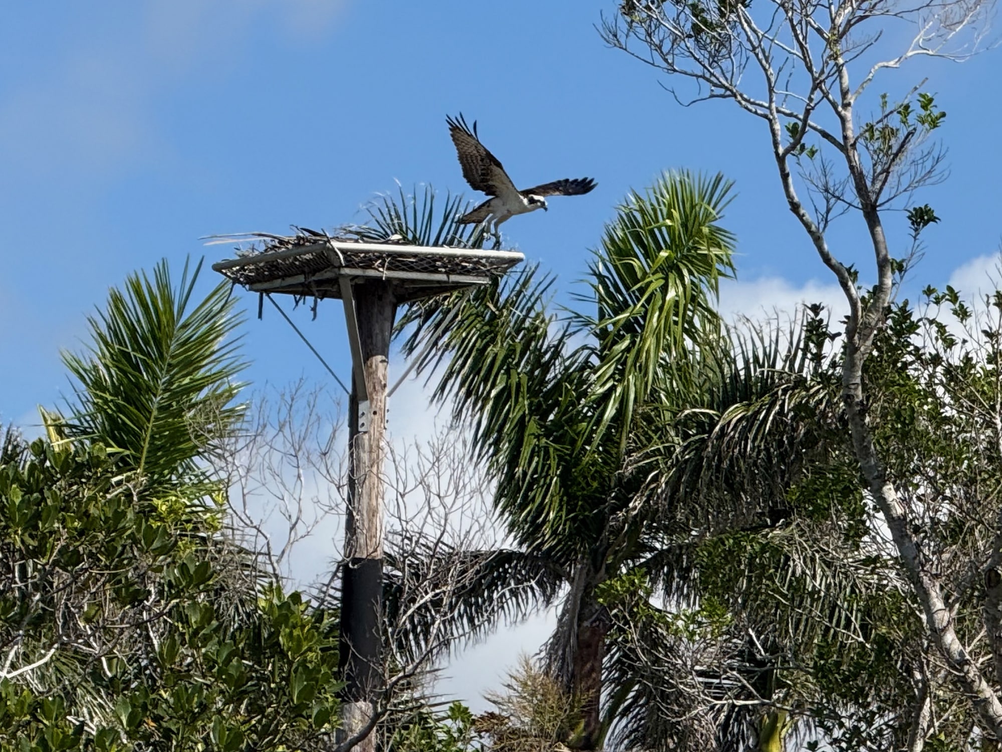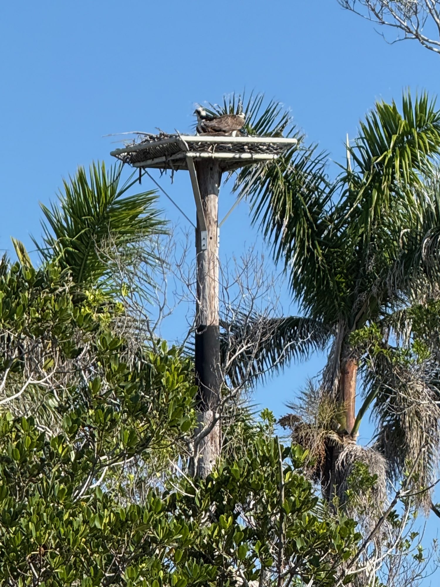 This guy (and the pelicans just below) were the first birds I noticed on our first morning in Matlacha. Once we started watching the nesting platform, things got even more interesting. In order to get from his perch high in this dead tree (and back) he’d have quite a landing procedure. Since osprey are typically large birds – with a wingspan up to six feet – they can’t just fly straight over to the platform. They have to circle around in a big swoop and come in from the other side. It was quite impressive!