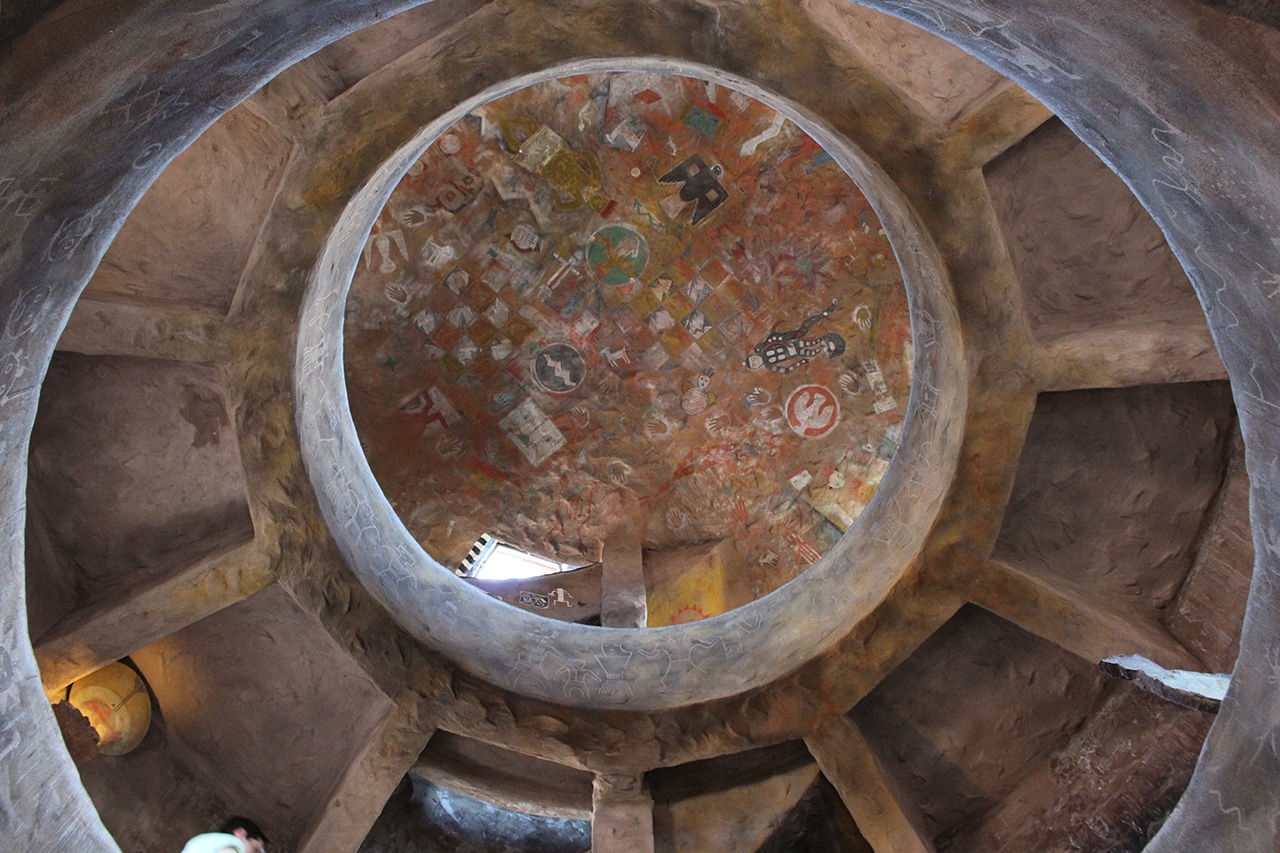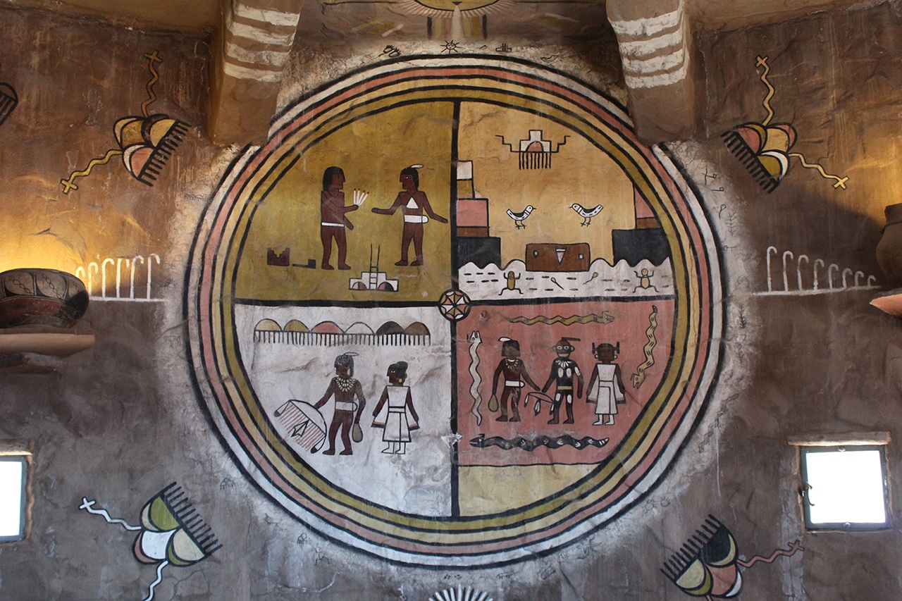 A truly unique stop, Desert View Watchtower stands at the eastern end of the South Rim. Featuring a concrete foundation and steel framework beneath the stones, it offers spectacular views of the Grand Canyon and the Painted Desert at each level. Paintings adorn the interior which depict various aspects of Hopi mythology and religious ceremonies [last three photos below].” ~ from The Natural Beauty of Arizona