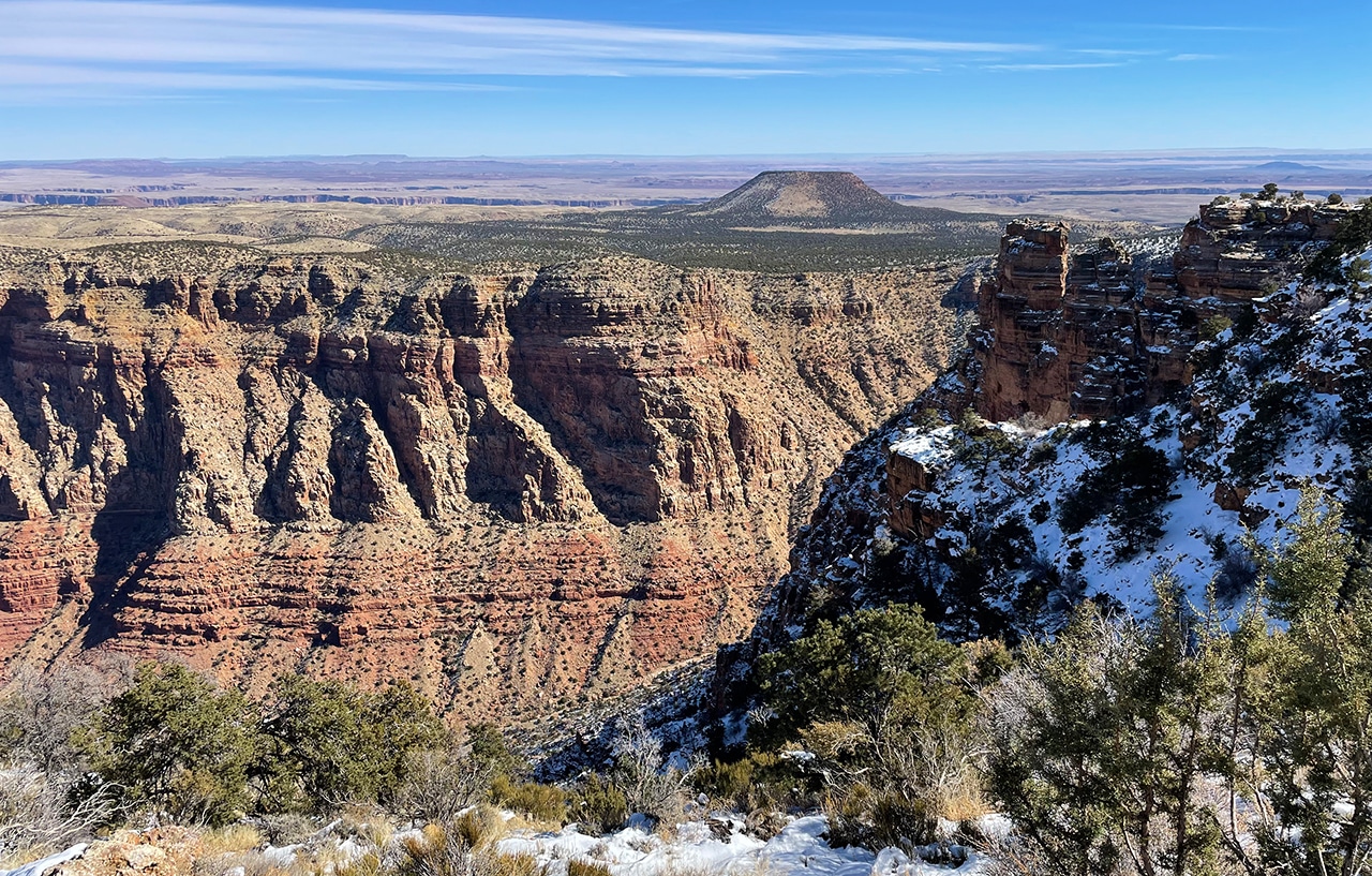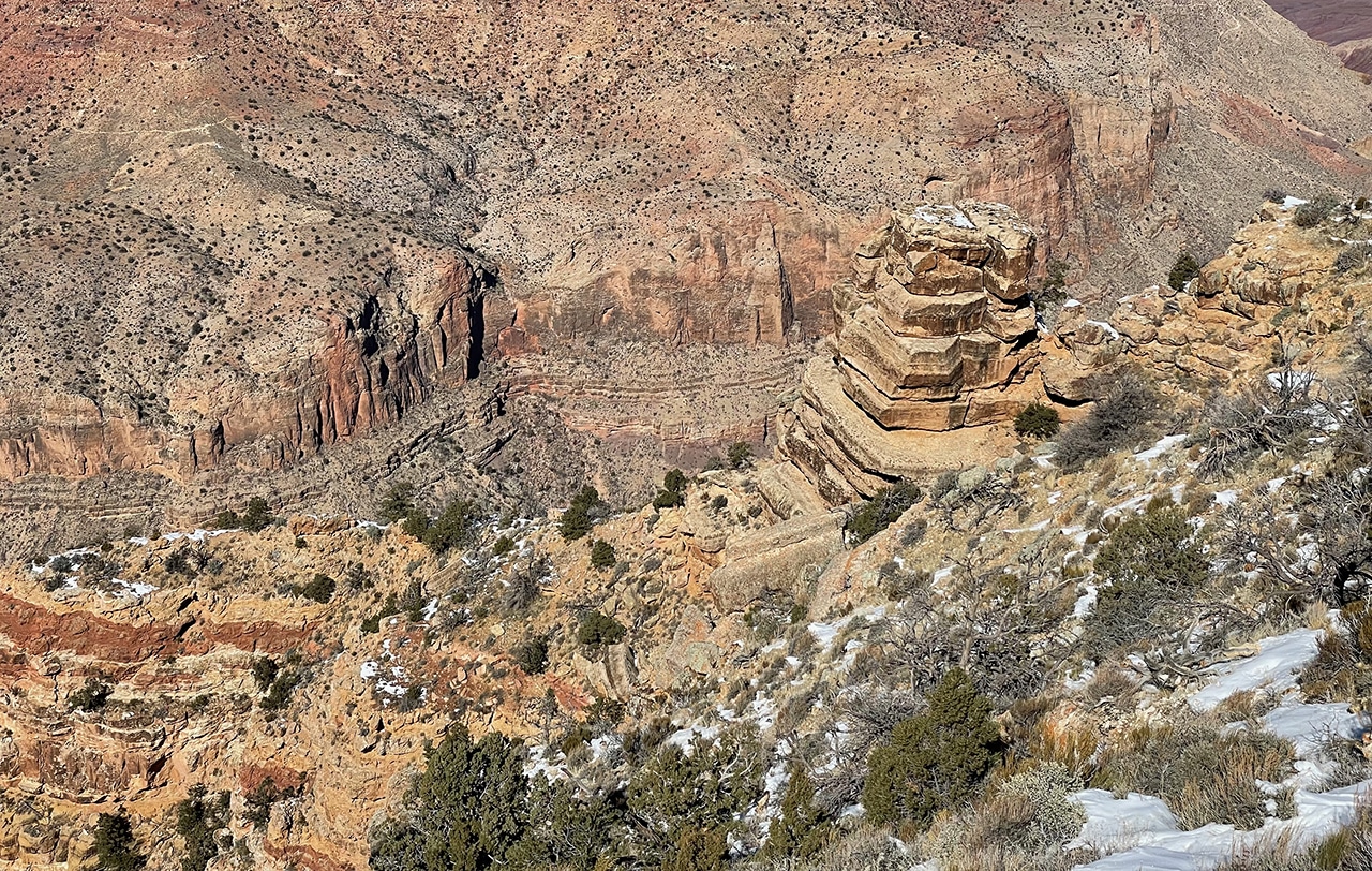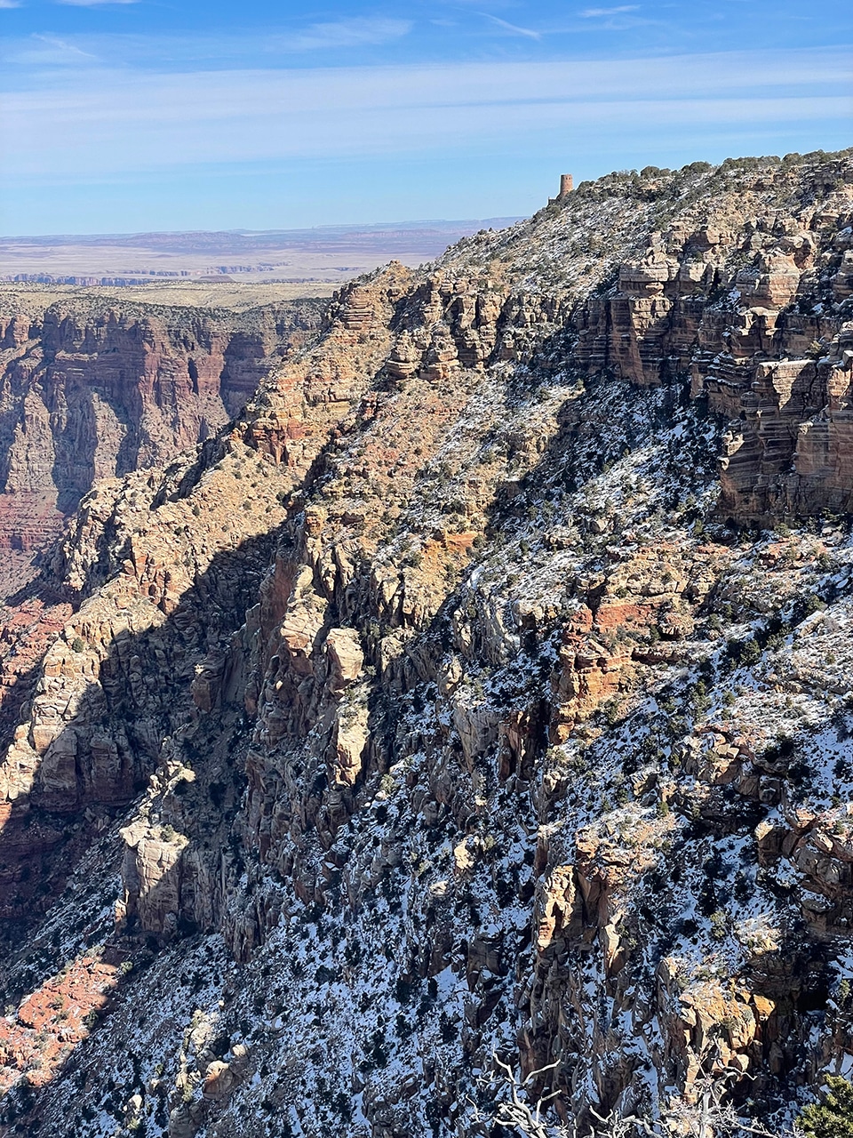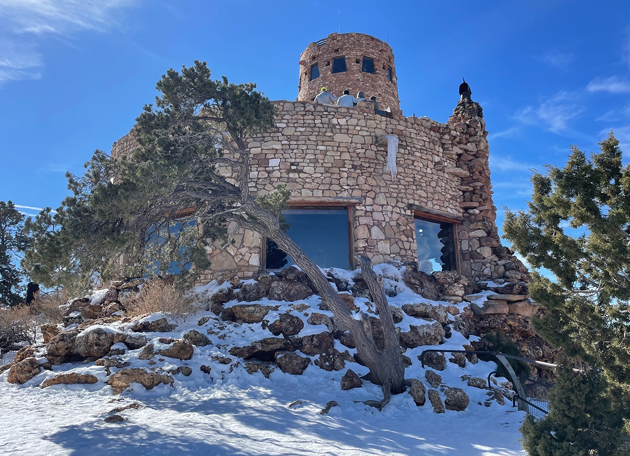 The first two photos below show the view of the Painted Desert standing outside the Watchtower facing east. Views are magnificent even from the ground, but get up in that 70-foot-high stone building and you’ll be at the highest point on the South Rim. To be honest, I thought there would be more snow in mid-February, but the dusting that remained was still pretty cool.