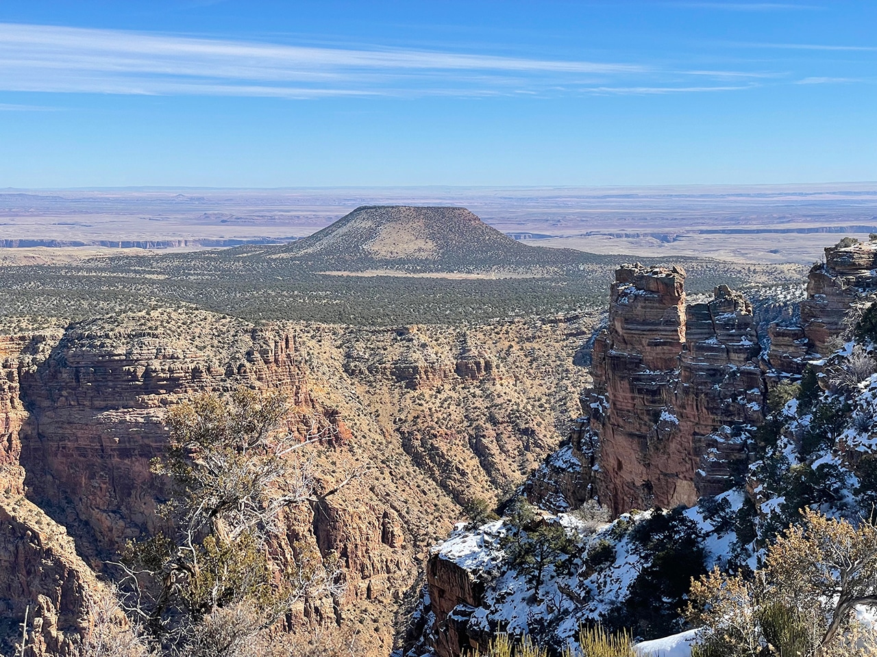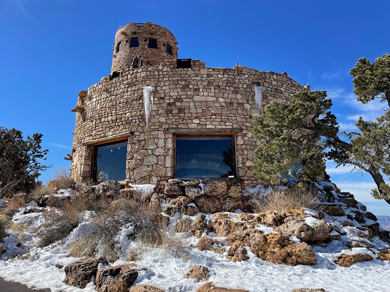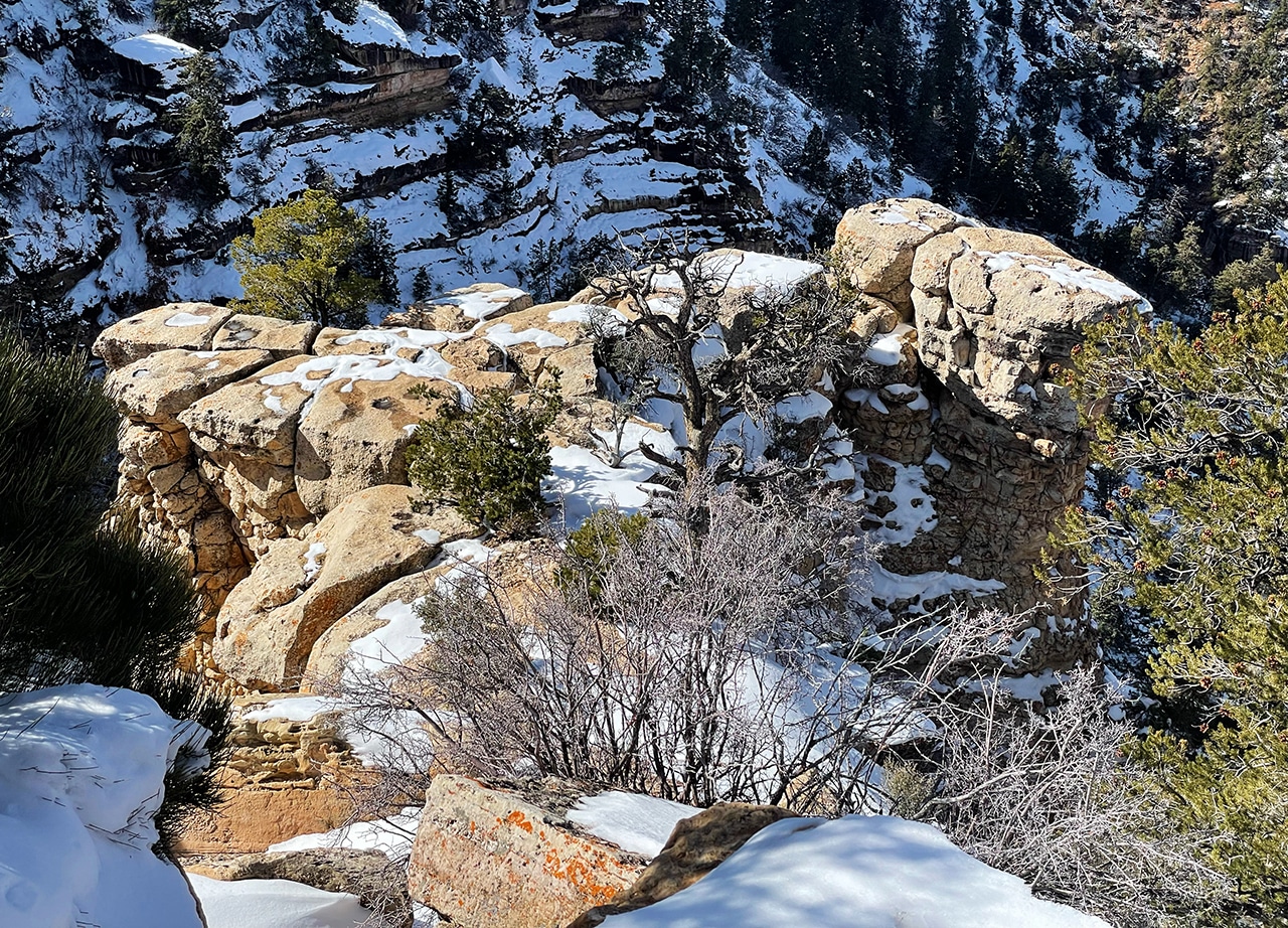 The first two photos below show the view of the Painted Desert standing outside the Watchtower facing east. Views are magnificent even from the ground, but get up in that 70-foot-high stone building and you’ll be at the highest point on the South Rim. To be honest, I thought there would be more snow in mid-February, but the dusting that remained was still pretty cool.