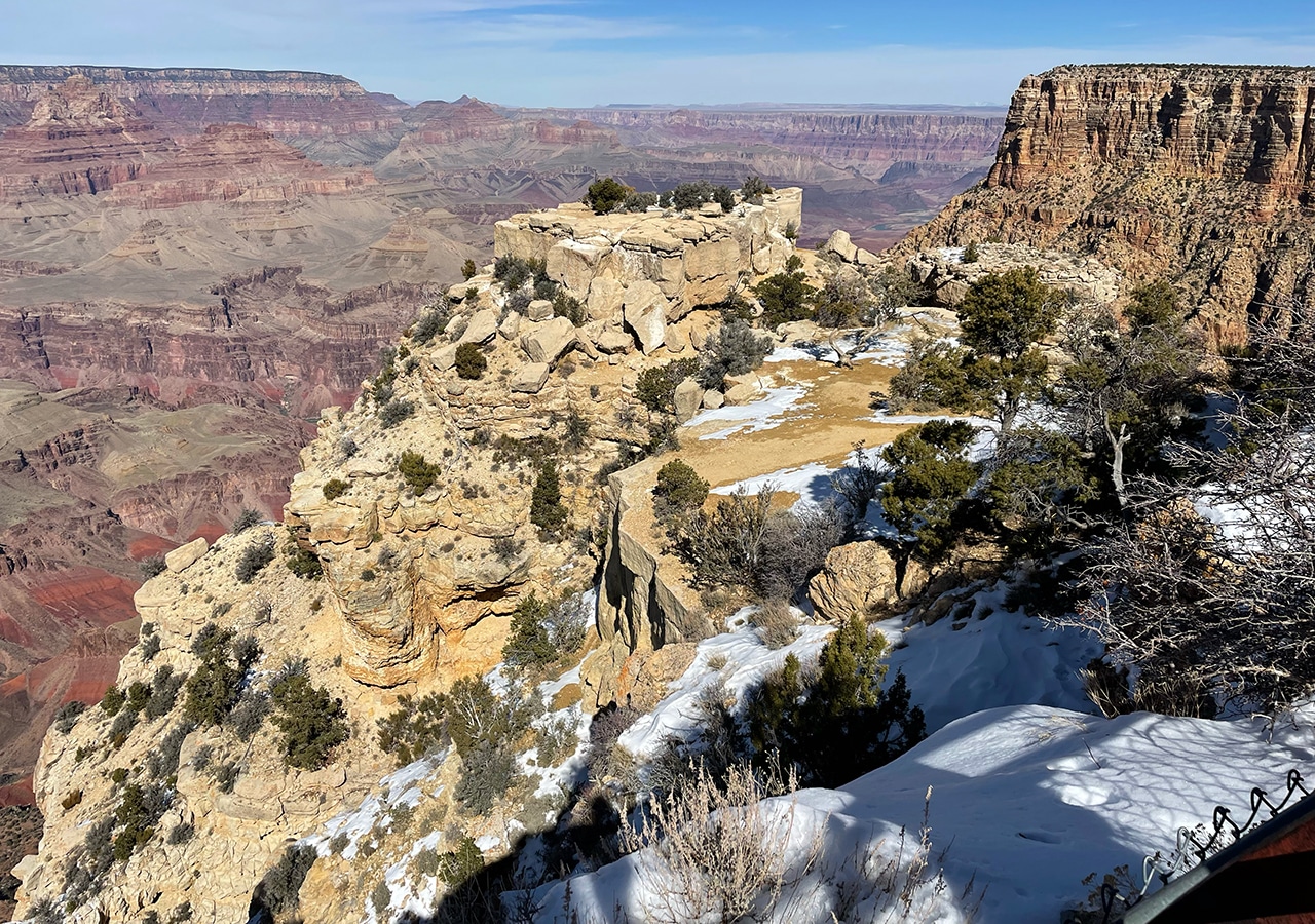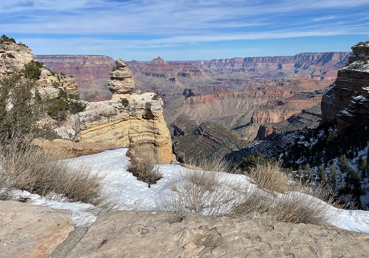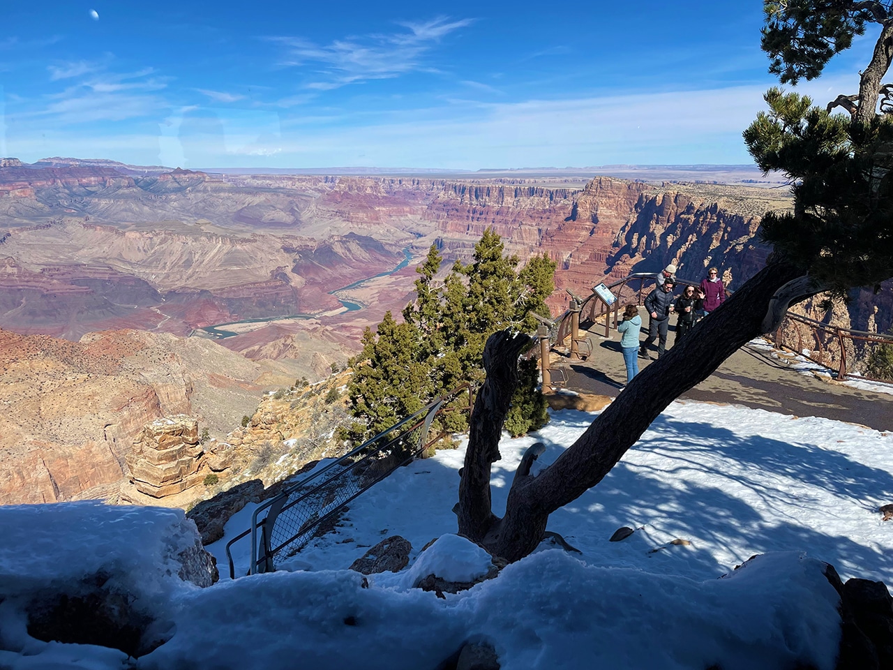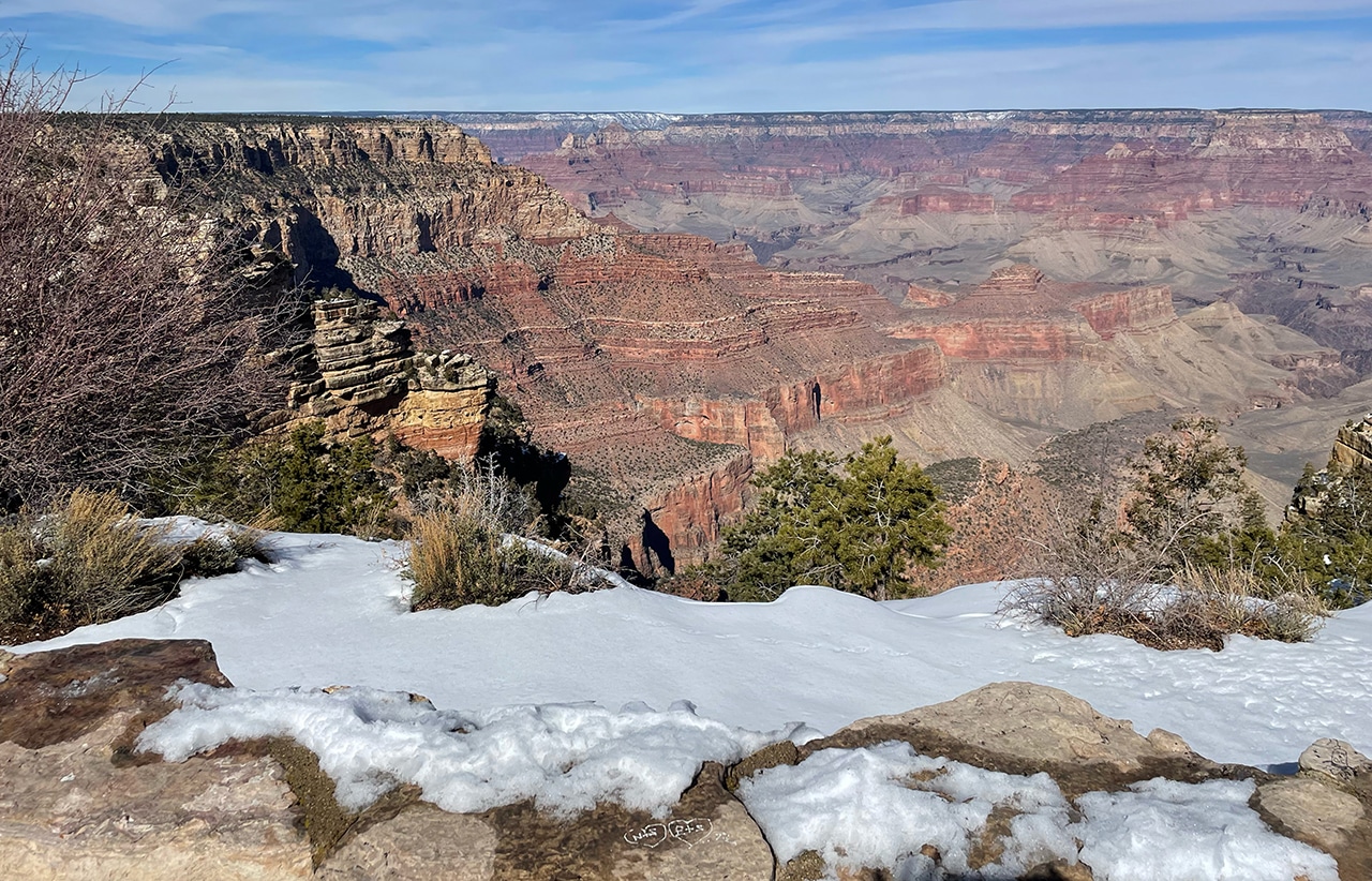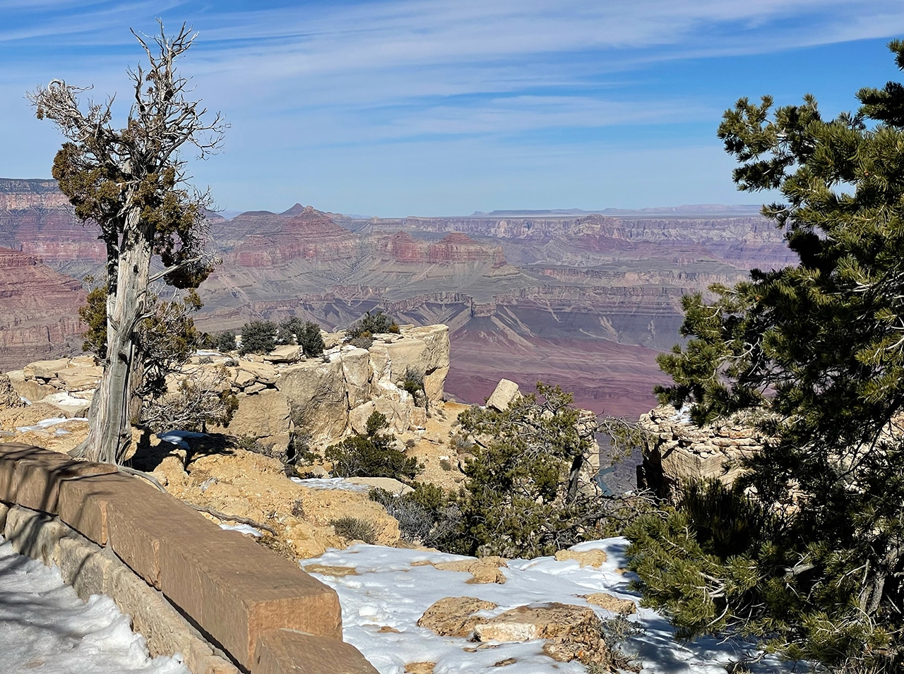 Gazing out into the Grand Canyon with mid-February’s brisk winds was not ideal, but the sun shined brightly and traces of snow were beautiful on the red rock. Since we were only two hours from the Canyon in Sedona, a day trip worked well, especially when we found out that several of the viewpoints were closed.
