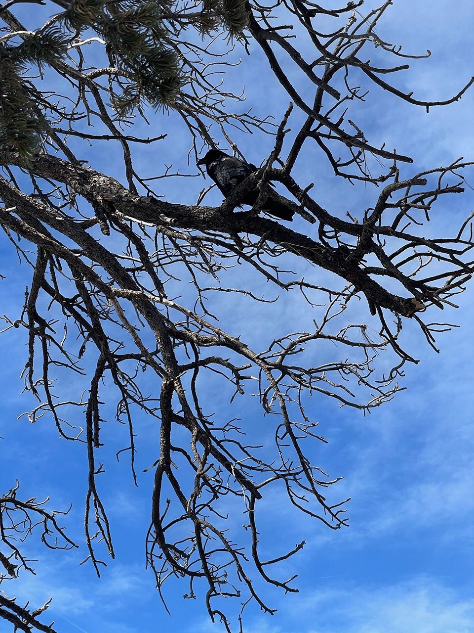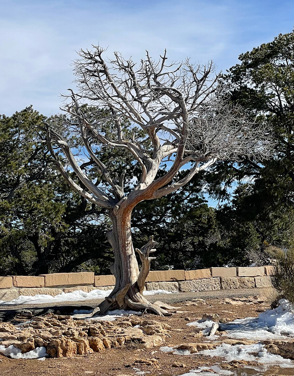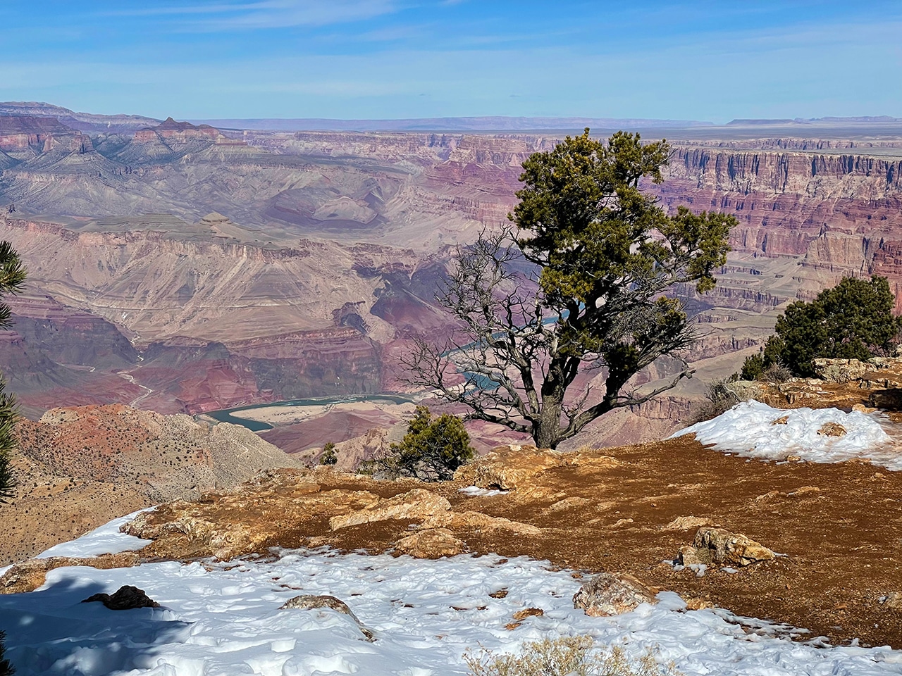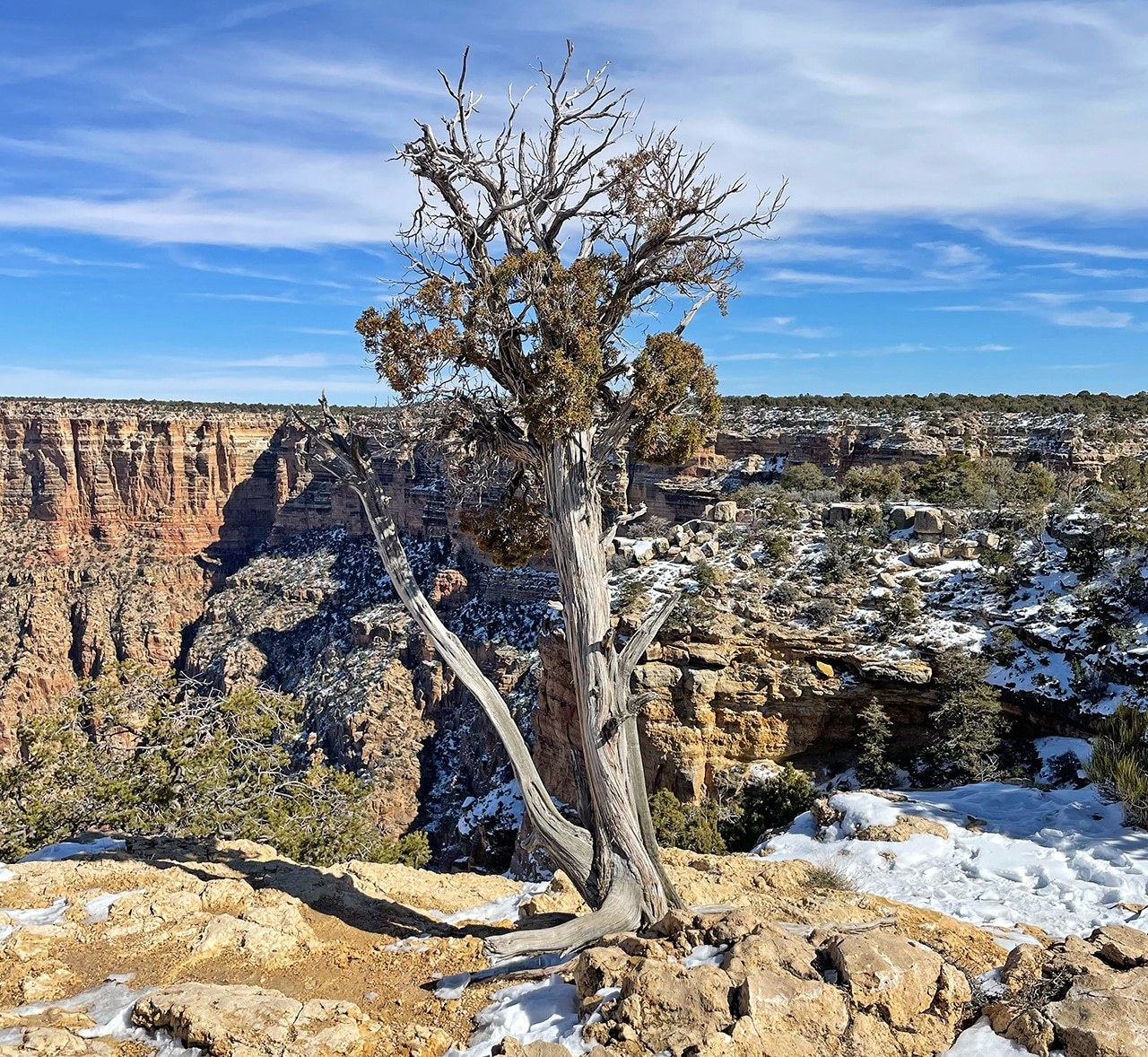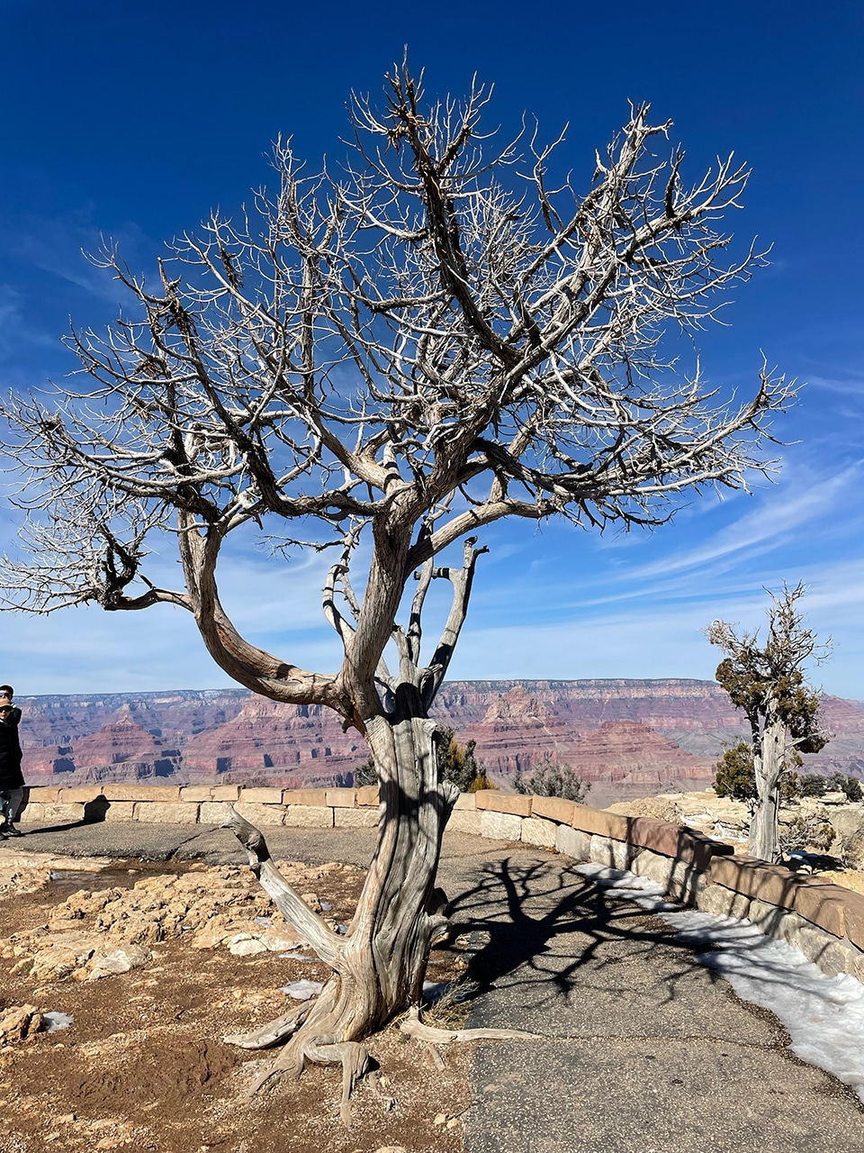 As we work our way to the Visitor Center, the views continue. The trees are gnarly and mostly bare, a raven was on the lookout for some lunch, and the grandness of this Grand Canyon amazed us once again.