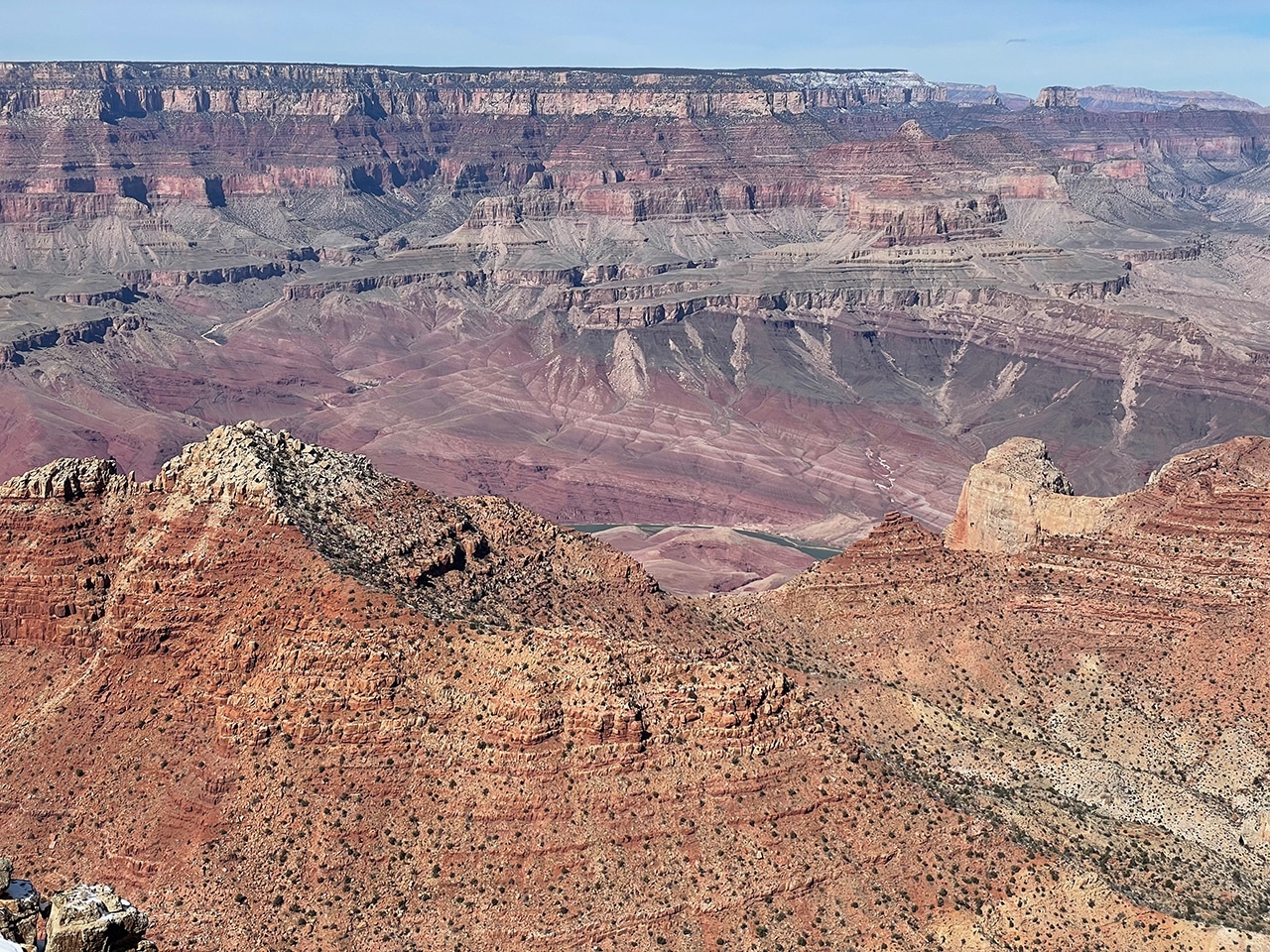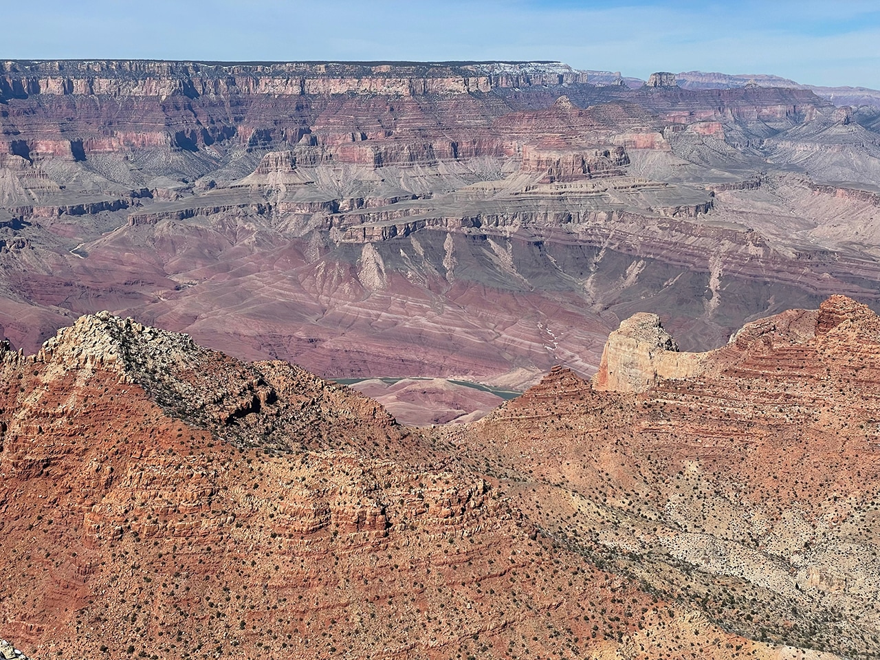 The free shuttle buses from the Visitor Center don’t go out as far as the Watchtower, but it’s worth the drive to see it and the four additional lookout points along Desert View Drive. At every lookout the vastness of the canyon is breathtaking, and at the more easterly lookouts we have a bird’s eye view of the Colorado River on its journey southwest. The first photo below shows where we’ve been, with the Watchtower off in the distance.