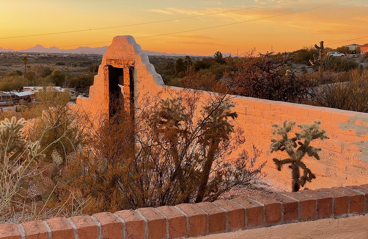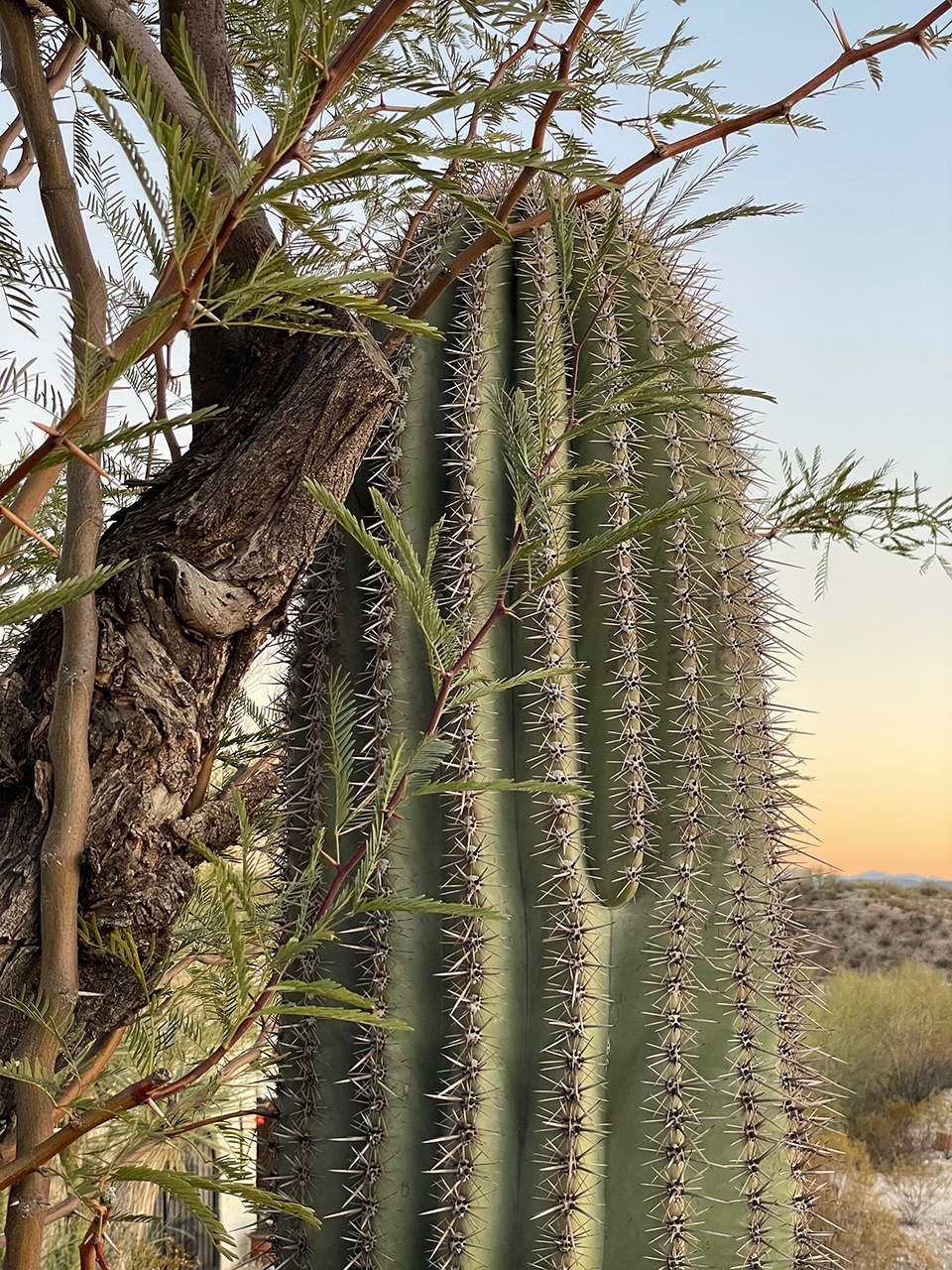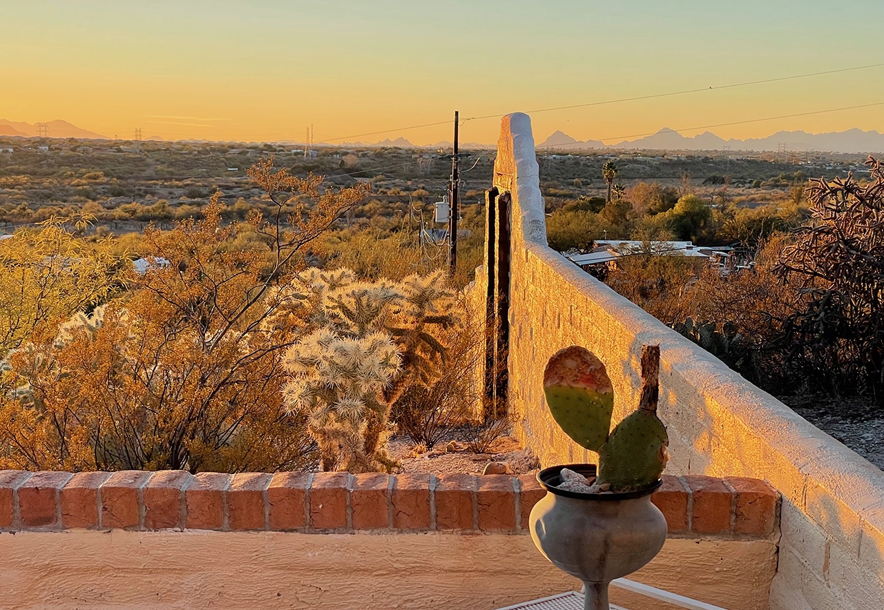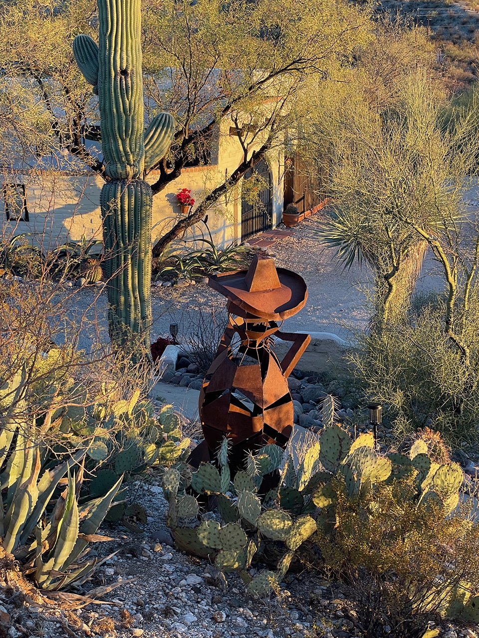 This is a wonderful setting to listen to the music of nature. One morning my Merlin app identified seven birds, including this Gambel’s Quail who was just sitting on the fence enjoying the morning sun – like me. Sometimes he brought his buddies and they walked in a straight line along the top, rounded edge of the adobe gate to the left.