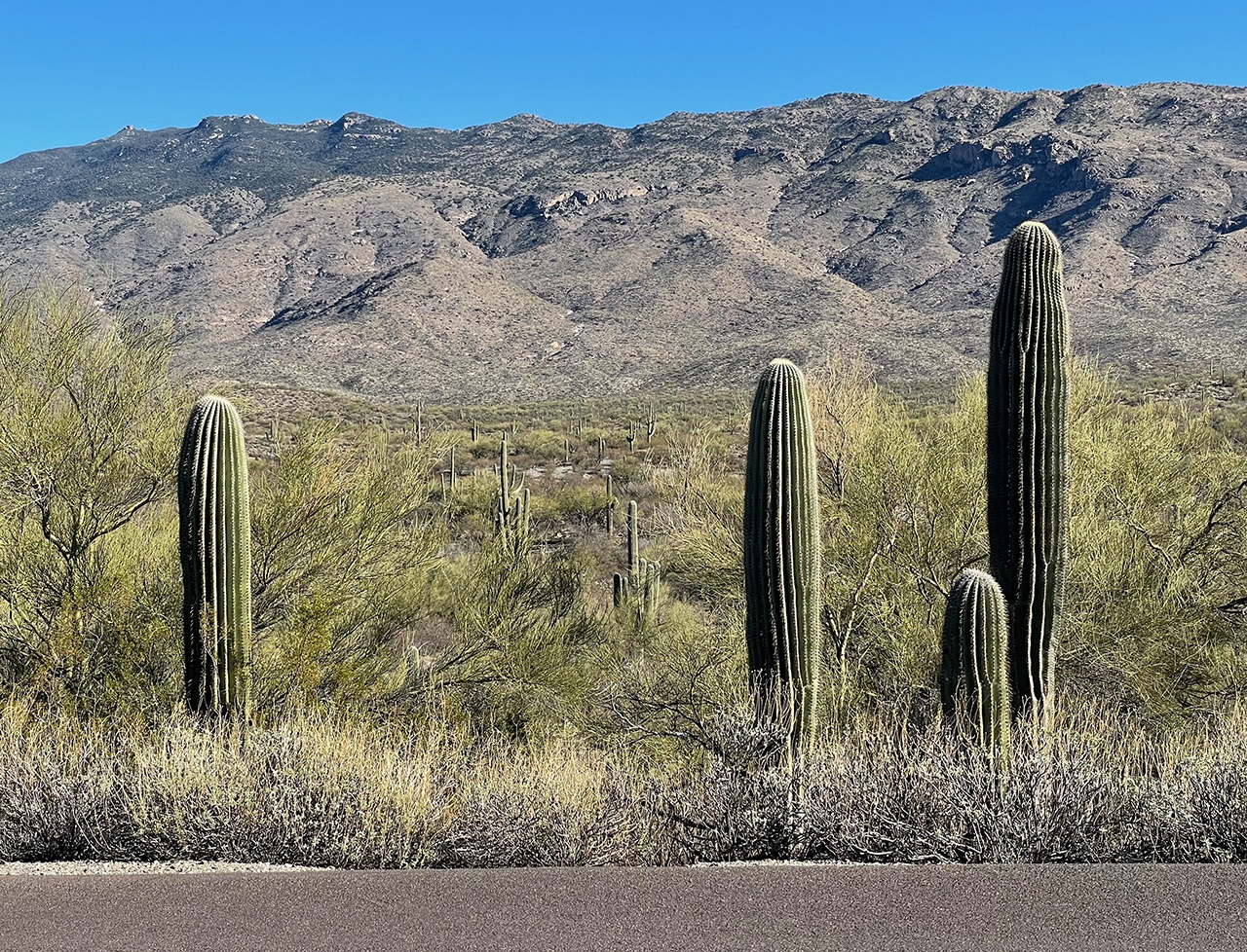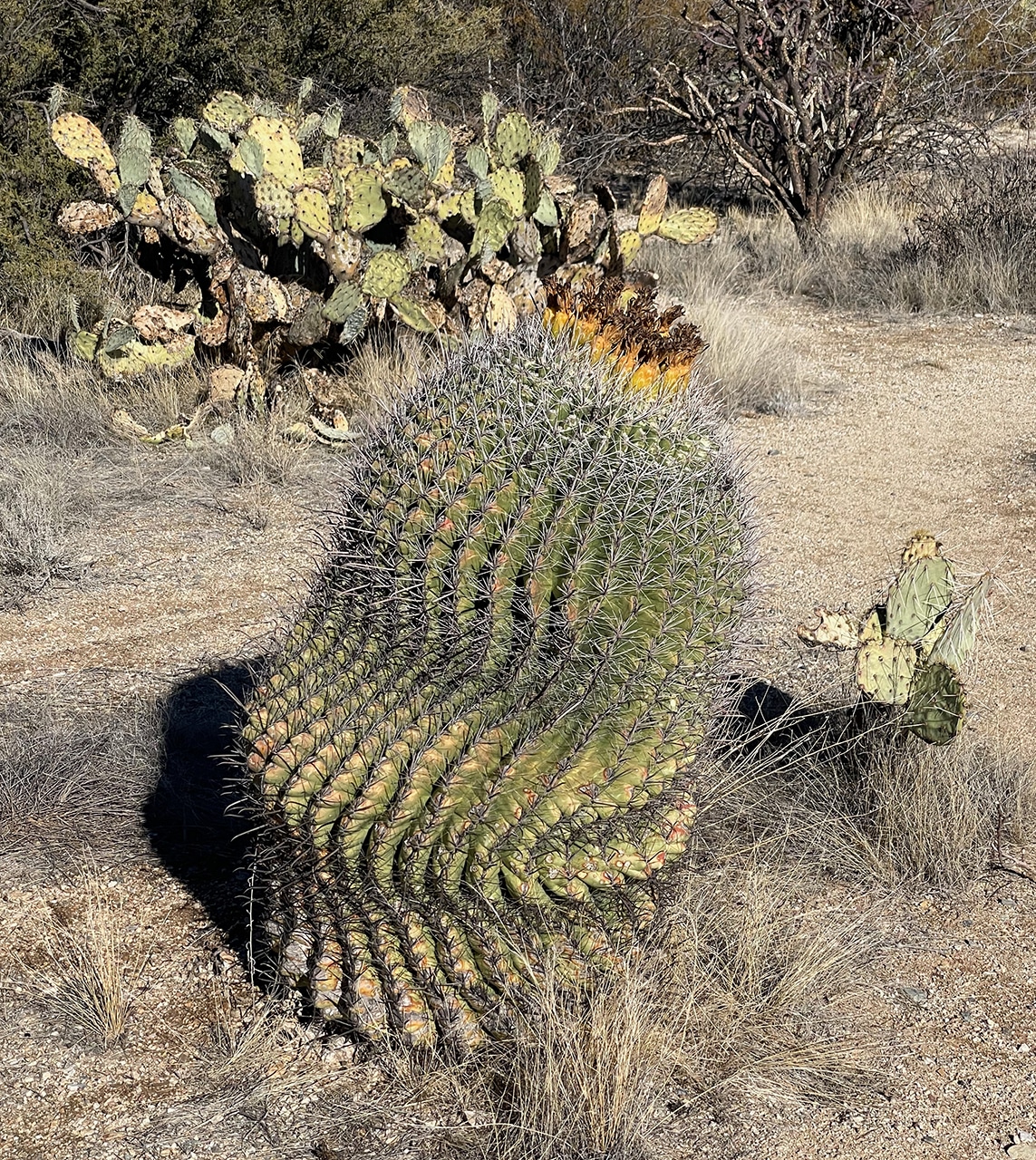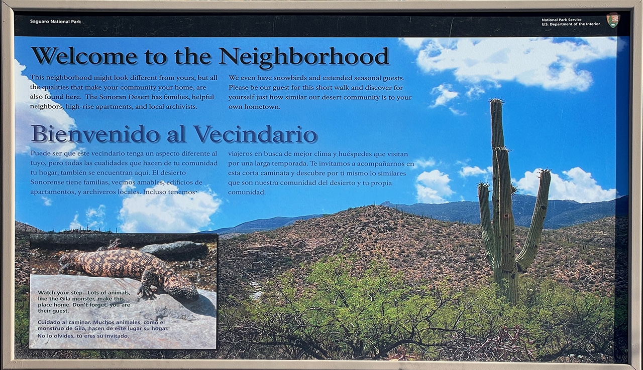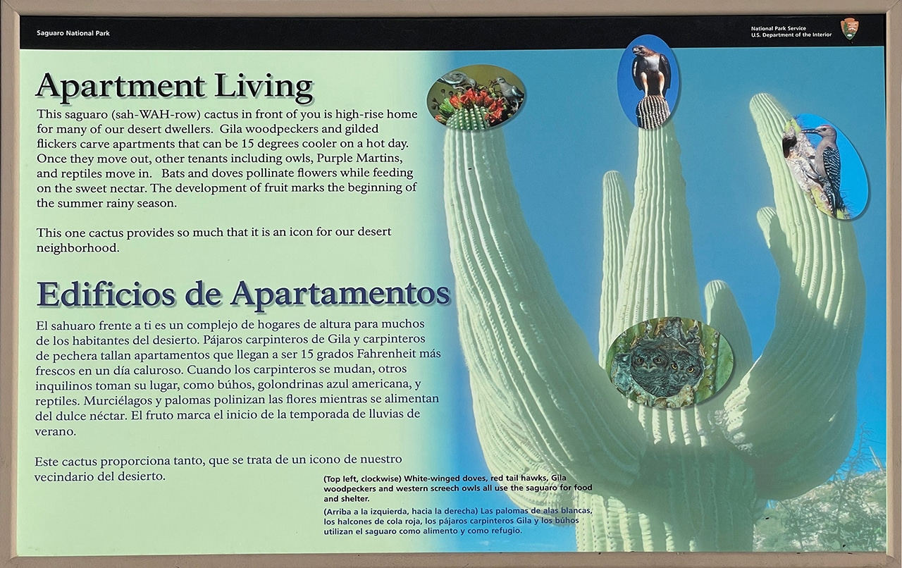 Today we revisited the Rincon Mountain District (the eastern side), since the entrance was only six minutes from home. Although the scenic loop is only eight miles long, it takes a while at 25-mph with lots of stops for views and a trail or two. We walked the Desert Ecology Trail and thoroughly enjoyed the Visitor Center which we didn’t see last time. We learned more about the cacti and the critters that inhabit this prickly place.