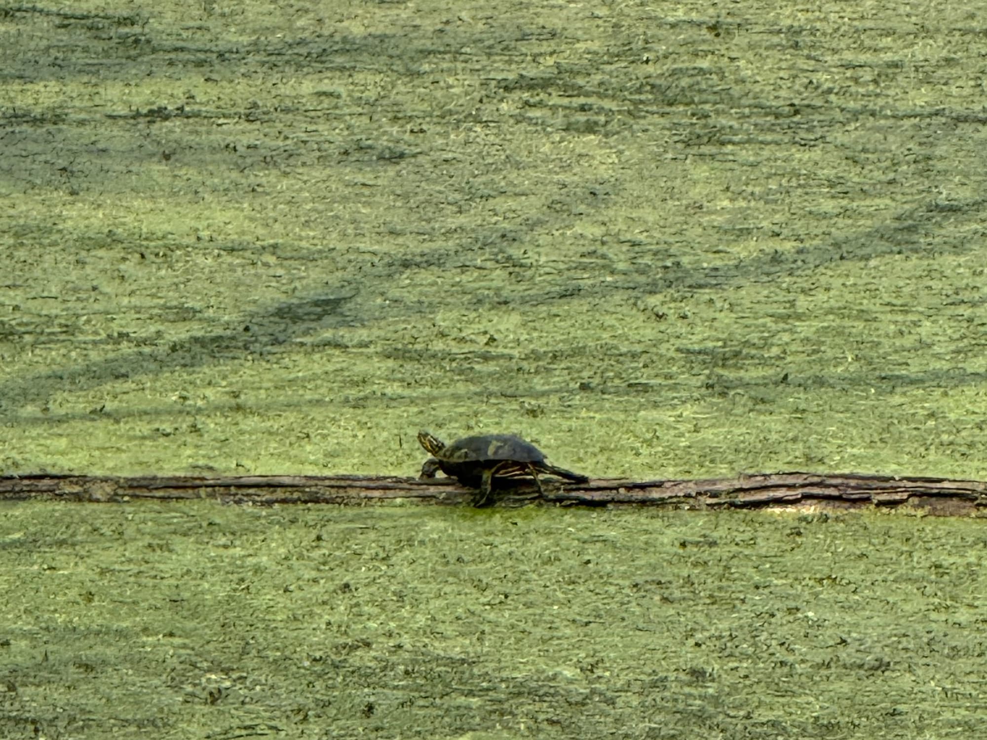 The next morning we saw three deer on the way to Trempealeau National Wildlife Refuge, but while there only the usual chippies and squirrels, and pelicans across the lily pads entertained us. The last photo isn’t very good, but it shows another area with a pond’s more crusty green layer. The turtle was resting on a log that was way long enough for a few more of his buddies to join in a turtle stack, but he was sunning solo today.