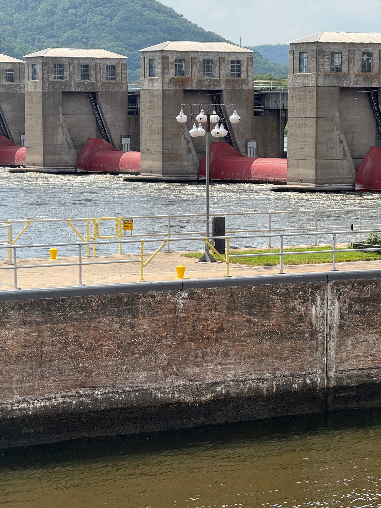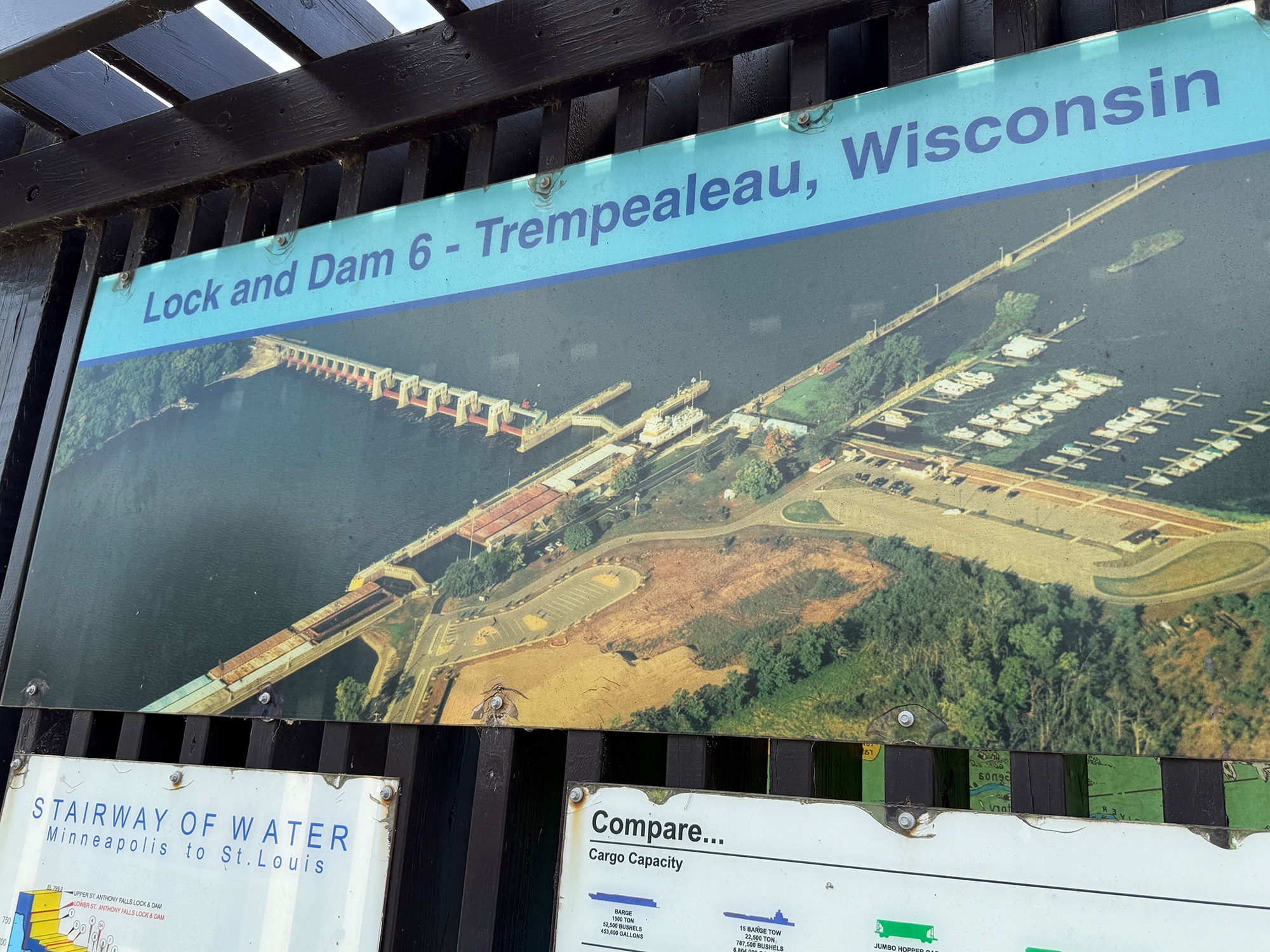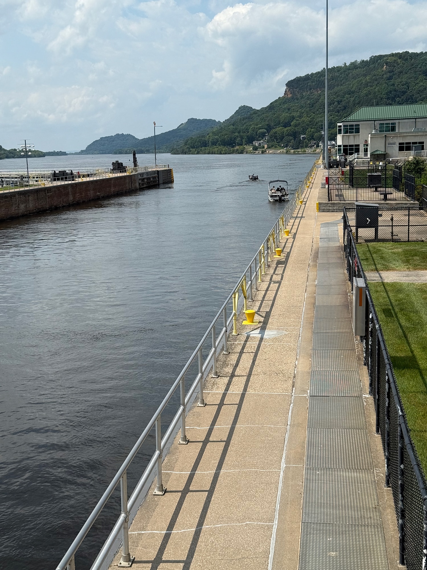 We’ve been checking out Lock and Dam #6 from our motel, but today we’ll see it up close! A covered area provided an elevated view of just what was going on. Hoping to see a huge barge come through, we had to settle for a fishing boat and a pontoon. It was still pretty interesting to be this close and read more information about what a vital role locks play in keeping the water level at a safe depth for barges to safely pass through.