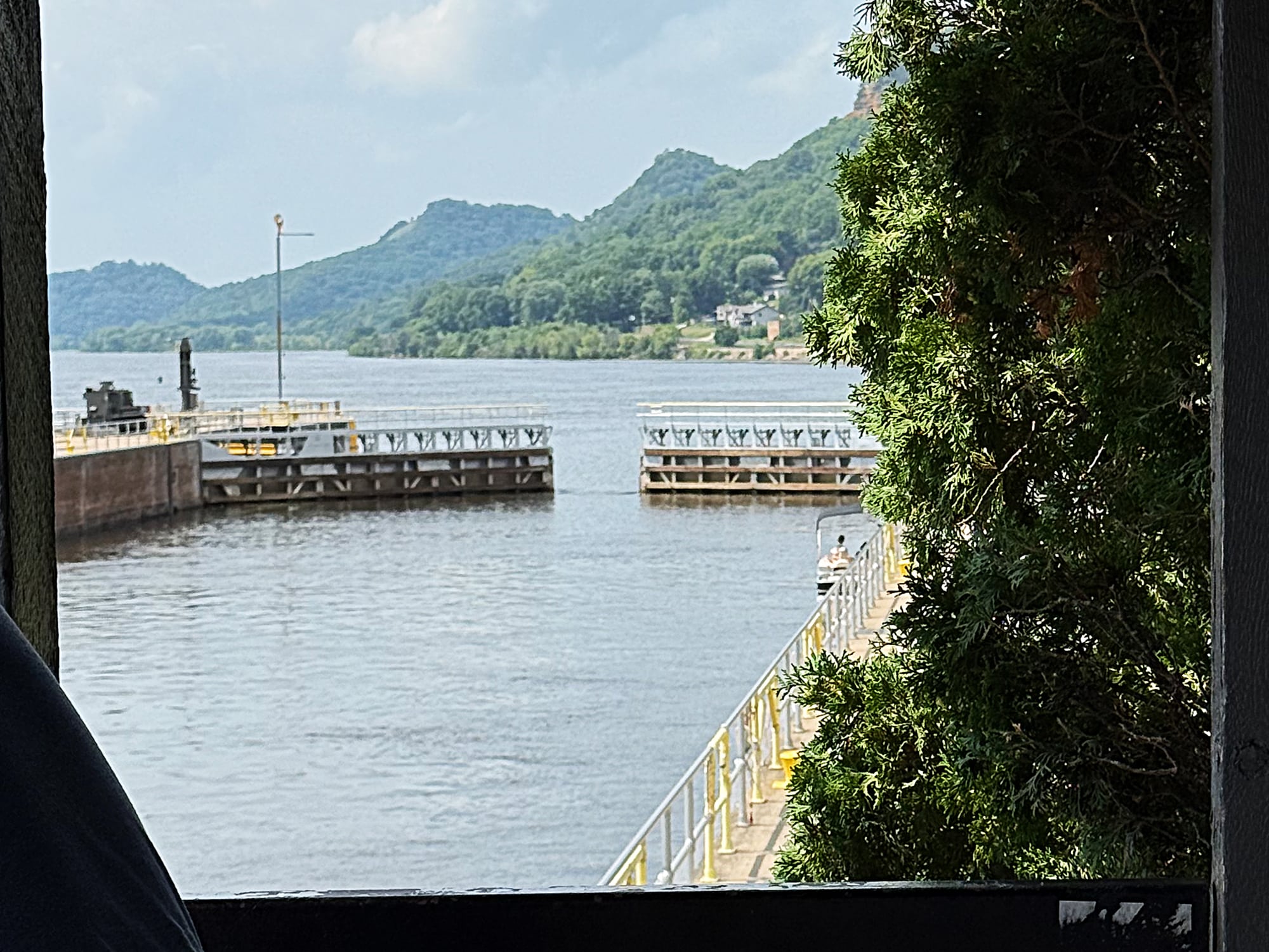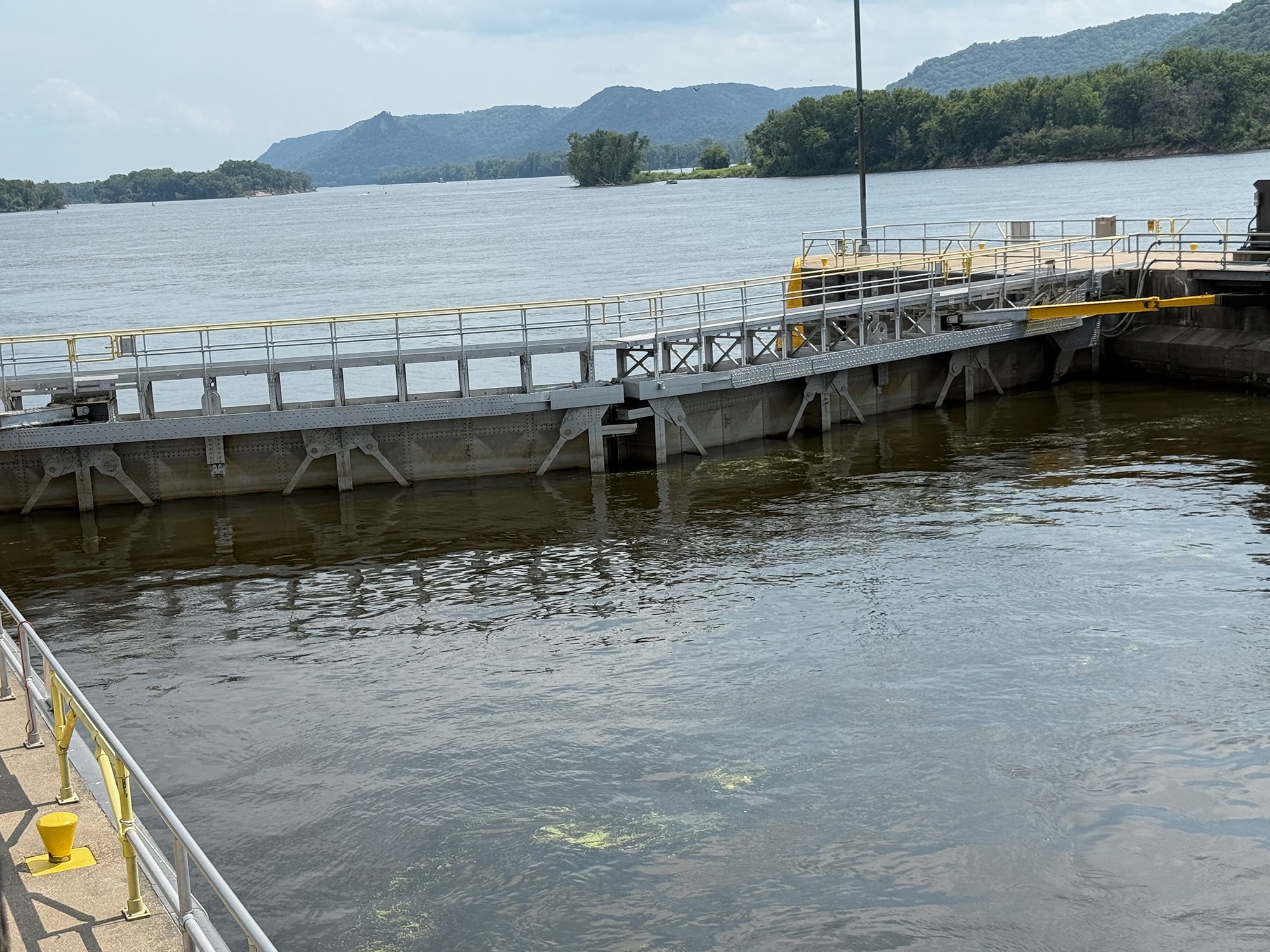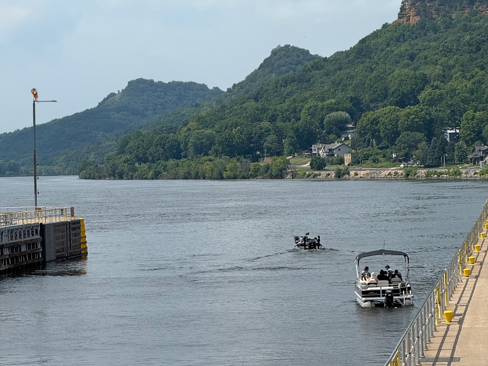 We’ve been checking out Lock and Dam #6 from our motel, but today we’ll see it up close! A covered area provided an elevated view of just what was going on. Hoping to see a huge barge come through, we had to settle for a fishing boat and a pontoon. It was still pretty interesting to be this close and read more information about what a vital role locks play in keeping the water level at a safe depth for barges to safely pass through.