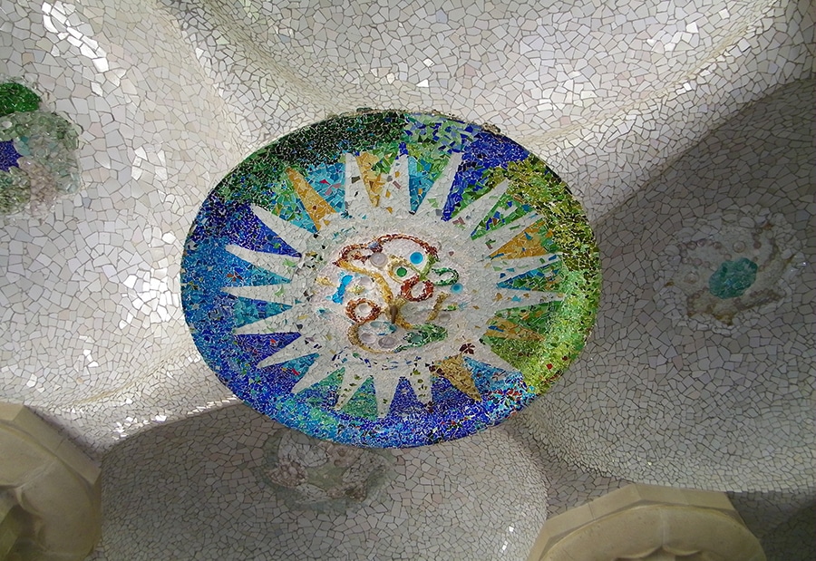 Those beautiful columns support the terrace above. All along the terrace is a long bench in the form of a sea serpent. The curves of the serpent bench help to provide more intimate seating as well as a railing system to keep you on the roof and not off the edge. Gaudí included many elements from Catalan religious mysticism and ancient poetry into the mosaics of the Park. It was fantastic!