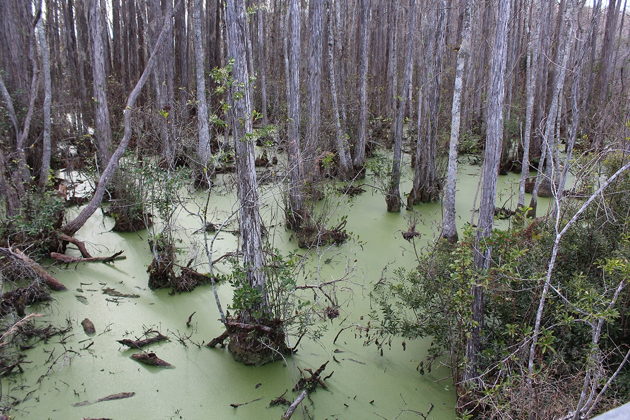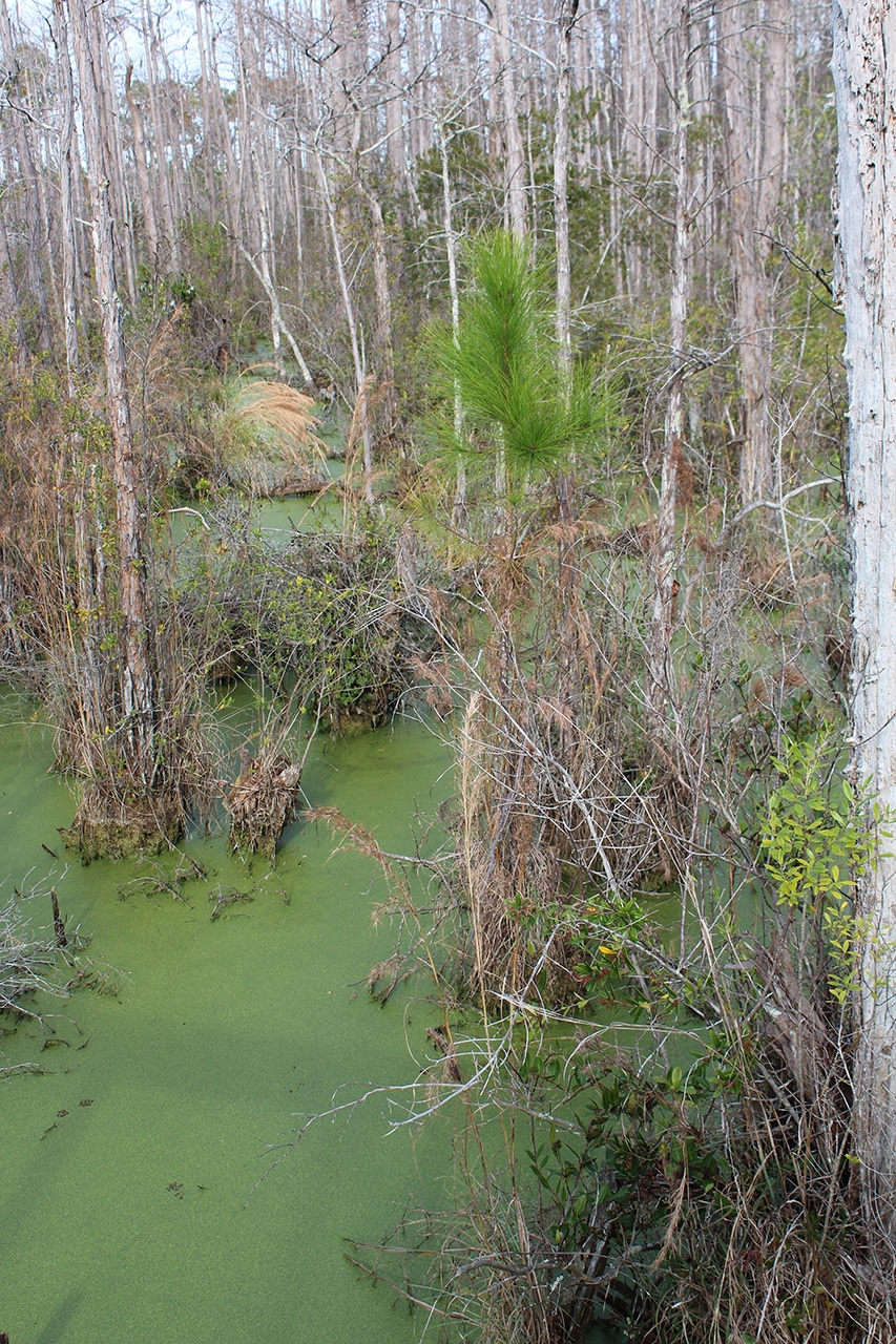 Adding to the interest of this place was over a mile of boardwalks that spanned the swampland. On the park’s website there were comments about all the wildlife and birds that could be seen from these fabulous boardwalks, but we were not that lucky. I stared over the bridges in search of some sign of life, but instead I noticed a solid surface of green. If anything had been in that muck recently, there surely would have been tracks on the surface or a break in the green.