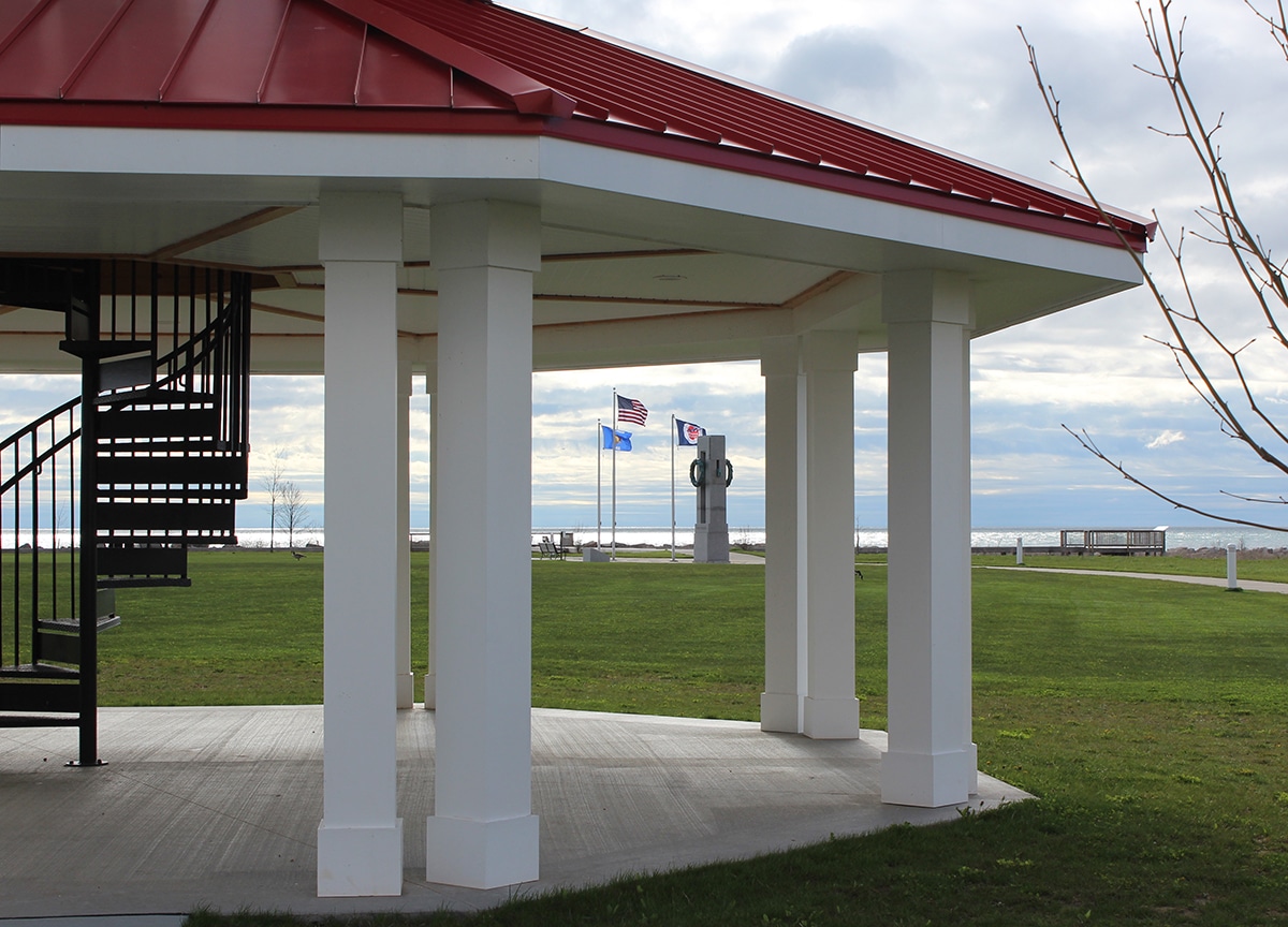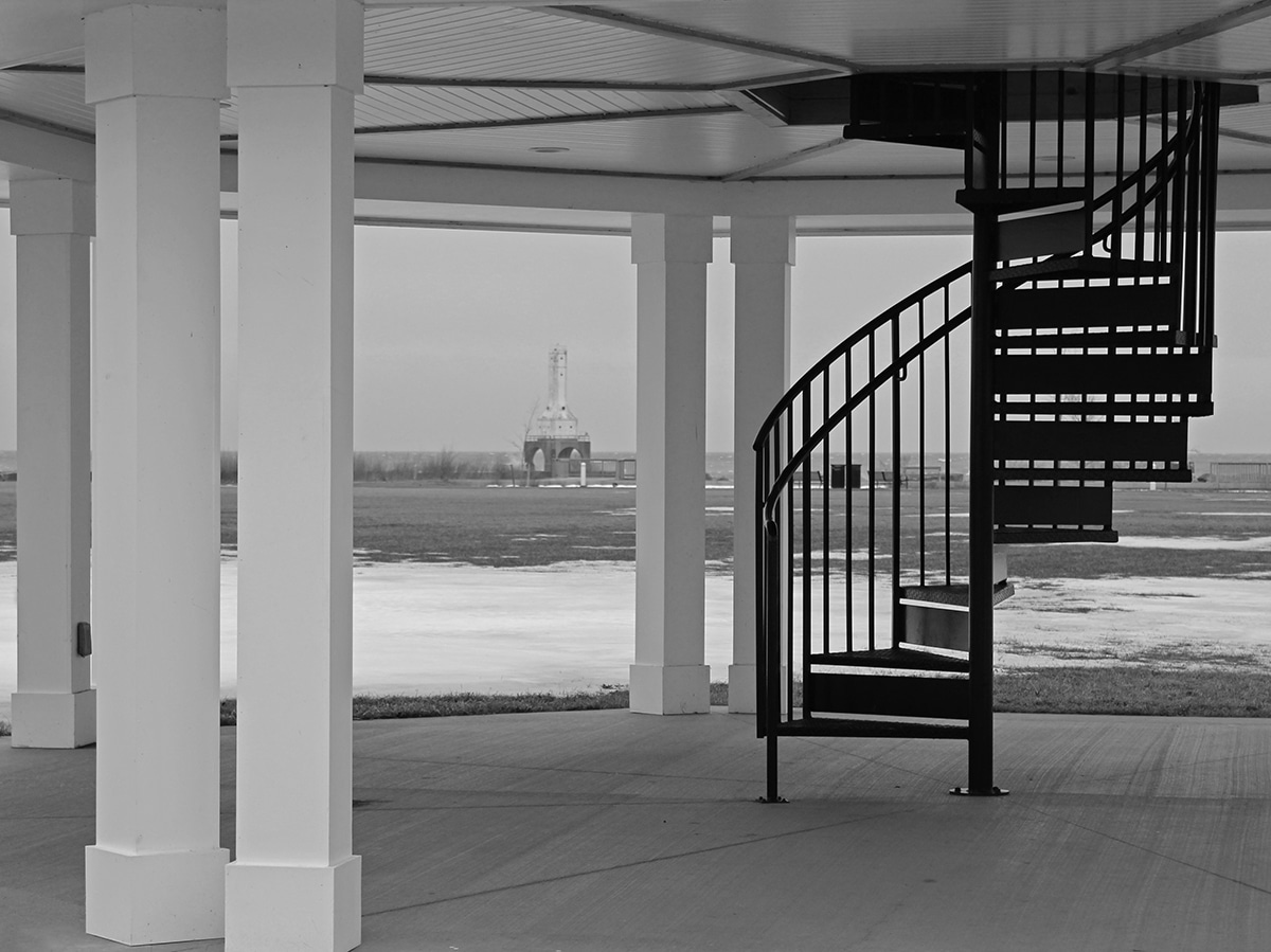 I started my visit today at Coal Dock Park, a recent addition to the city when the coal-burning power plant was replaced by natural gas in 2004. Since there was no need for a big pile of coal at the ready, the city developed an absolutely beautiful green space where you can cop a squat and enjoy the views. I am particularly enamored by this red-roofed gazebo with the spiral staircase. The red really pops in today’s somewhat gloomy photos and at every angle, Port Washington’s iconic structures can be viewed through its fabulous columns. Check out an article in the Journal Sentinel when Coal Dock Park was about to open.